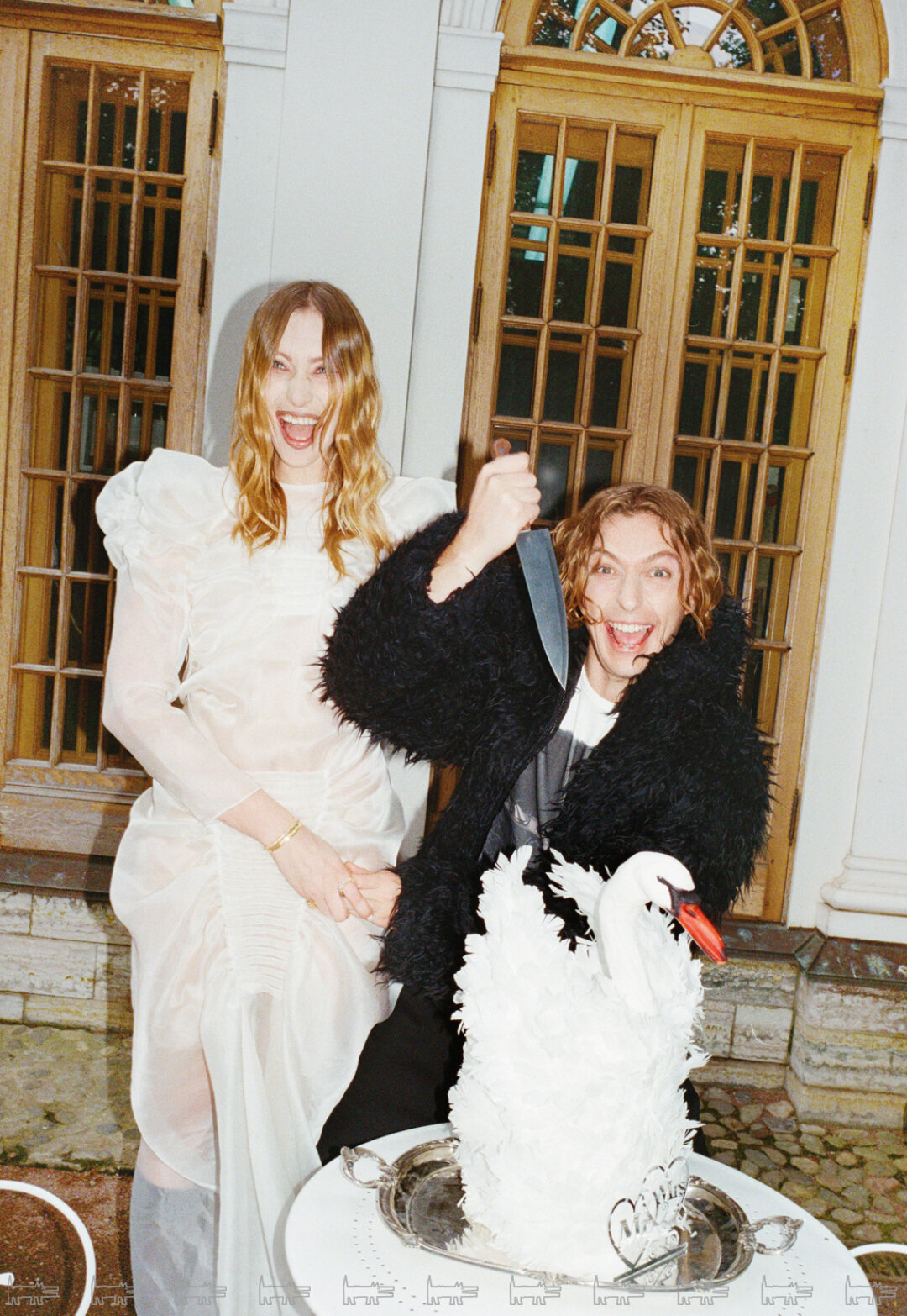 Ребята вывели авангард и антибрайд на новый уровень. Русские традиции были переосмыслены в новом прочтении: тут и подкидывание голубя, и лебеди на свадебном торте. Признаем – выглядит очень стильно!