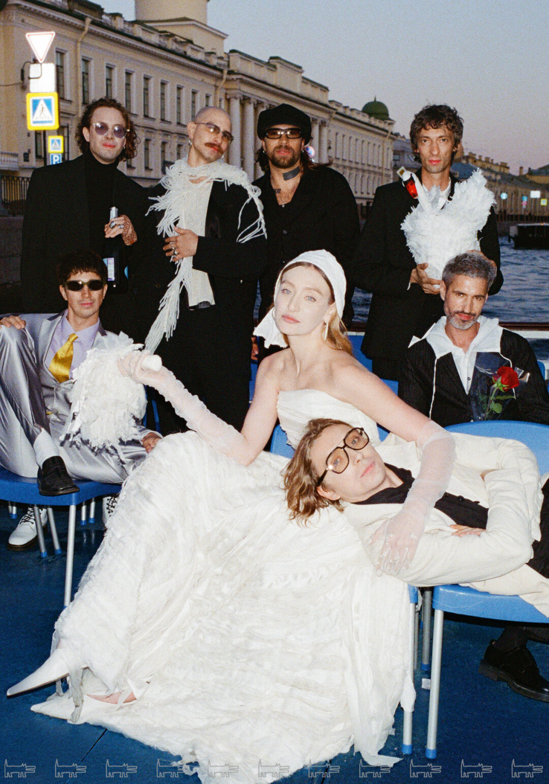Для речной прогулки на теплоходе Маша выбрала комбинезон, юбку, фату и головной убор, а Саша — костюм и лонгслив от VEREJA.