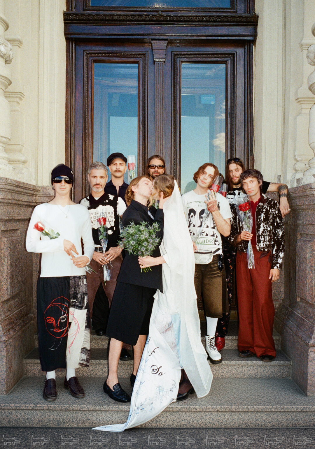 Для «росписи» в ЗАГСе невестой был выбран образ от USHATAVA – футболка с обручальным кольцом и юбка. Саша был одет в пиджак USHATAVA, рубашку CASABLANCA (Spin4spin) и шорты MAISON MARGIELA. Кольца от ювелирного дома MERCURY дополнили образы.