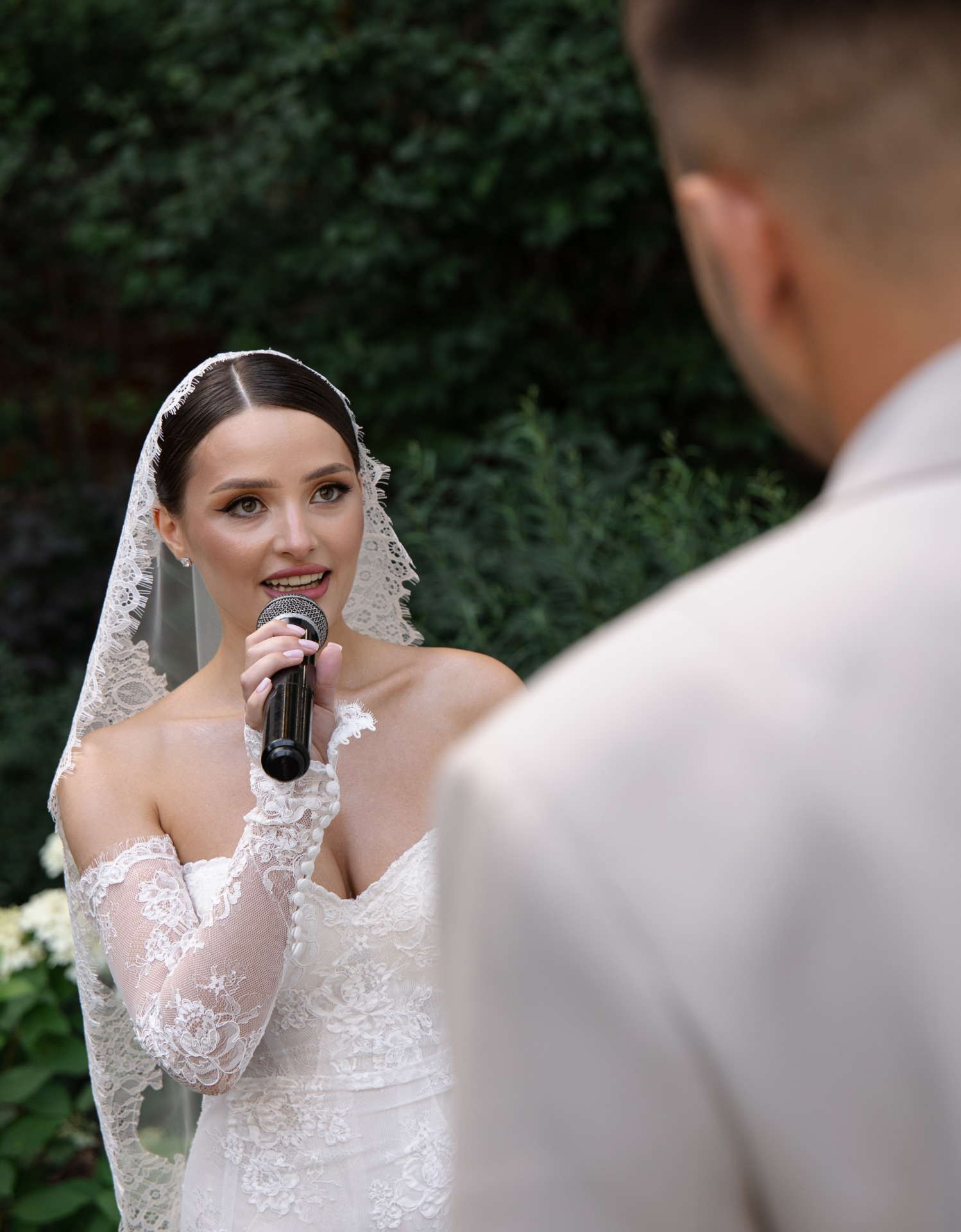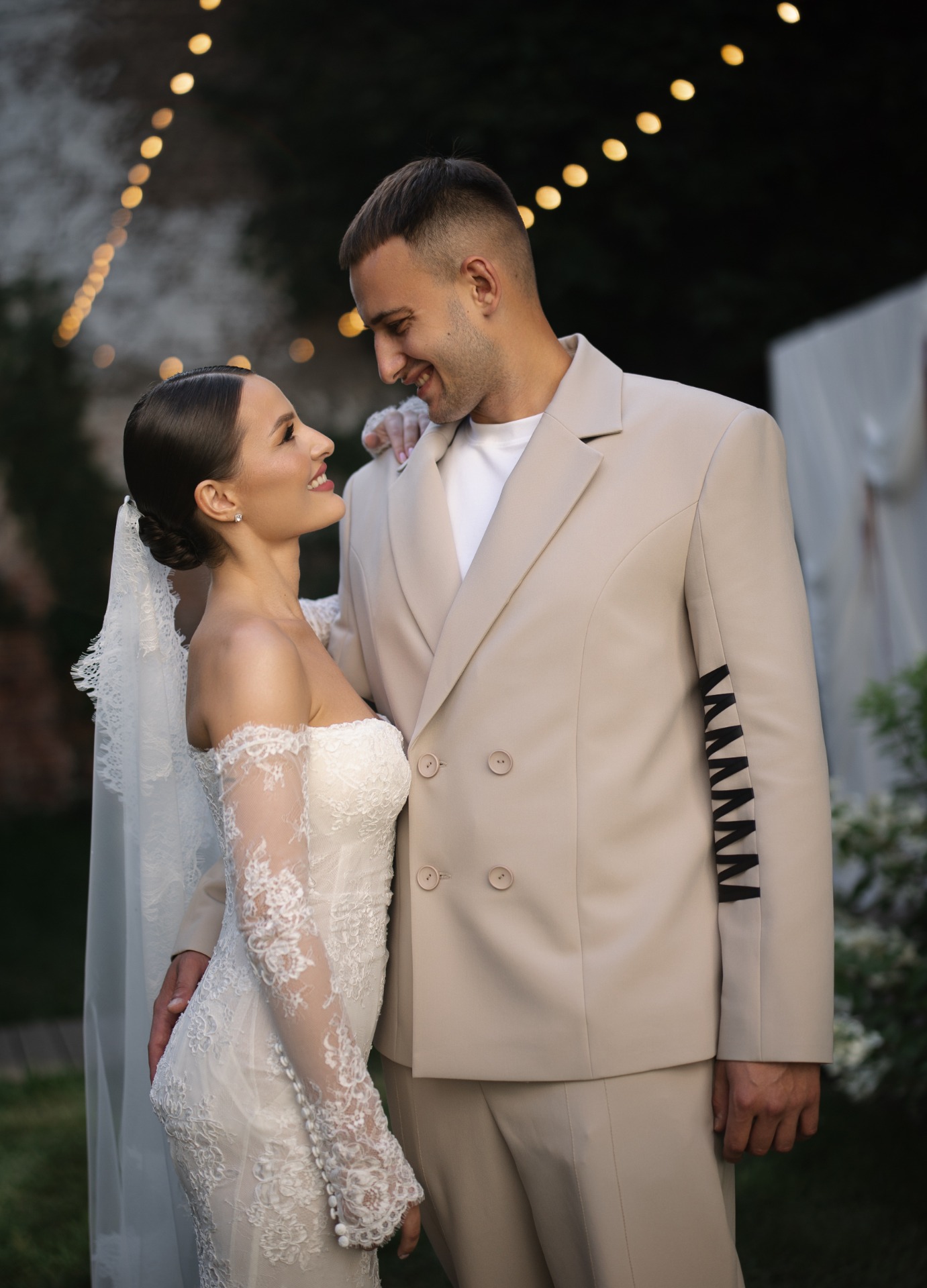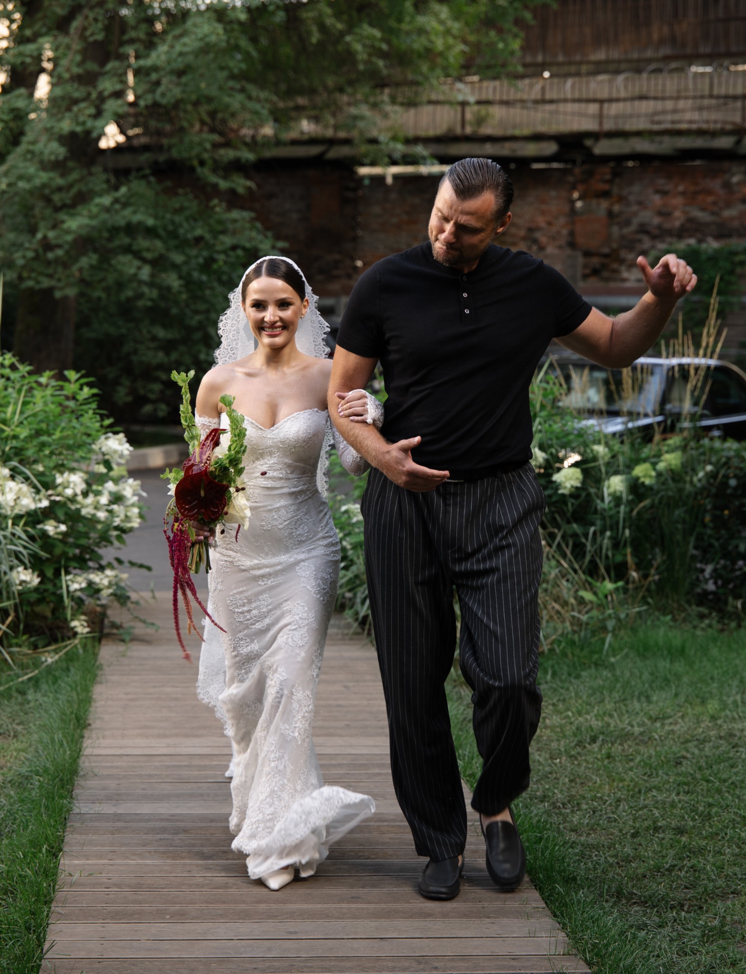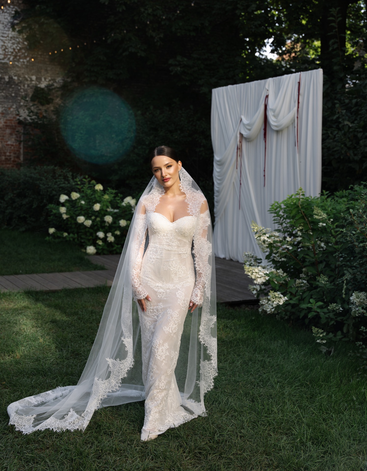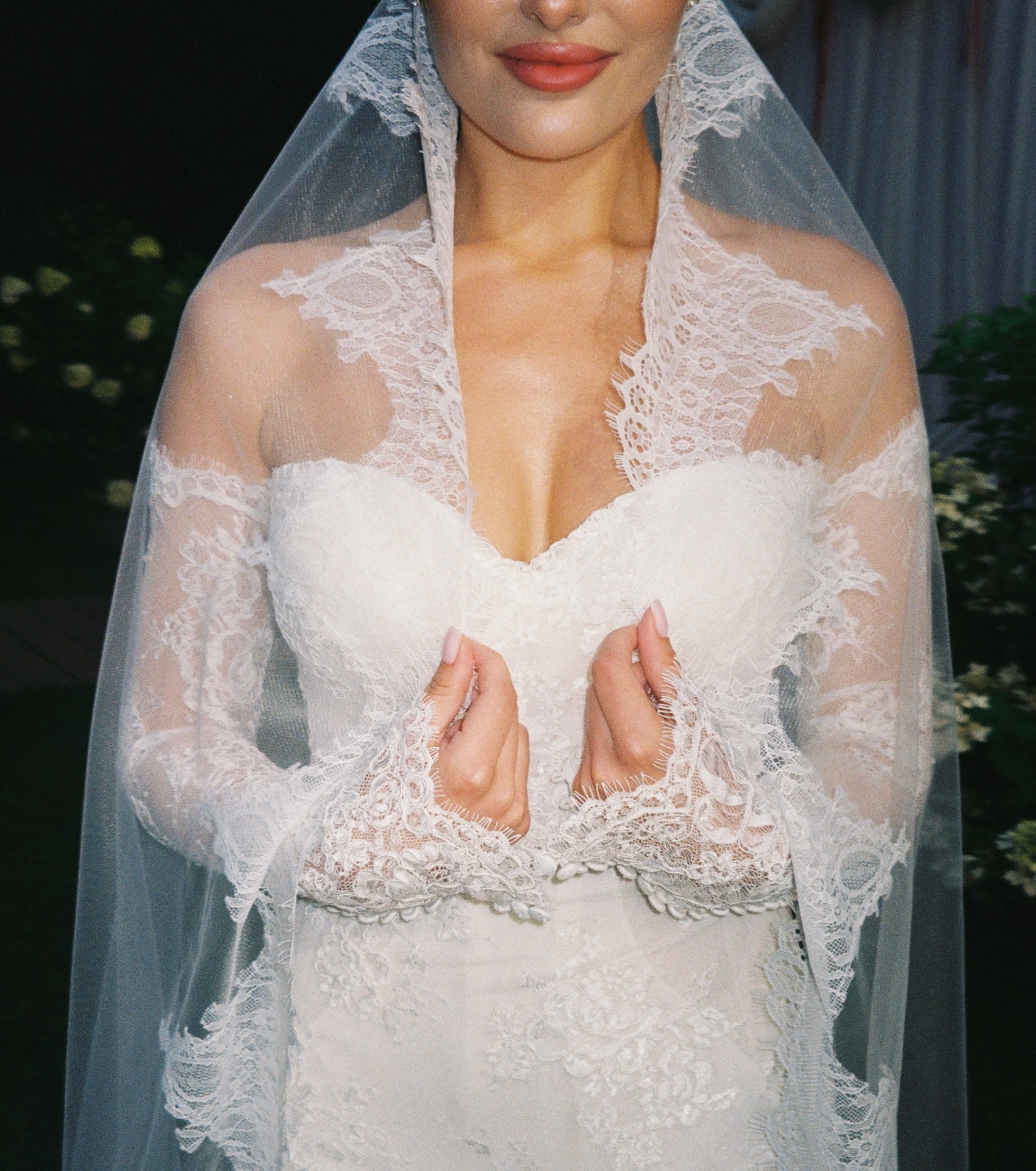 Мы вдохновлялись стилем «тихой роскоши». Моё основное платье было сшито из французского кружева Berta и полностью выполнено из прозрачных материалов. В этом образе мне хотелось подчеркнуть нежность и элегантность.