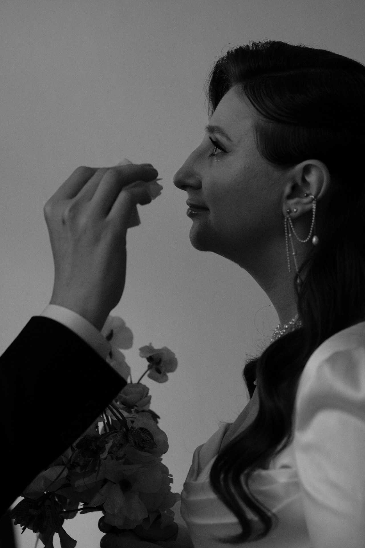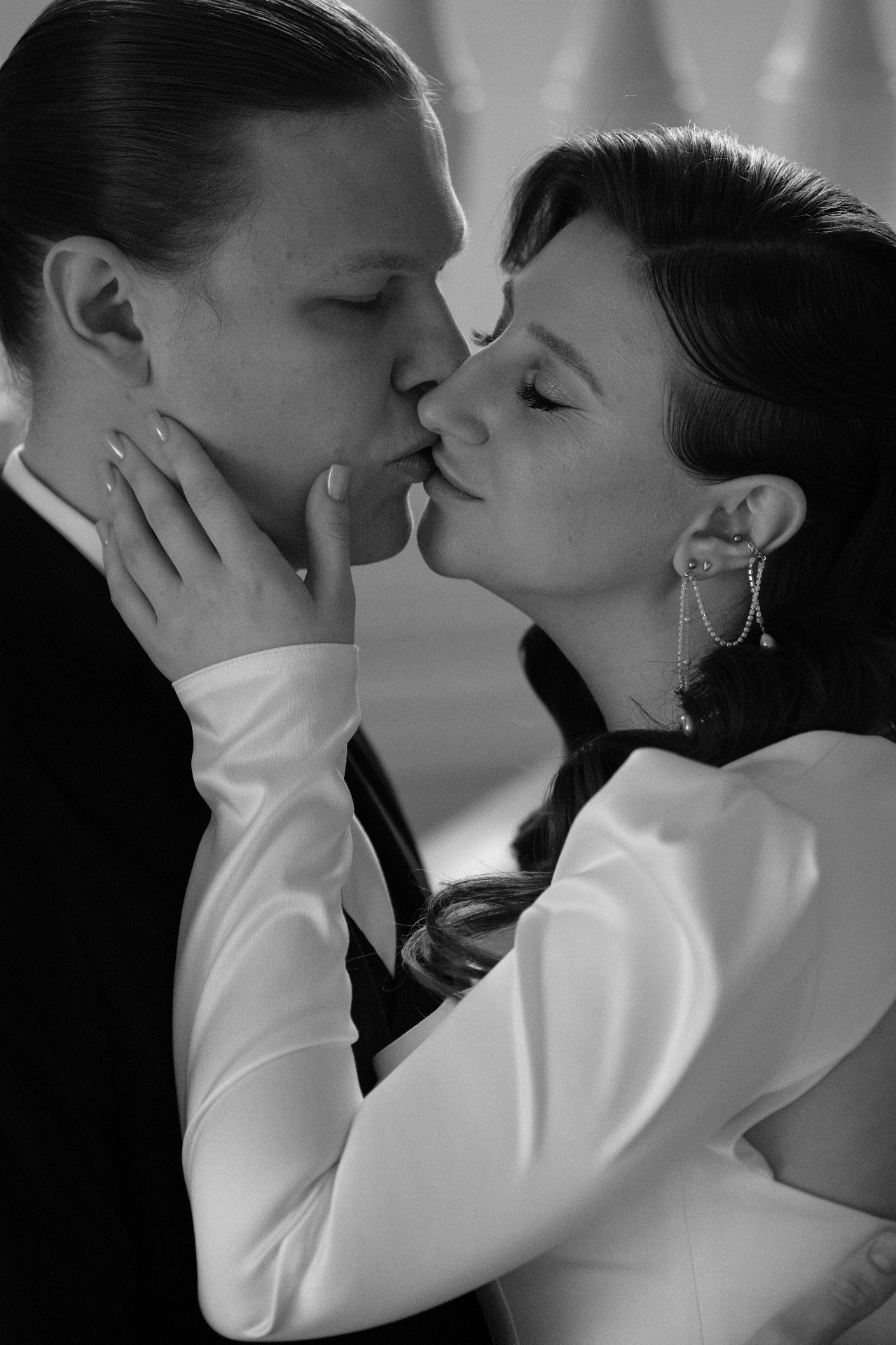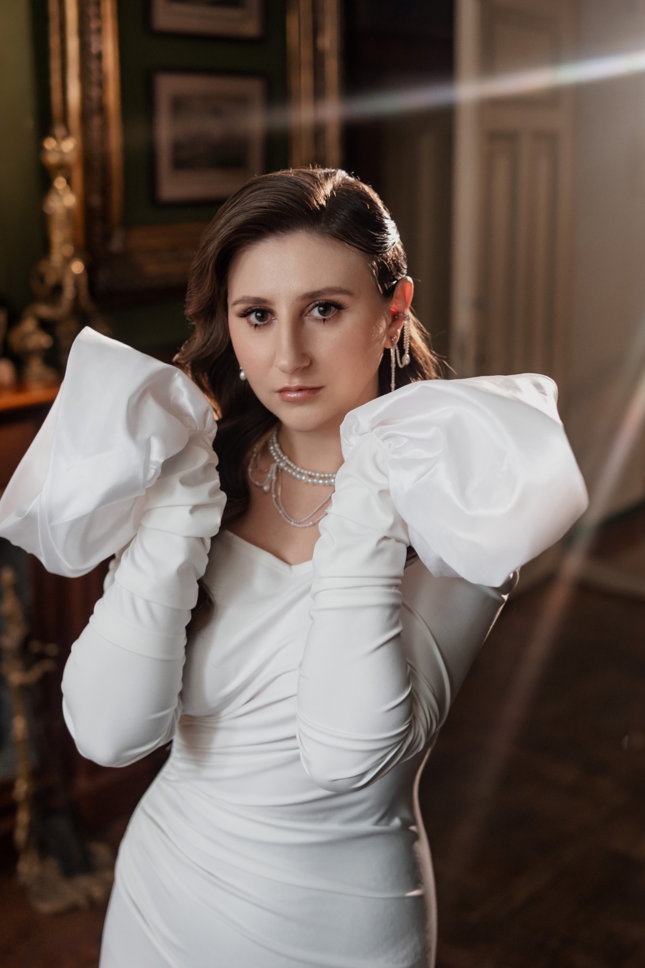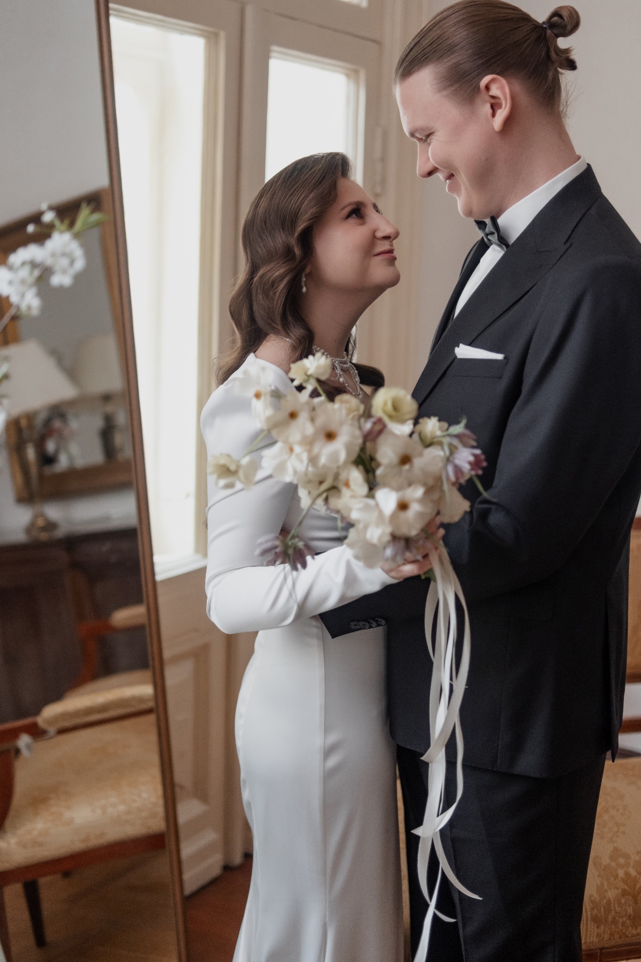 После выбора площадки, мы решили, что лучше всего туда подойдут классические образы: чёрный костюм для жениха и изящное платье из молочного атласа для меня. Свой образ я дополнила жемчужными украшениями ручной работы, жених — бабочкой и белым платком-паше.