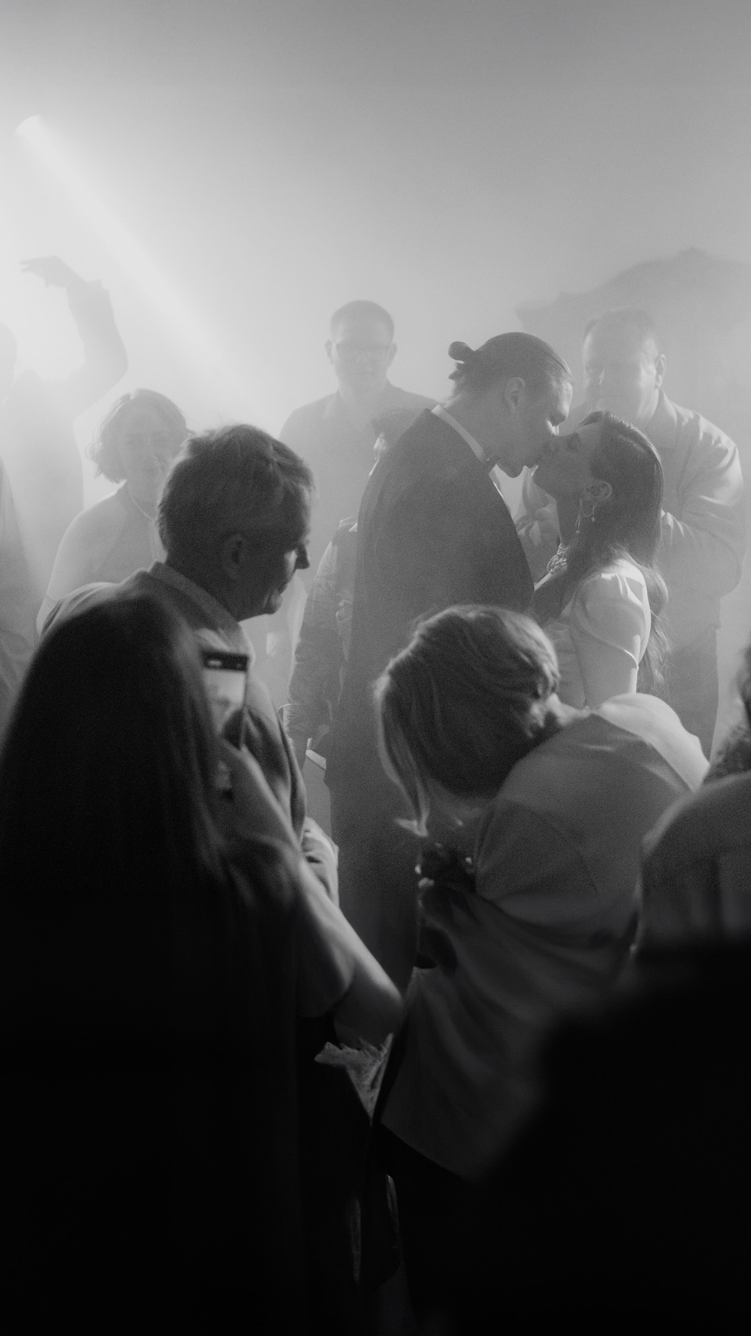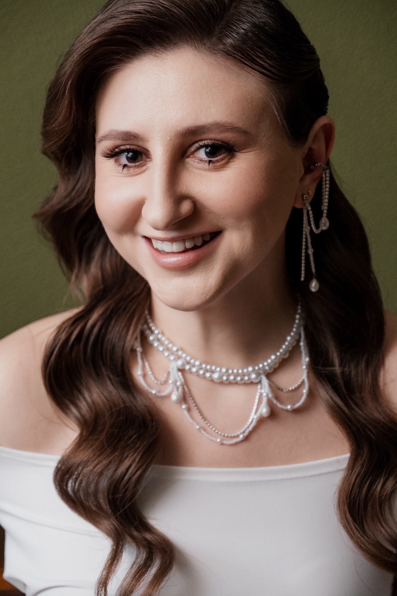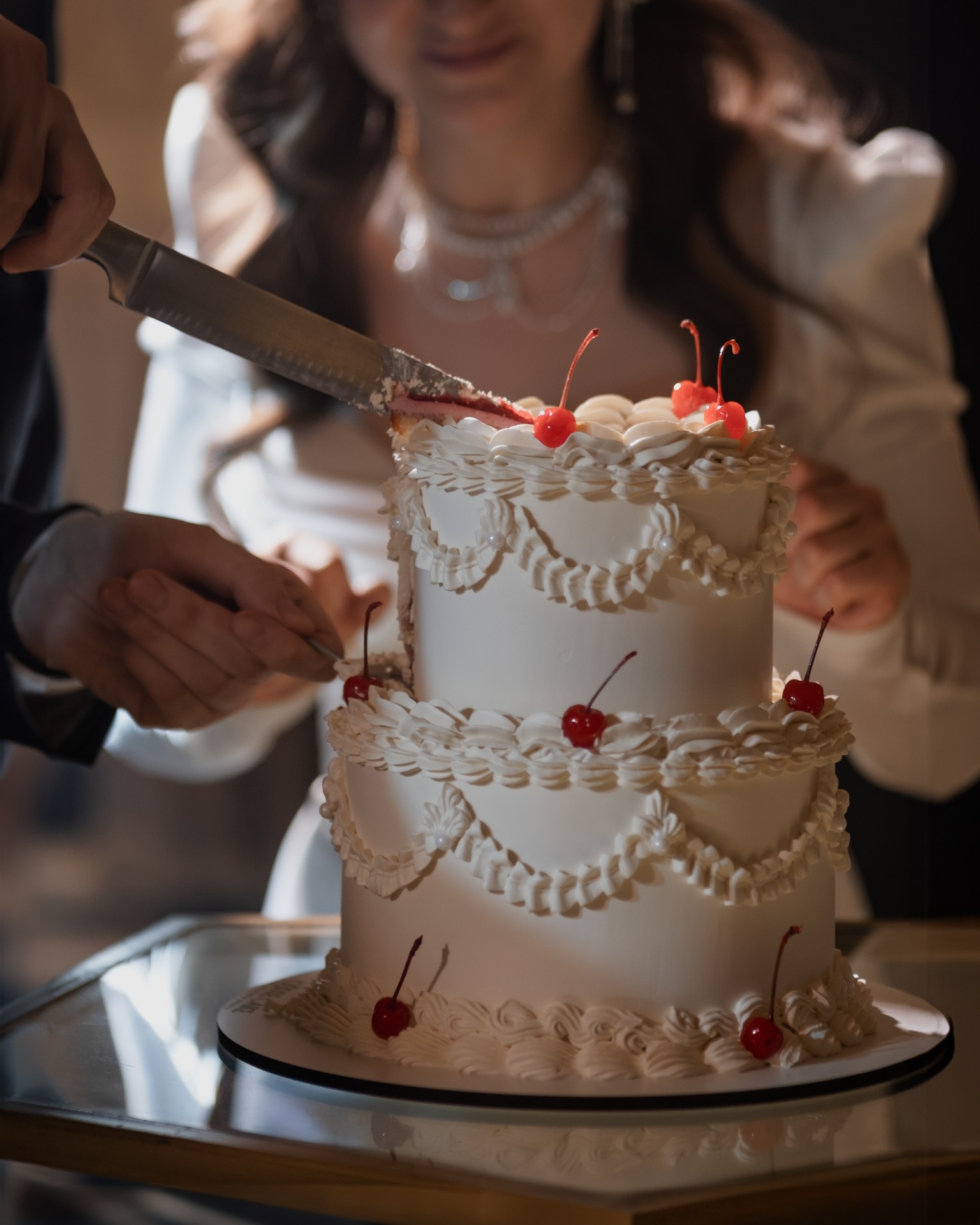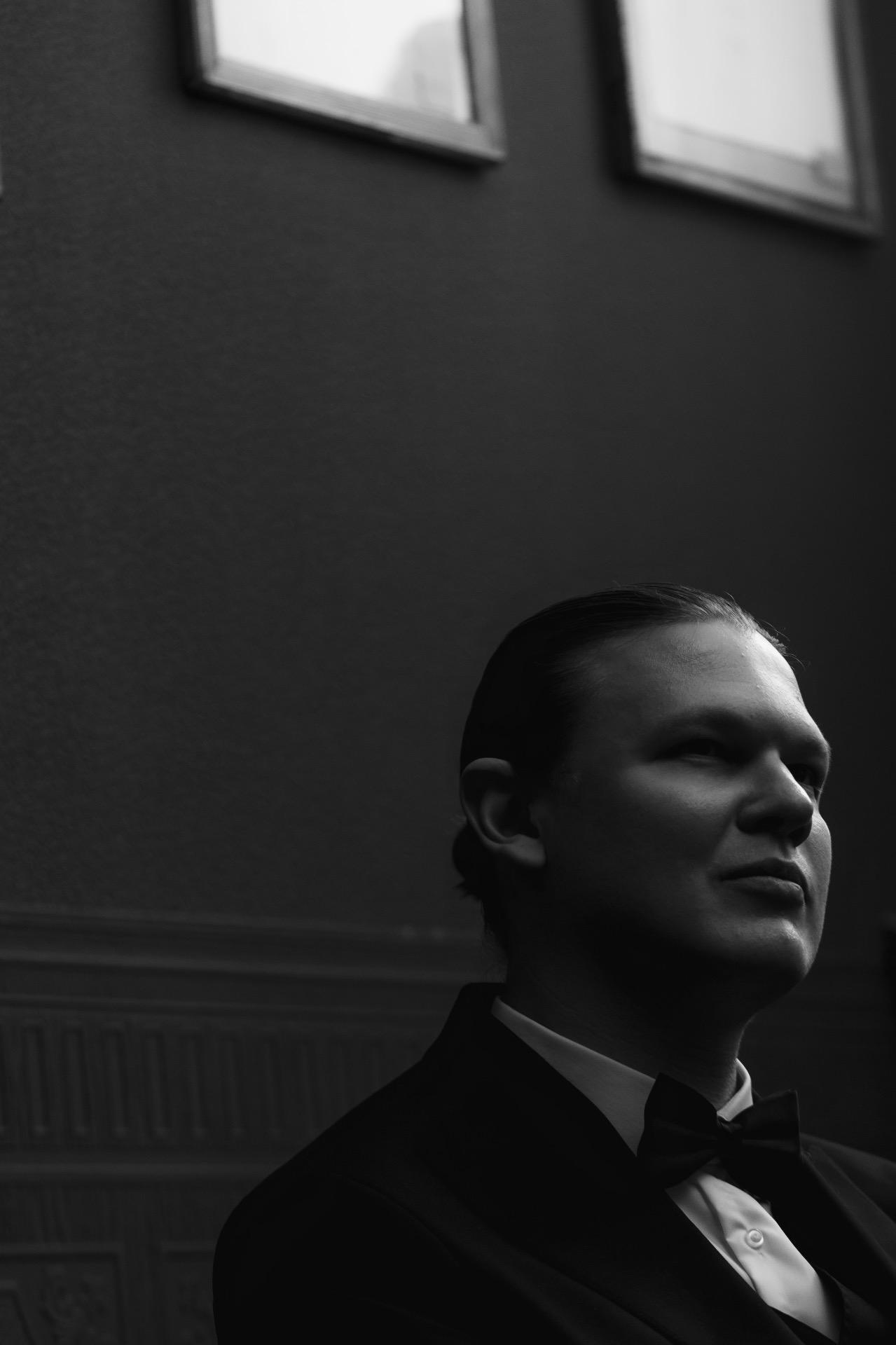 После выбора площадки, мы решили, что лучше всего туда подойдут классические образы: чёрный костюм для жениха и изящное платье из молочного атласа для меня. Свой образ я дополнила жемчужными украшениями ручной работы, жених — бабочкой и белым платком-паше.
