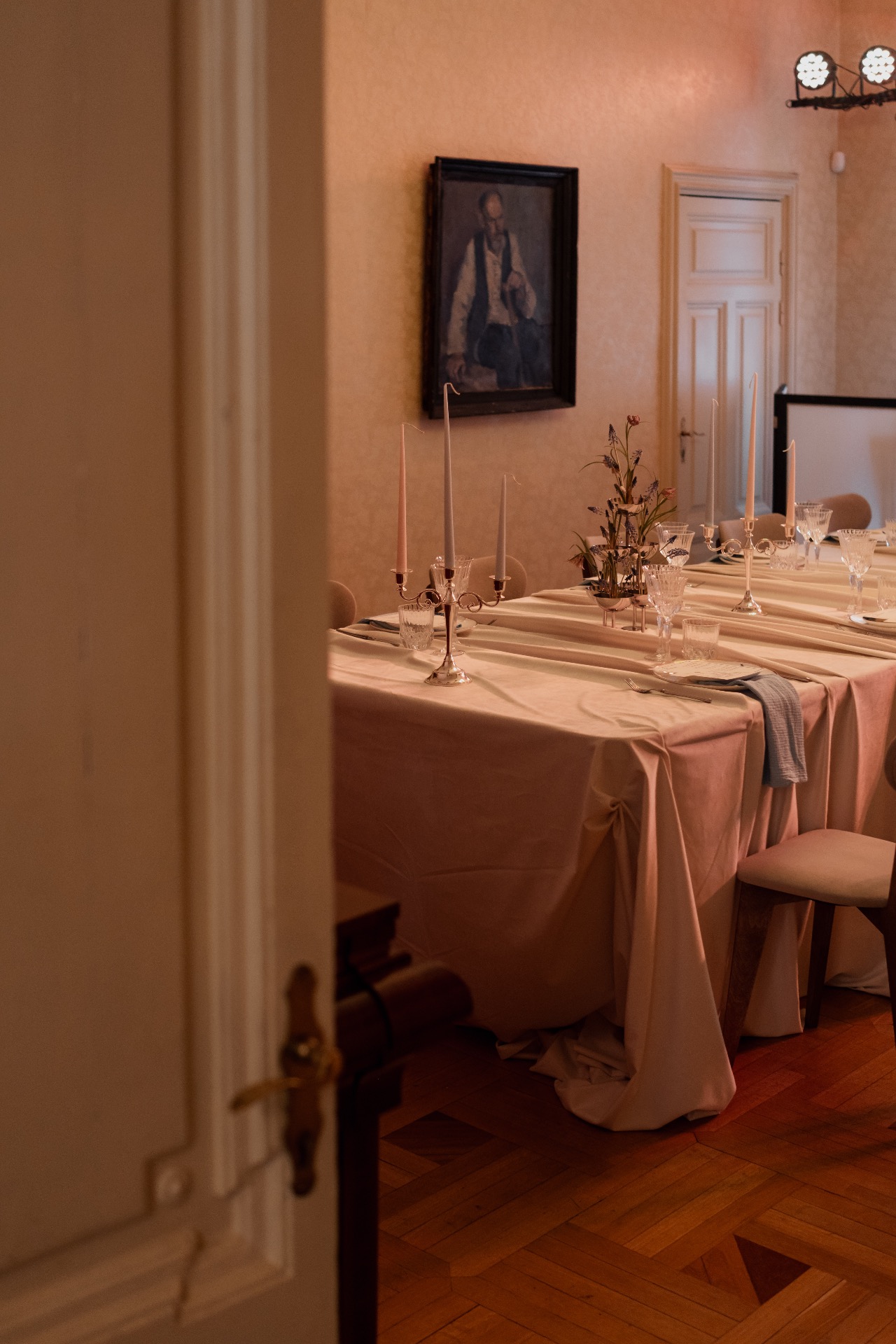 Сложнее всего было найти площадку для нашего праздника, мы перебрали множество вариантов. Нам хотели создать атмосферу тёплого семейного ужина, переходящего в вечеринку. В последний момент организатор предложила нам совершенно новую площадку, которая сразу же покорила нас — особняк В. А. Лемана.