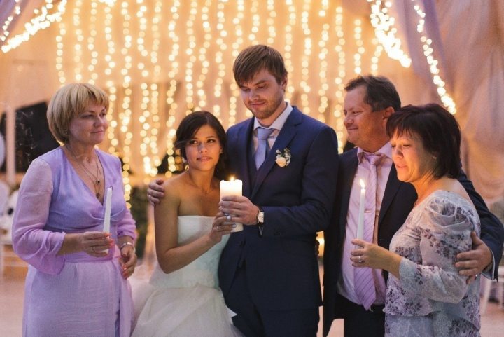 Зажечь семейный очаг могут и все родители вместе — в таком случае вы зажигаете вашу свечу от свечи родителей невесты и родителей жениха. Вы также можете и сами зажечь общую свечу, в знак объединения ваших семей. Обязательно сохраните вашу свечу на память — ее можно зажечь на годовщину свадьбы, это будет очень символично и трогательно.