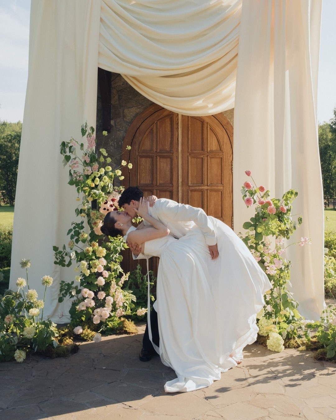 Стоимость флористики напрямую зависит от выбранных цветов и масштабов оформления: свадебная арка может быть украшена пышными пионами или бумажными гирляндами, а дорожка к алтарю – сотней зажжённых свечей или лепестками роз.
