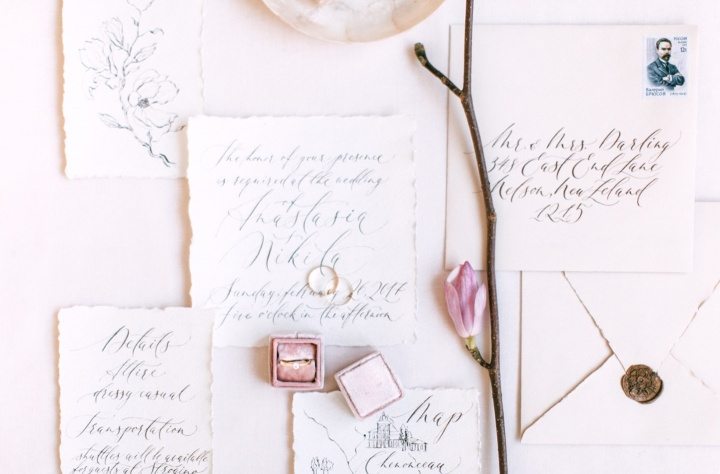 Для будуарной части съемки Анастасия выбрала хлопковое платье свободного кроя. Будучи символом девичьей наивности и весны, оно идеально вписалось в концепцию съемки наряду с нежными и хрупкими цветками магнолии в руках. Для полиграфии была выбрана белая бумага ручной работы. Пригласительные, посадочные карточки, меню — все было подписано вручную каллиграфией и эстетически поддерживало идею съемки легкостью и простотой форм.