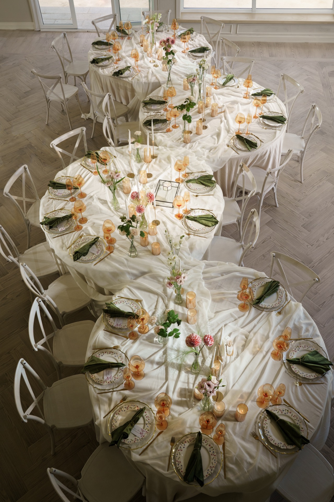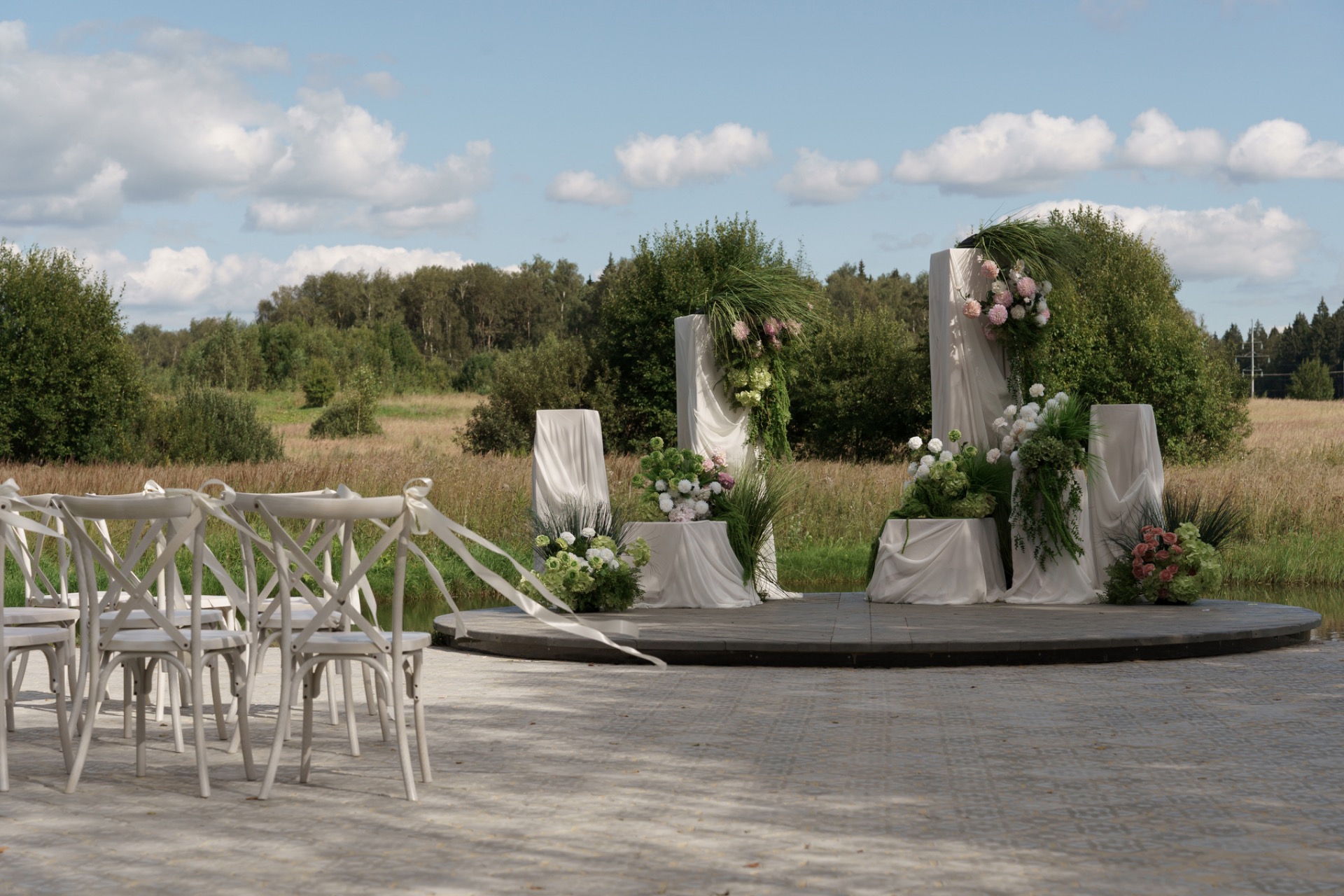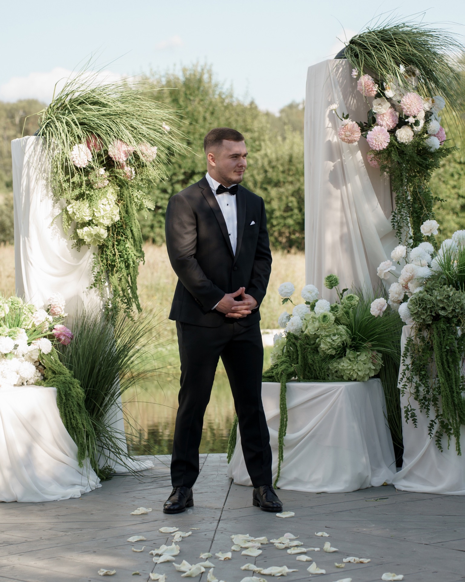 Паре хотелось, чтобы этот день был не «мероприятием», а уютной встречей, тем более были приглашены только самые близкие люди. Декор был очень минималистичным: светлые оттенки, живая зелень, простая, но красивая флористика. Всё должно было выглядеть естественно, будто так и было задумано природой.