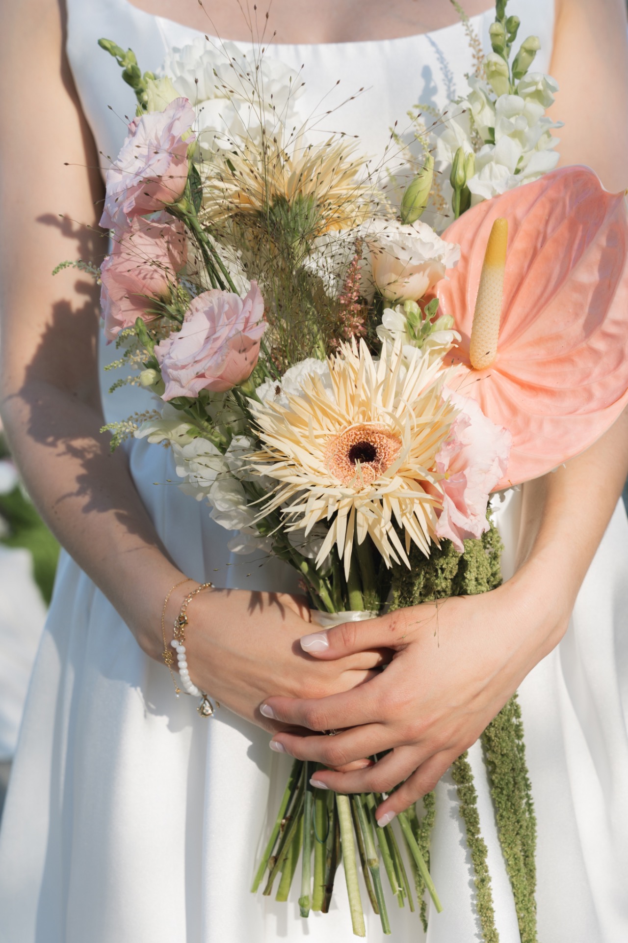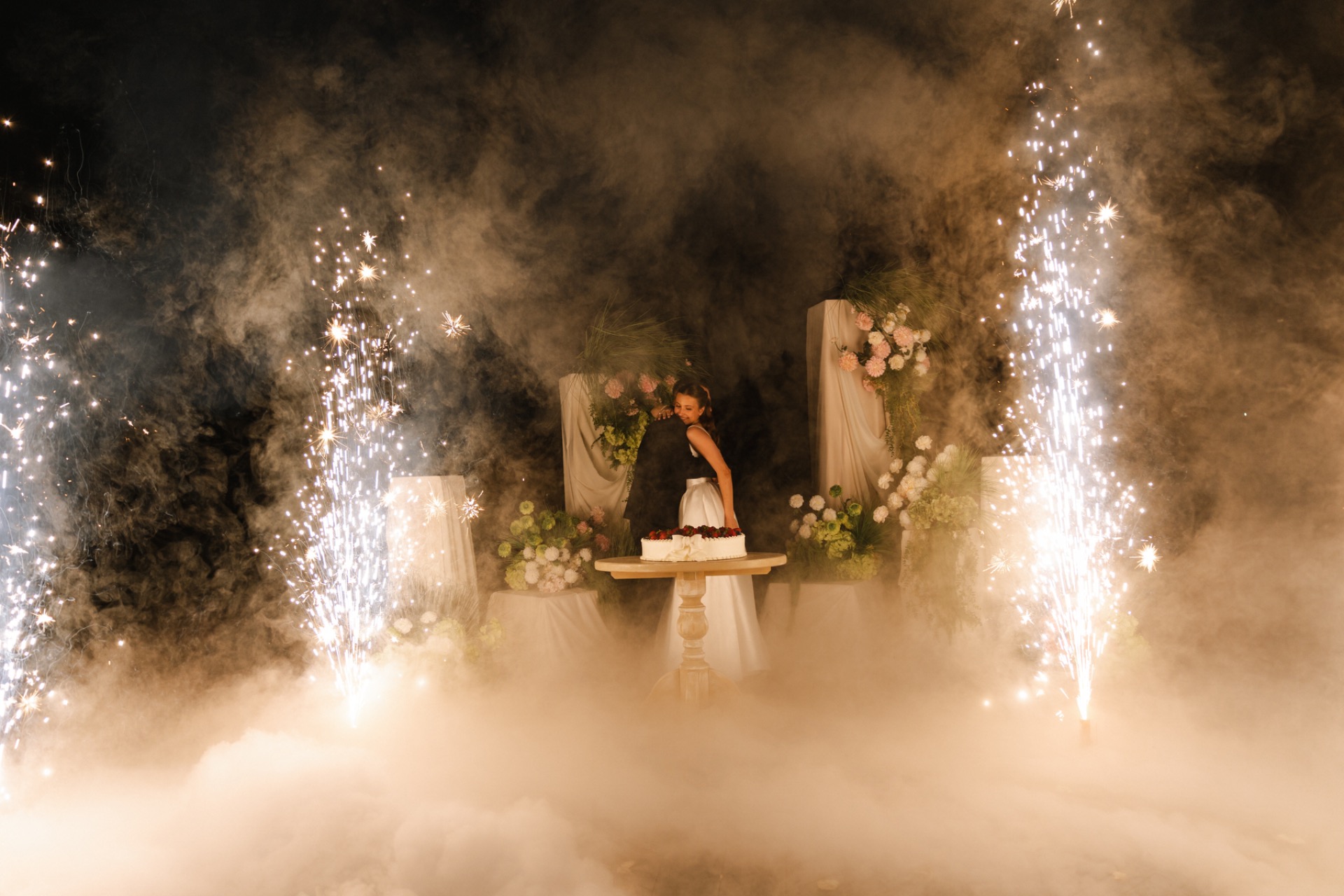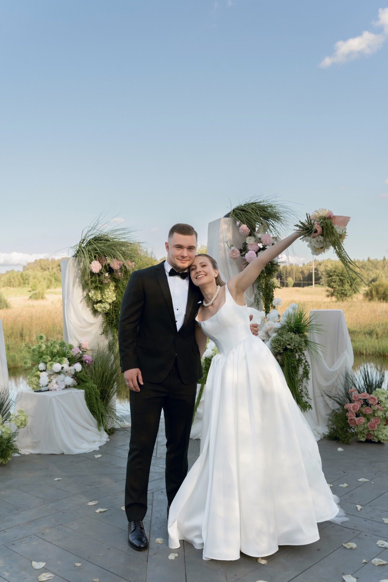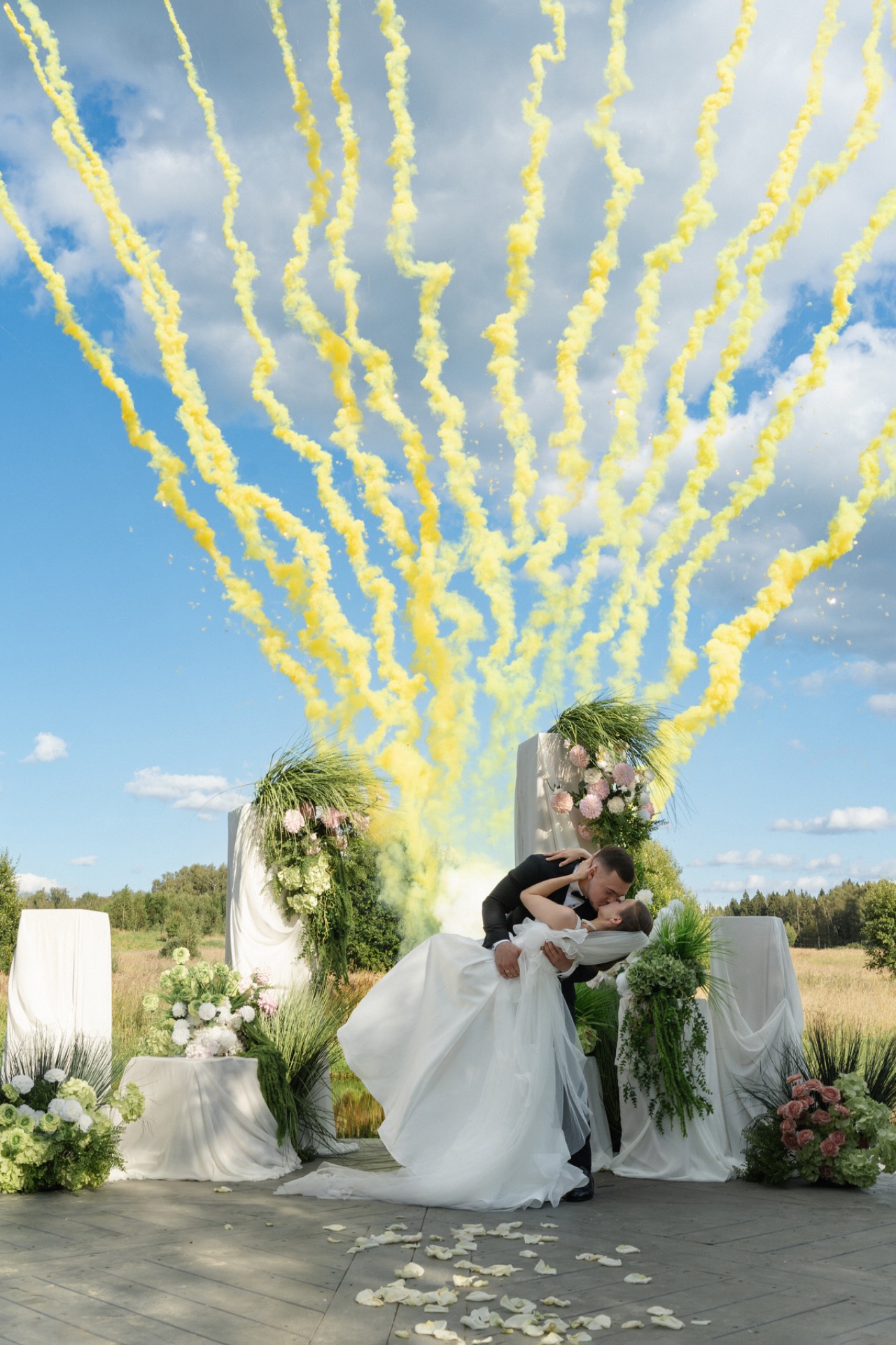 В качестве ярких элементов ребята выбрали розовые и жёлтые оттенки, которые добавили в букет невесты и цветной салют на церемонии в завершение клятв.