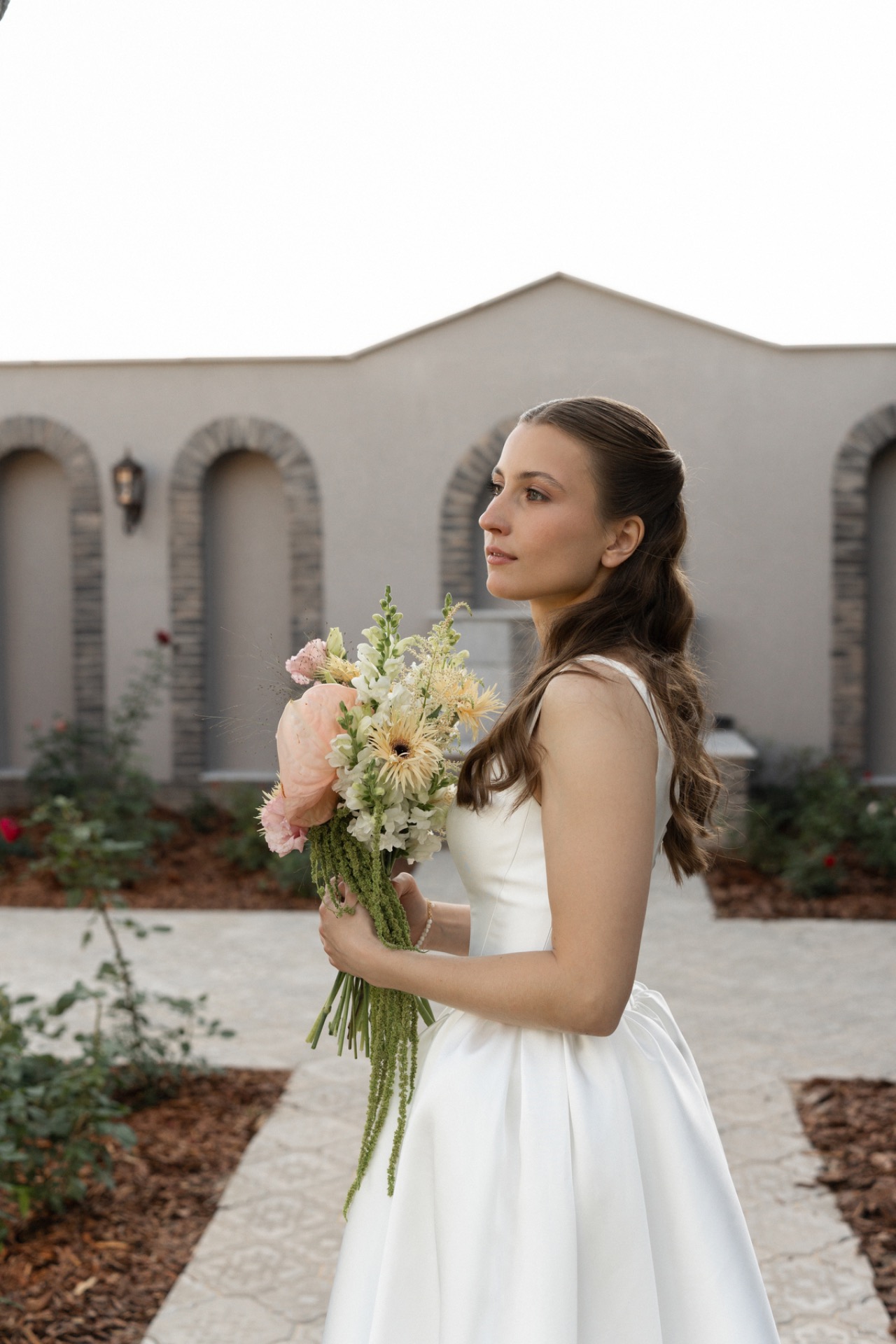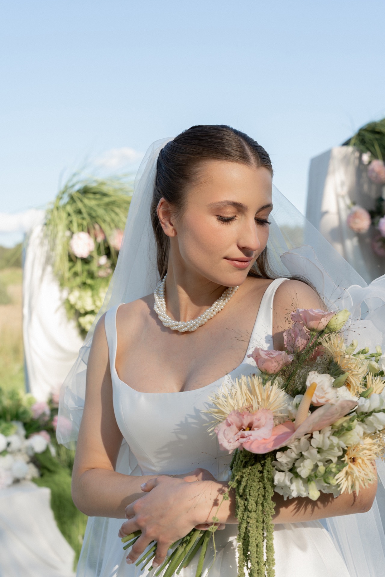 Маша была невероятно нежной. Она выбрала для себя очень красивое, лаконичное платье из Мэри Трюфель — без лишних деталей, но с идеальной посадкой. Всё смотрелось легко, чисто и очень по-настоящему. Никакого перегруза: естественный макияж, аккуратная причёска.