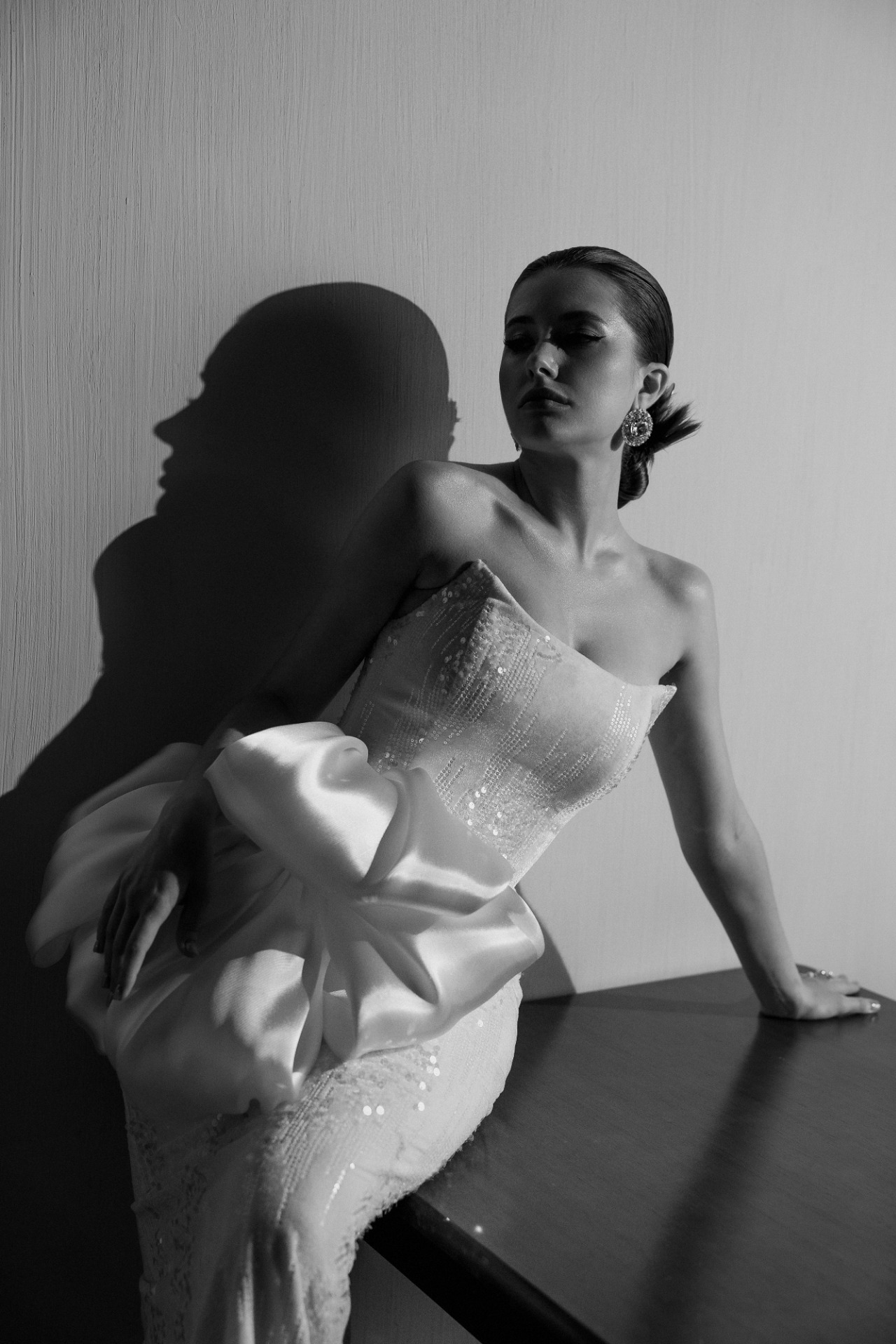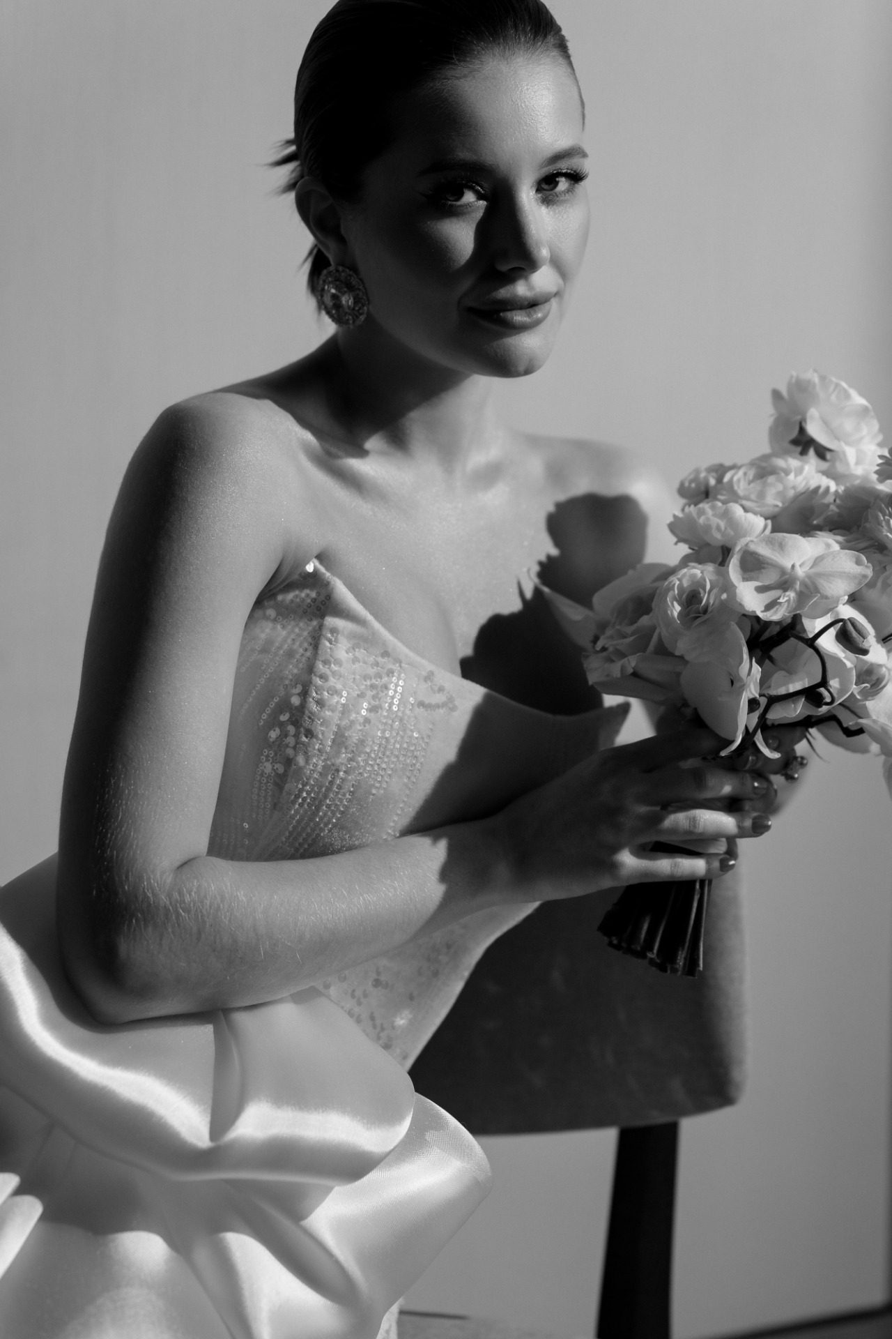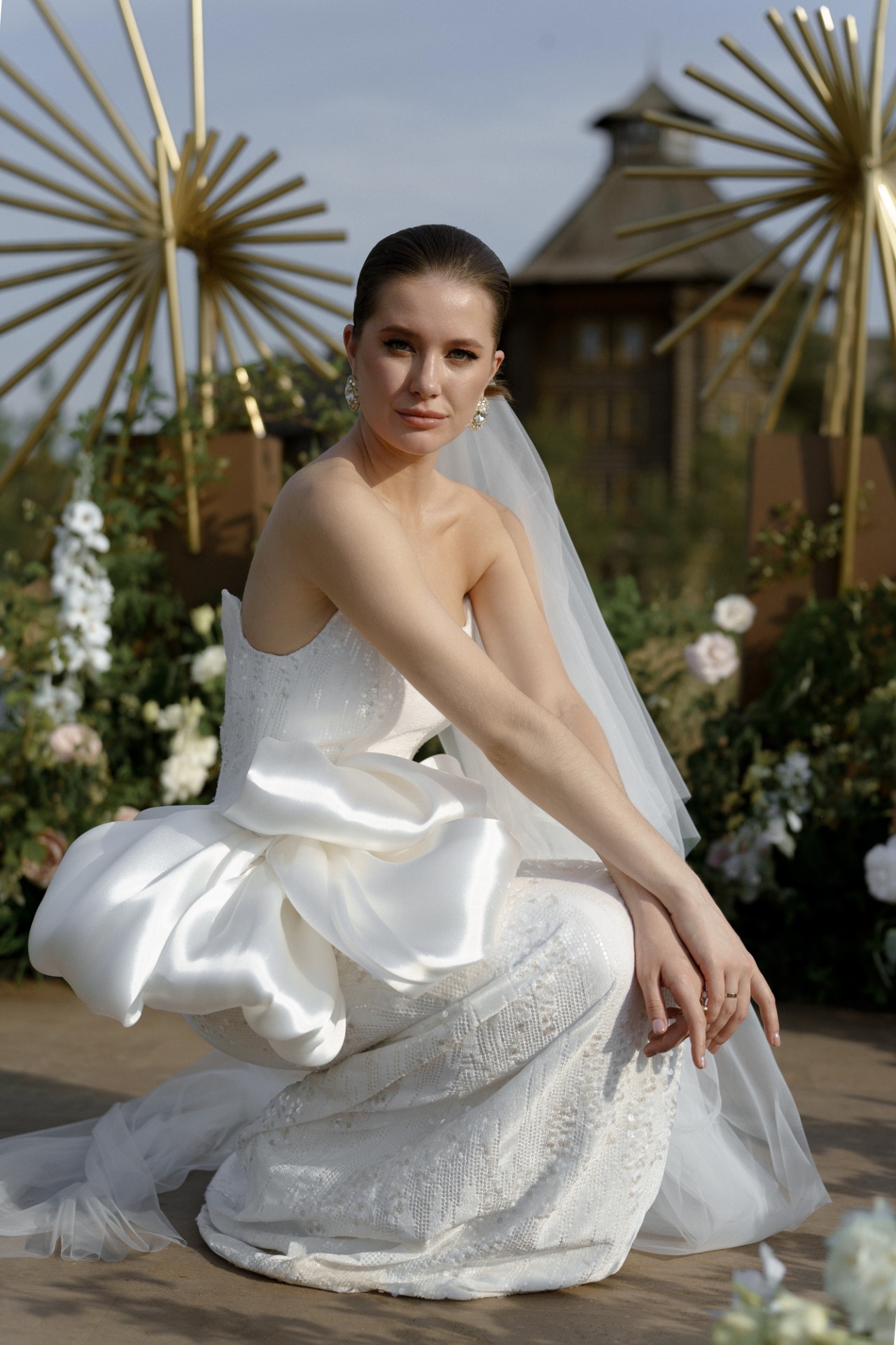 Я хотела создать элегантный, роскошный образ, чтобы он выглядел дорого и статусно. Уже в первом салоне, после нескольких примерок, мы нашли то самое платье: силуэтное, элегантное, из бархата, с вкраплениями пайеток