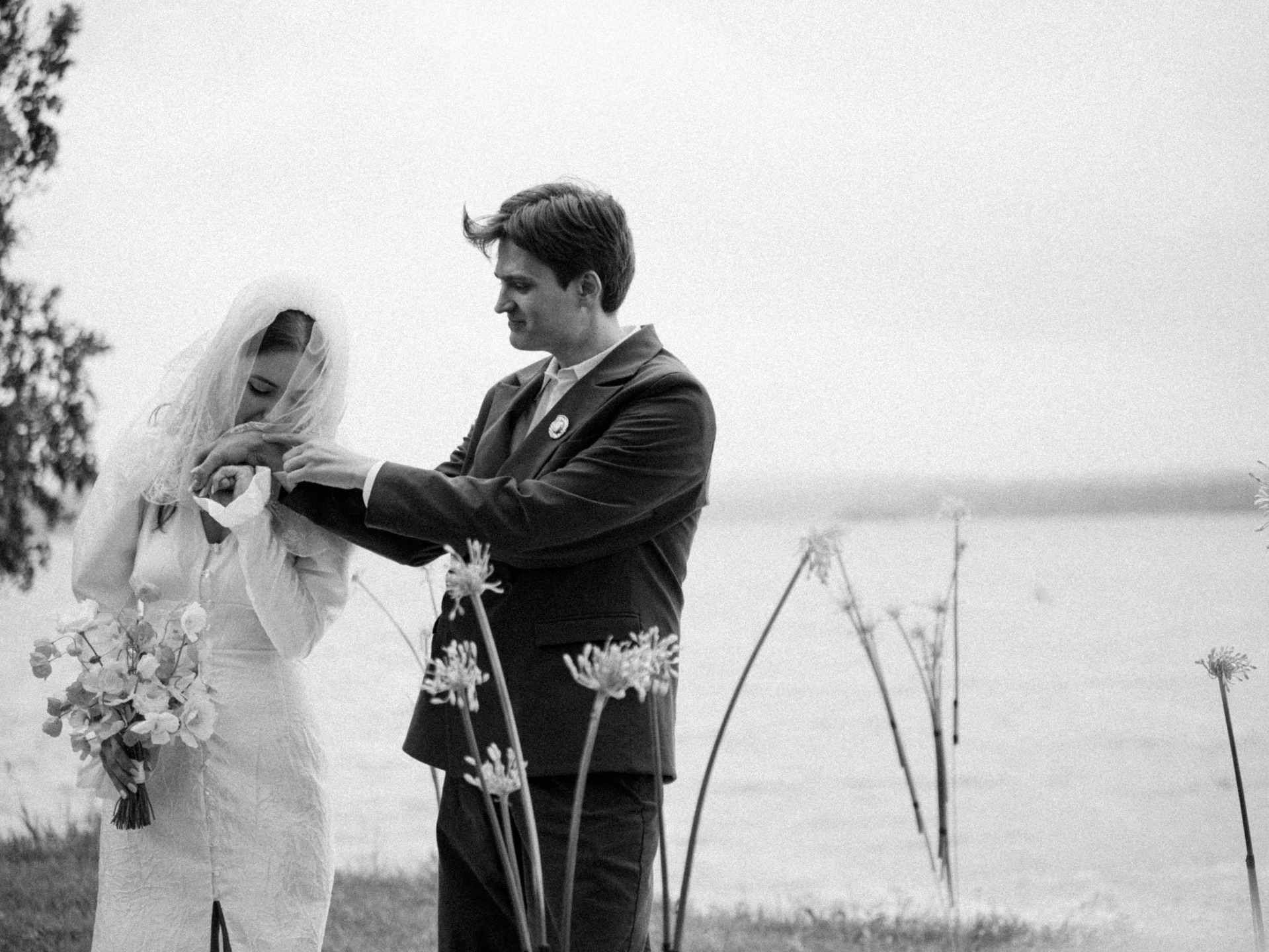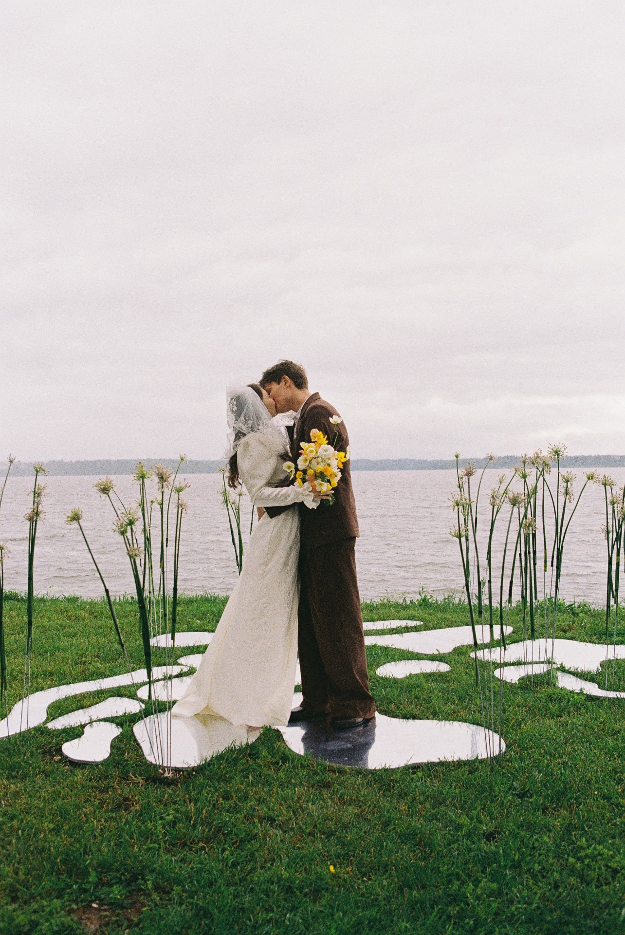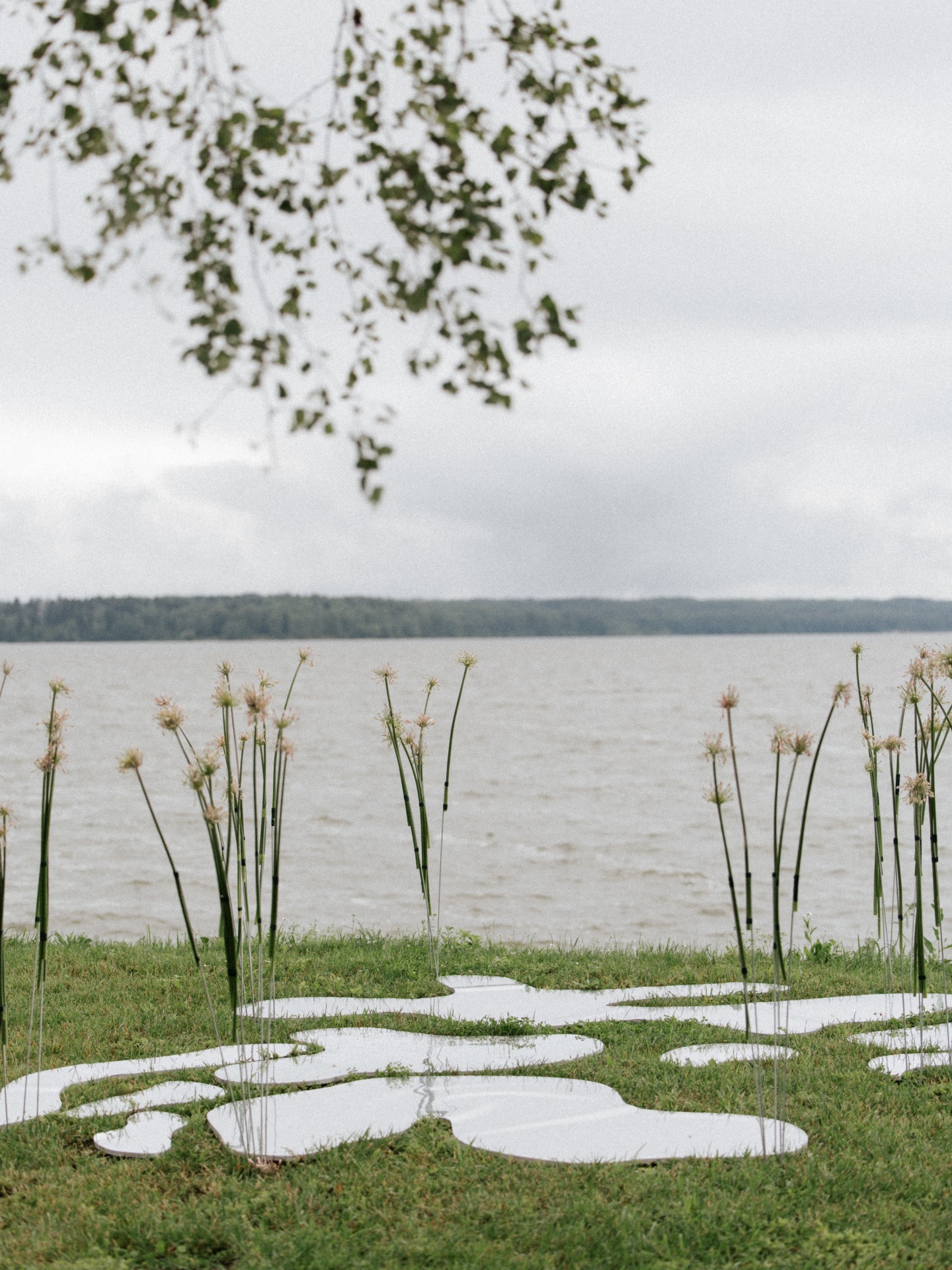 Зона церемонии осталась на открытом воздухе с видом на озеро, на лужайке были зеркальные лужицы и высокий аллиум, создававший эффект отражений и атмосферу иллюзии.