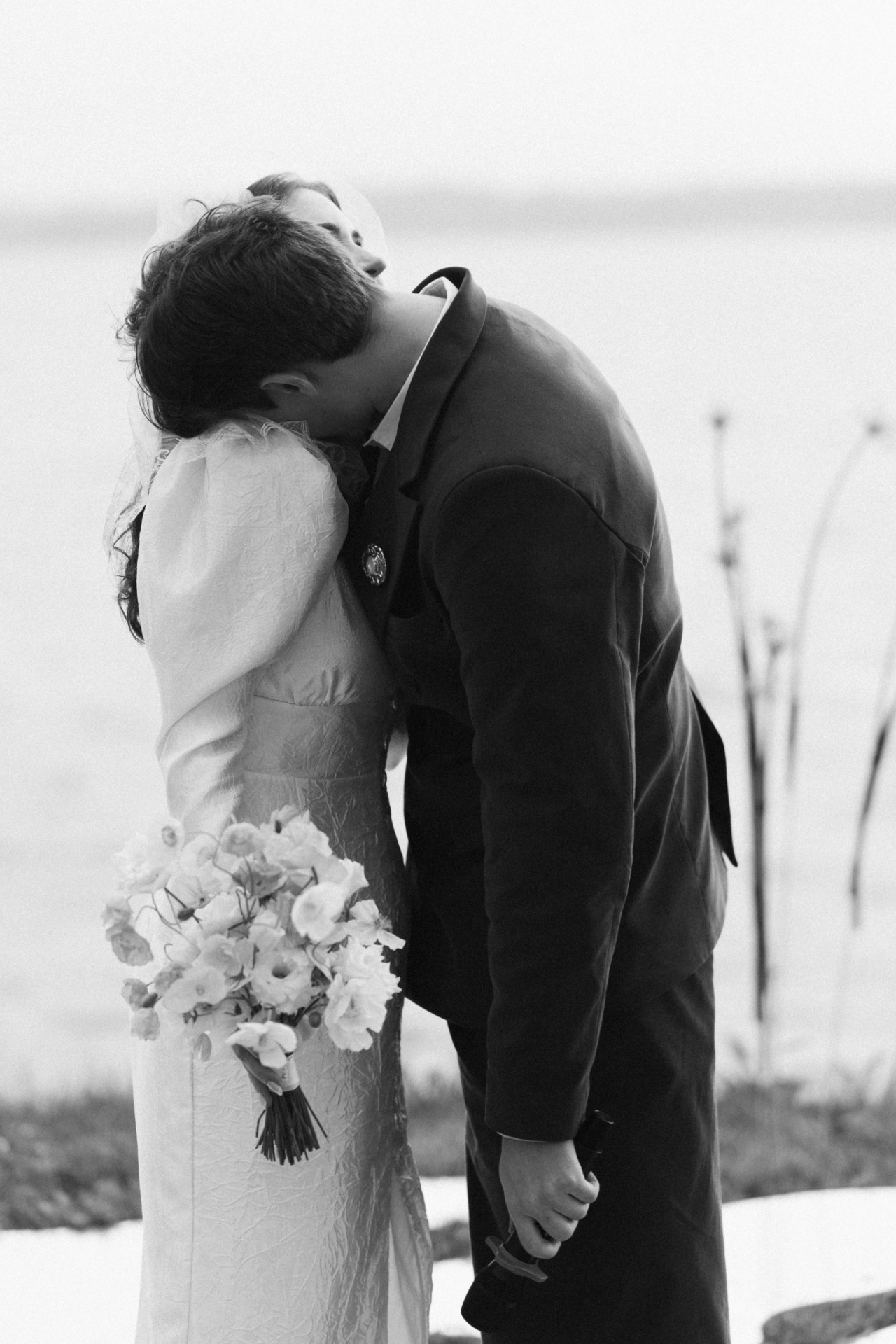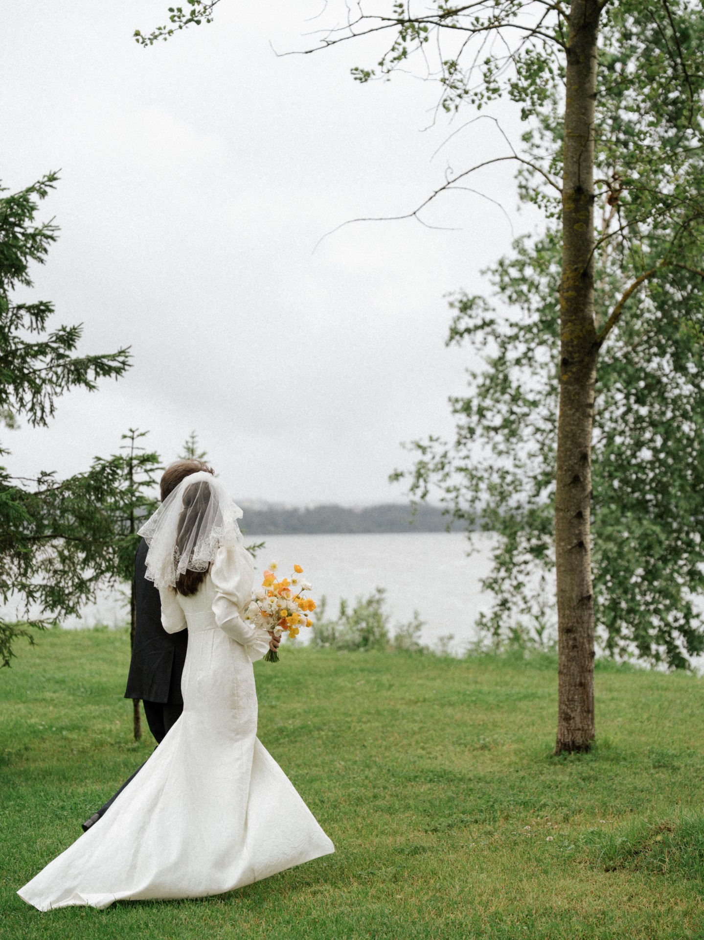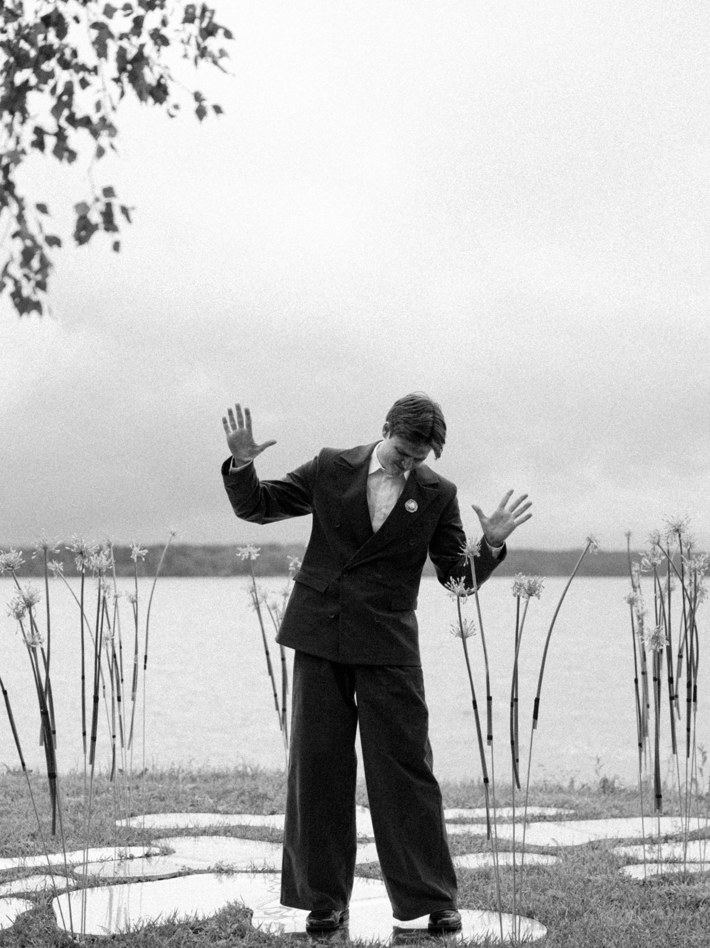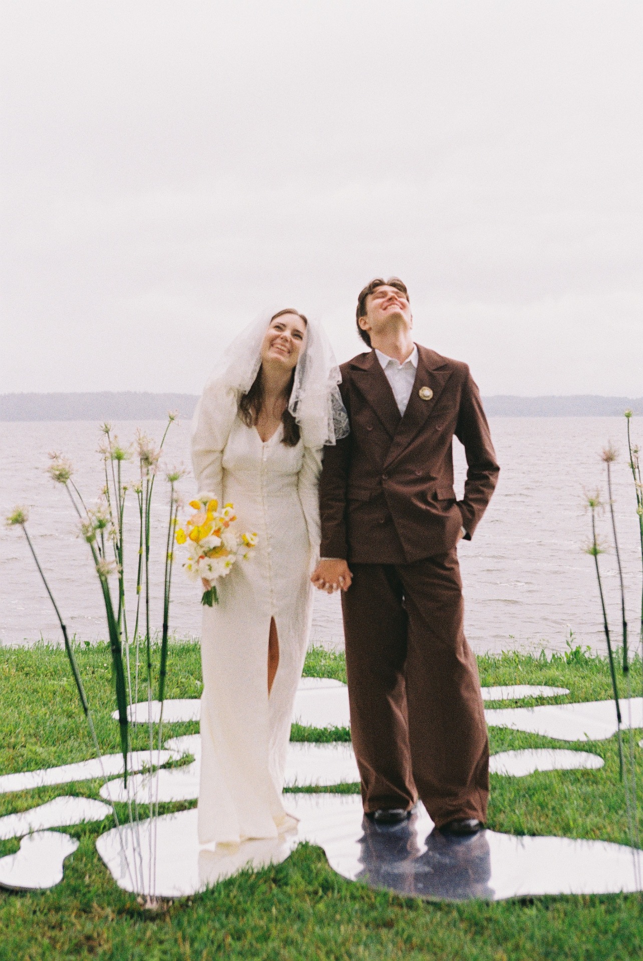 Зона церемонии осталась на открытом воздухе с видом на озеро, на лужайке были зеркальные лужицы и высокий аллиум, создававший эффект отражений и атмосферу иллюзии.
