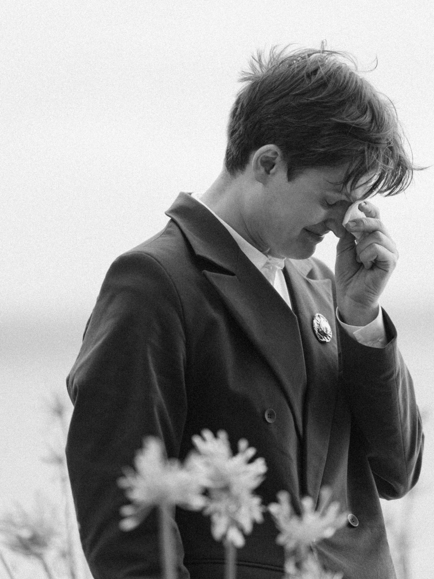 Когда мы были вместе в ANTI-BRIDE Place, Даня заметил кольцо, которое бы очень хорошо украшало его образ, если бы стало брошью. Нам решили помочь это воплотить, и так появился акцент на костюме в виде кастомизированной броши с перламутровой сердцевиной, которая связывала наши наряды и заменяла галстук, делая его образ завершённым и гармоничным.