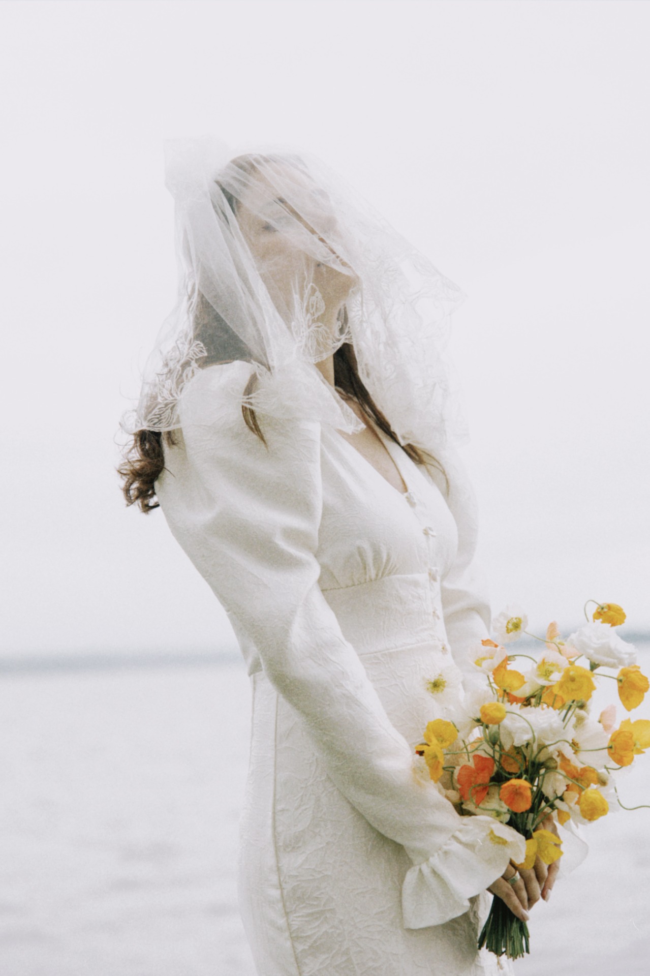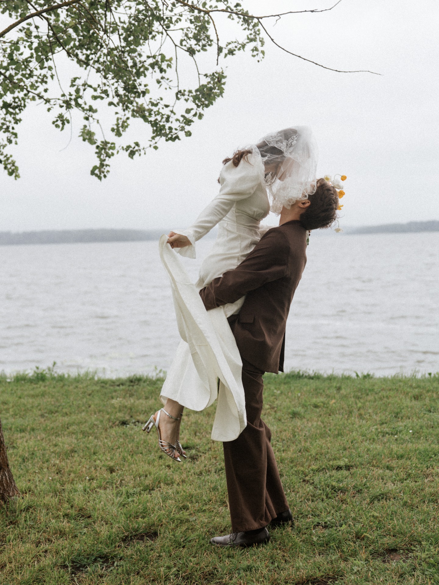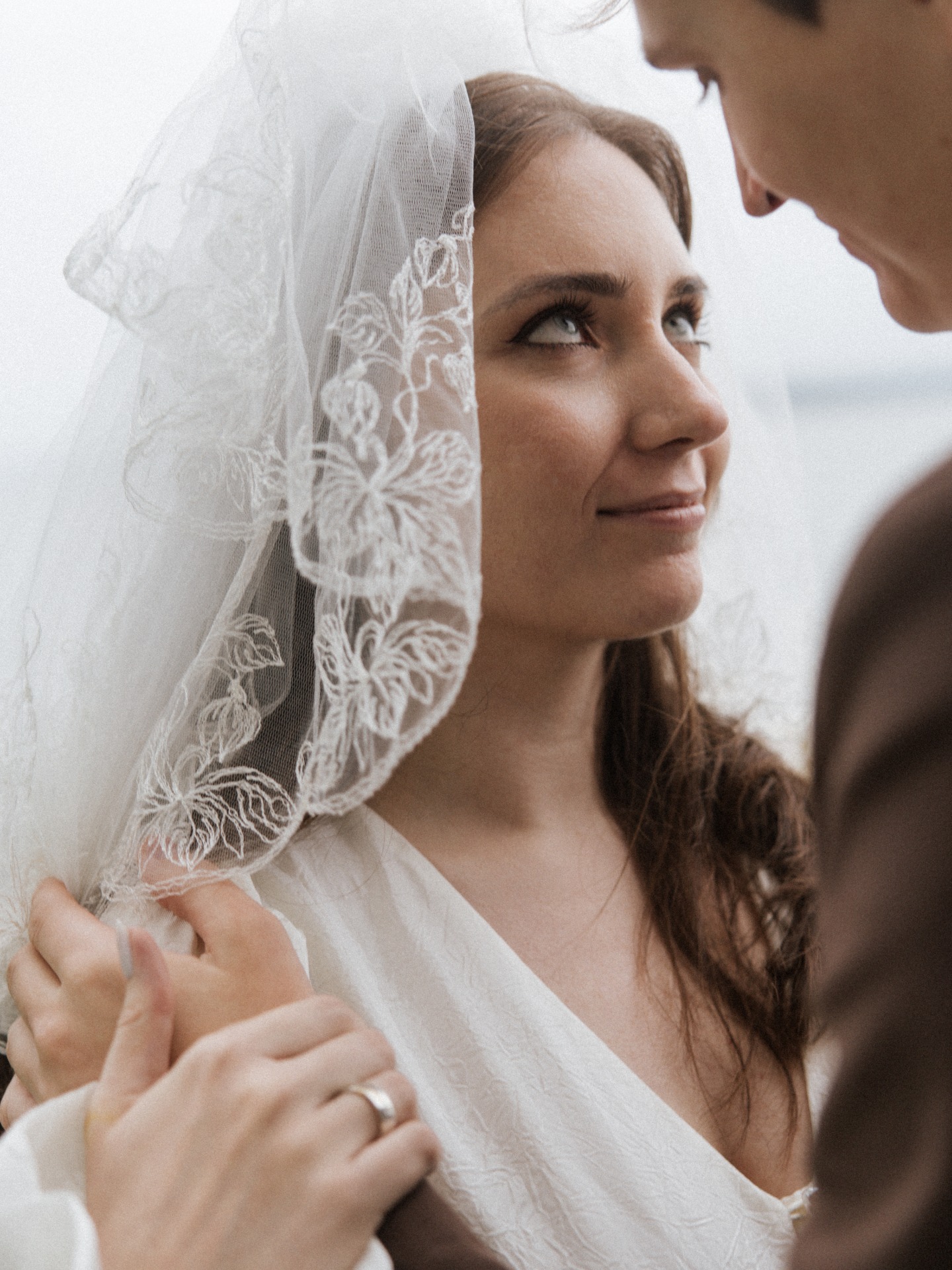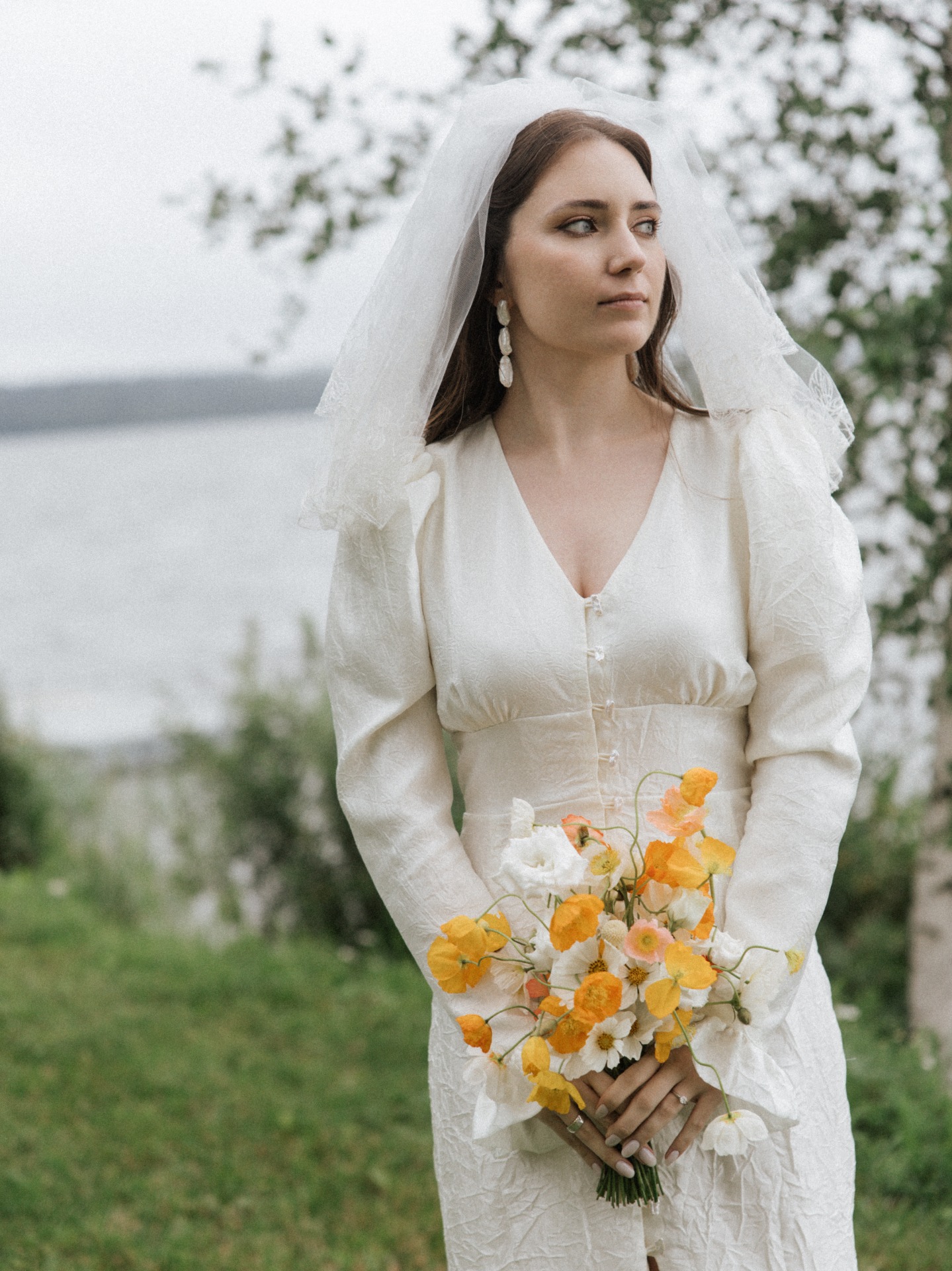 Фату Ольга сшила из винтажного полотна с вышивкой, немного пышную и короткую, идеально подходящую под мой образ. Босоножки я выбрала серебристые, чтобы гармонировали с декором, а серьги из ANTI-BRIDE Place напоминали жемчужные пуговки платья, завершая наряд.
