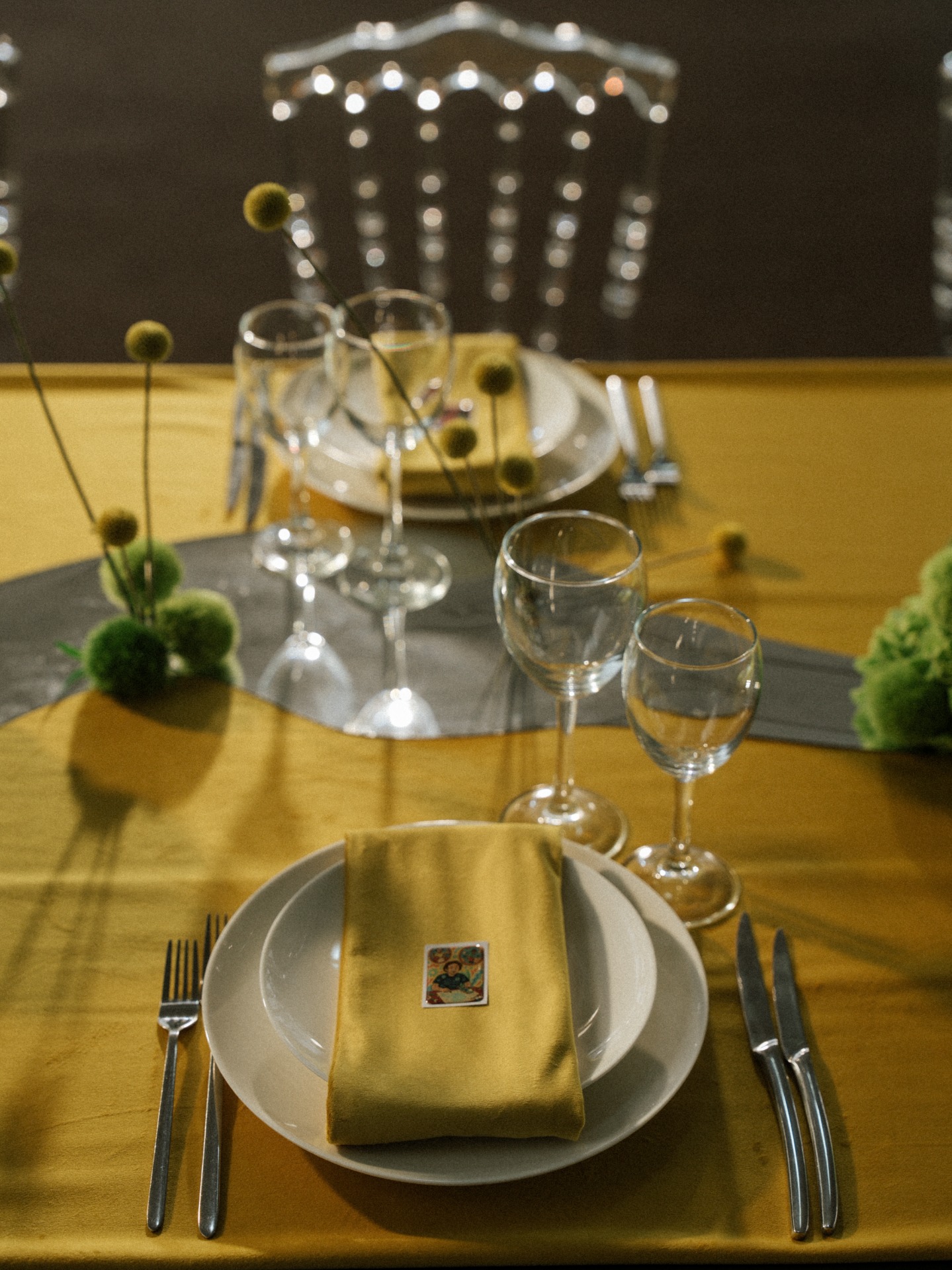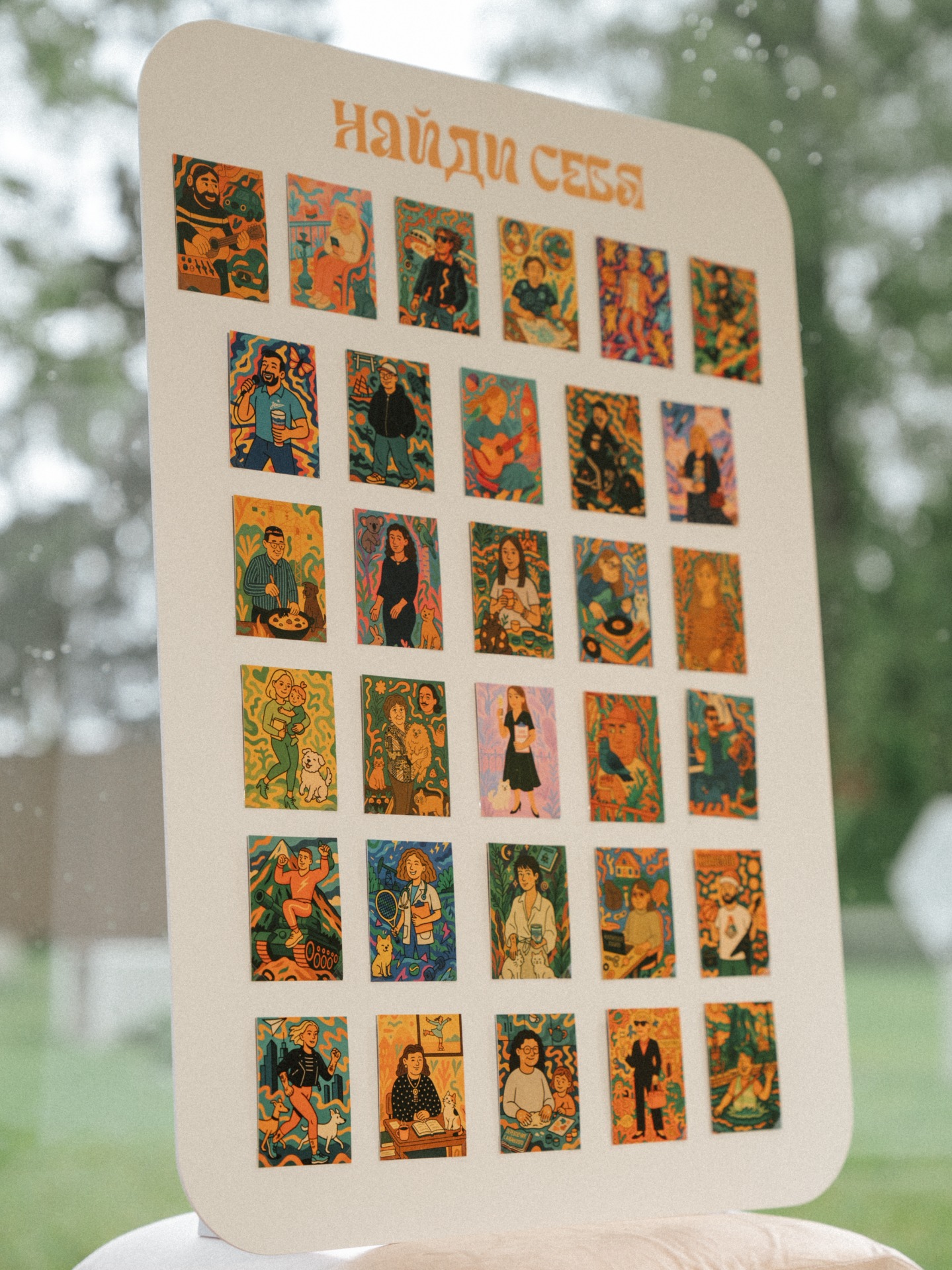 В зоне рассадки мы сделали индивидуальные карточки гостям, на которых были иллюстрации по их фото в нашей стилистике, и они искали свои места, на которых лежали 3D-стикеры с такой же картинкой.