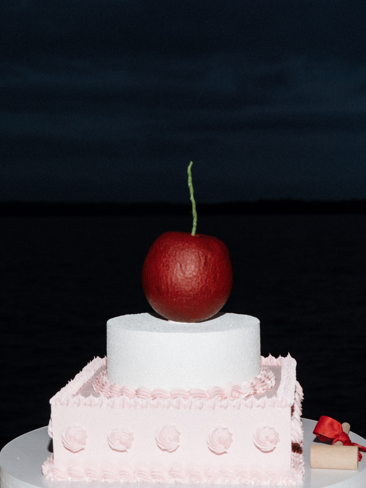 Торт мы сделали классическим, но с ироничной деталью — большой реалистичной шоколадной вишней.
