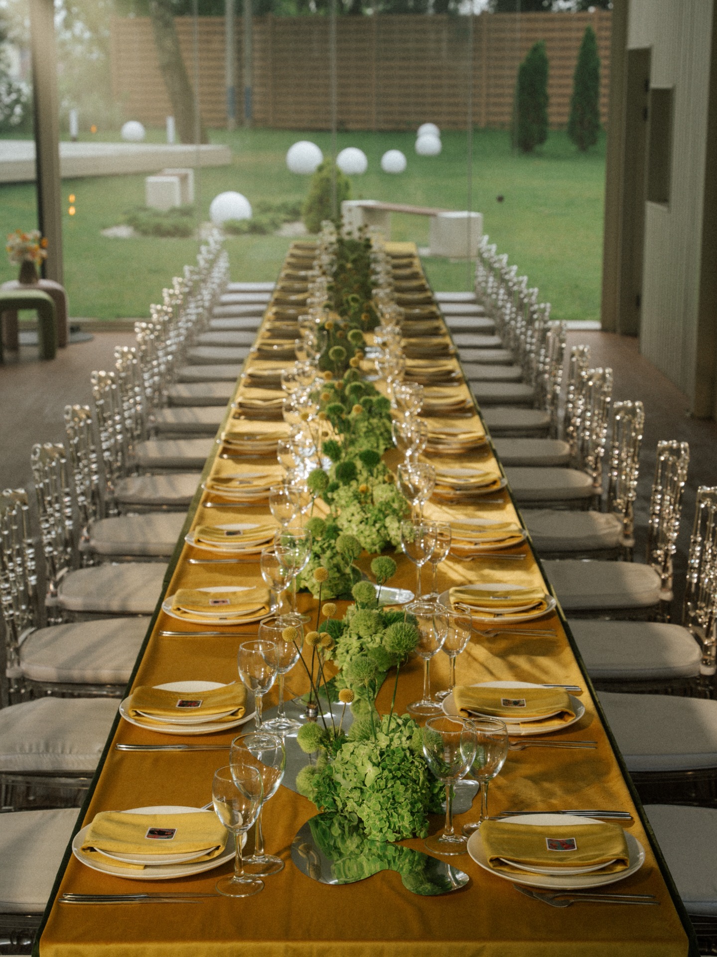 Мы хотели сформировать чувство единения среди гостей и сделали общий стол. Он получился как остров: круглые формы аллиума с зоны церемонии были поддержаны зелёной гвоздикой и жёлтой краспедией, которые фиксировались на кензанах. Они создавали ощущение, что растут из самого стола, а рядом с цветочными композициями также были зеркальные лужицы.