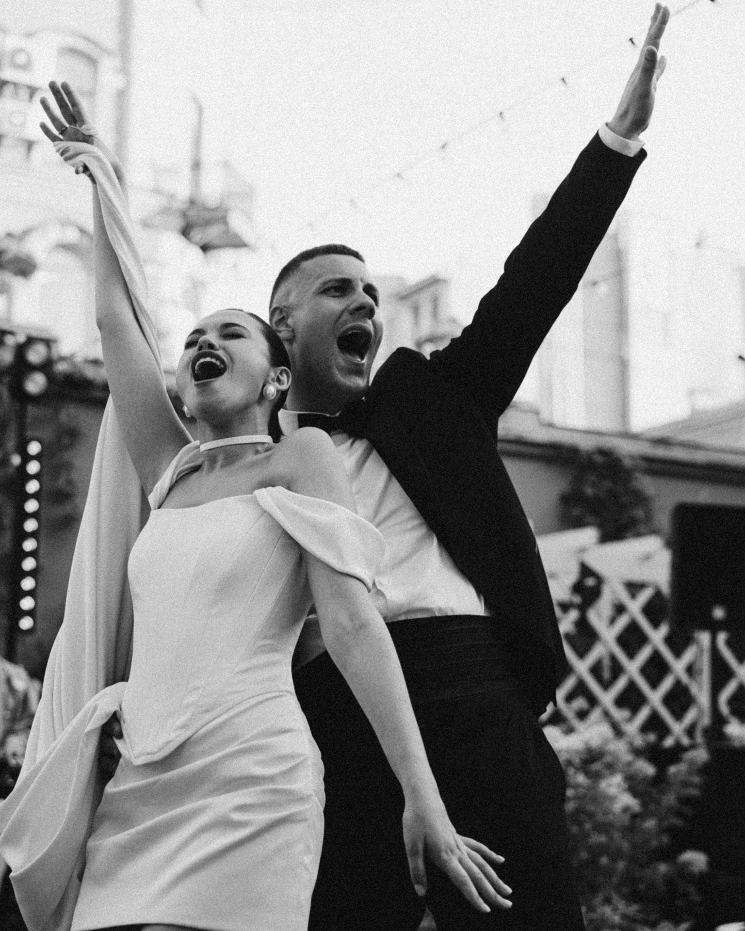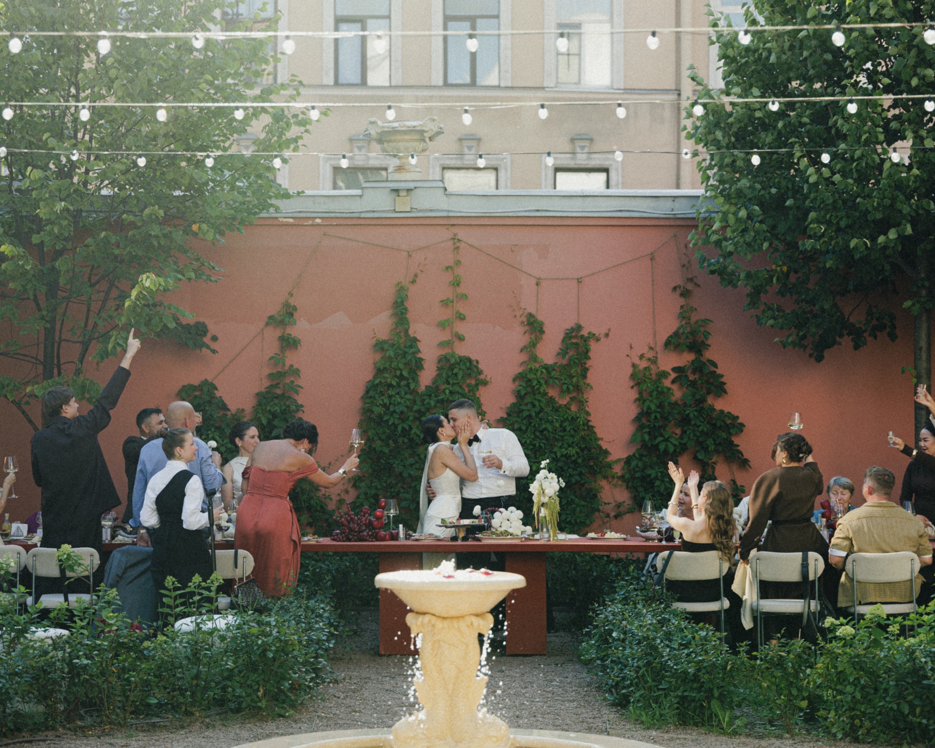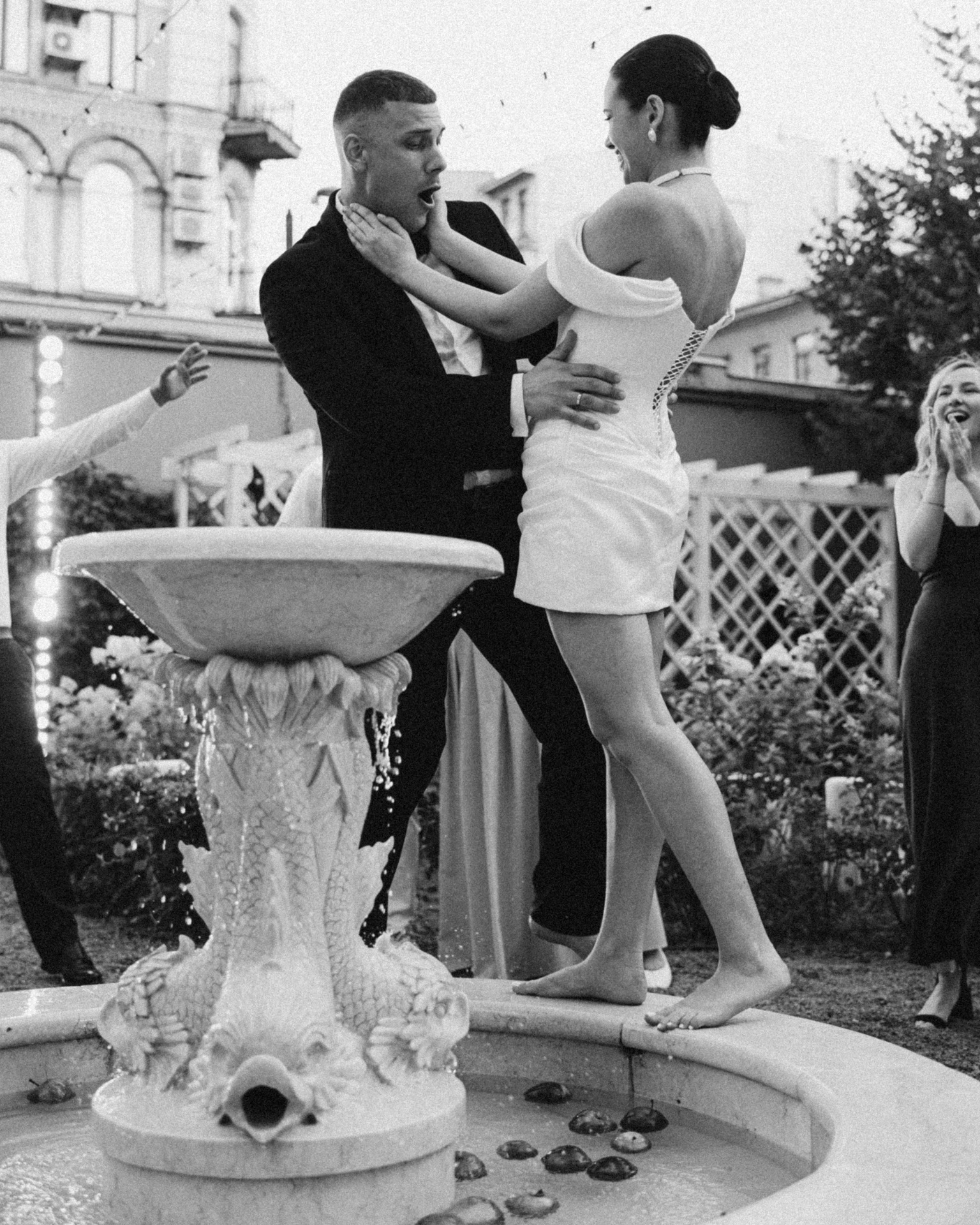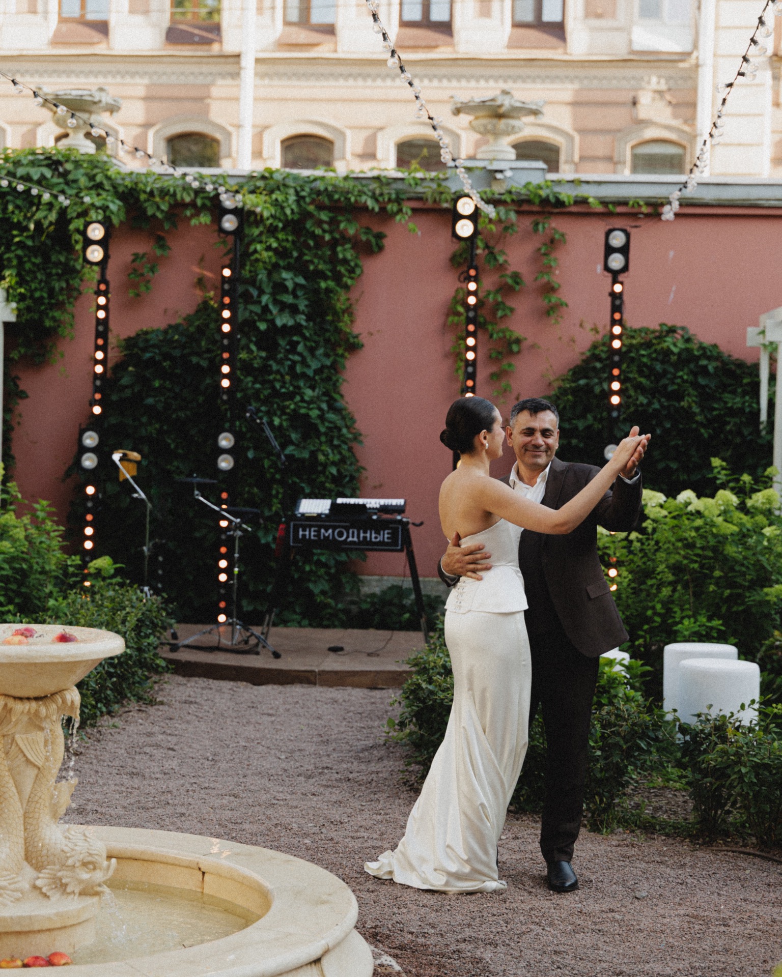 Наша свадьба получилась невероятно эстетичной, именно об этом мы мечтали. Мы решили отказаться от первого танца и вместо него вместе исполнили песню Анны Герман «Мы эхо». Вторая половина вечера была по-настоящему зажигательной: мы сняли обувь и танцевали прямо в фонтане с яблоками, весело плескаясь в воде.
