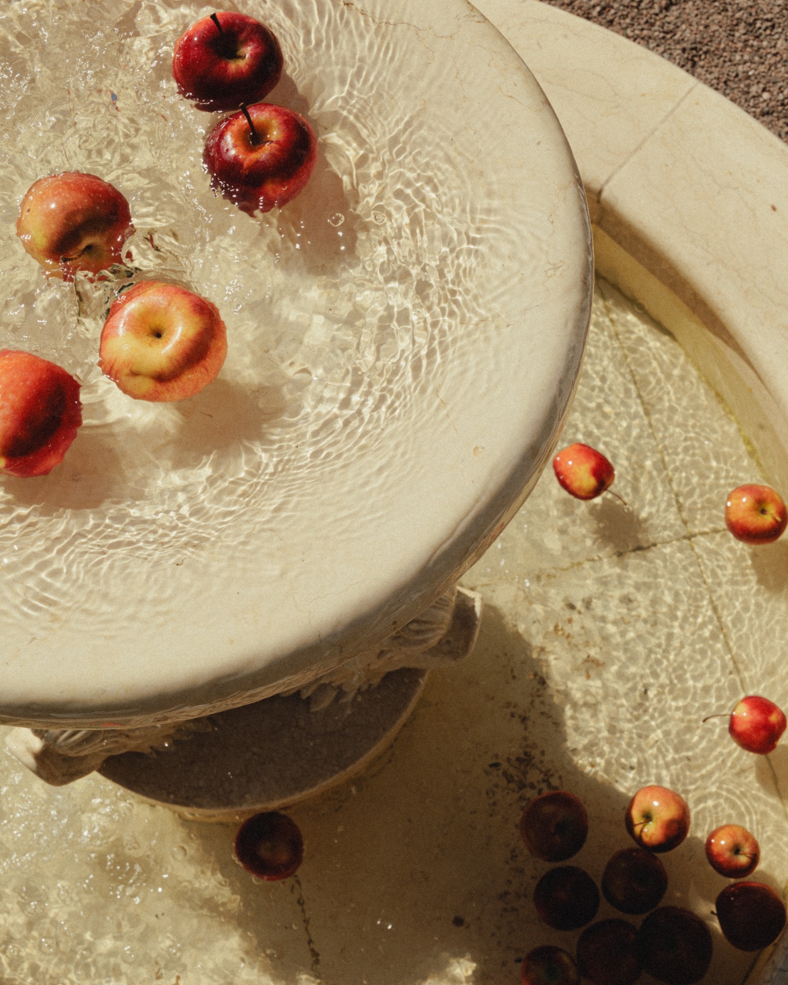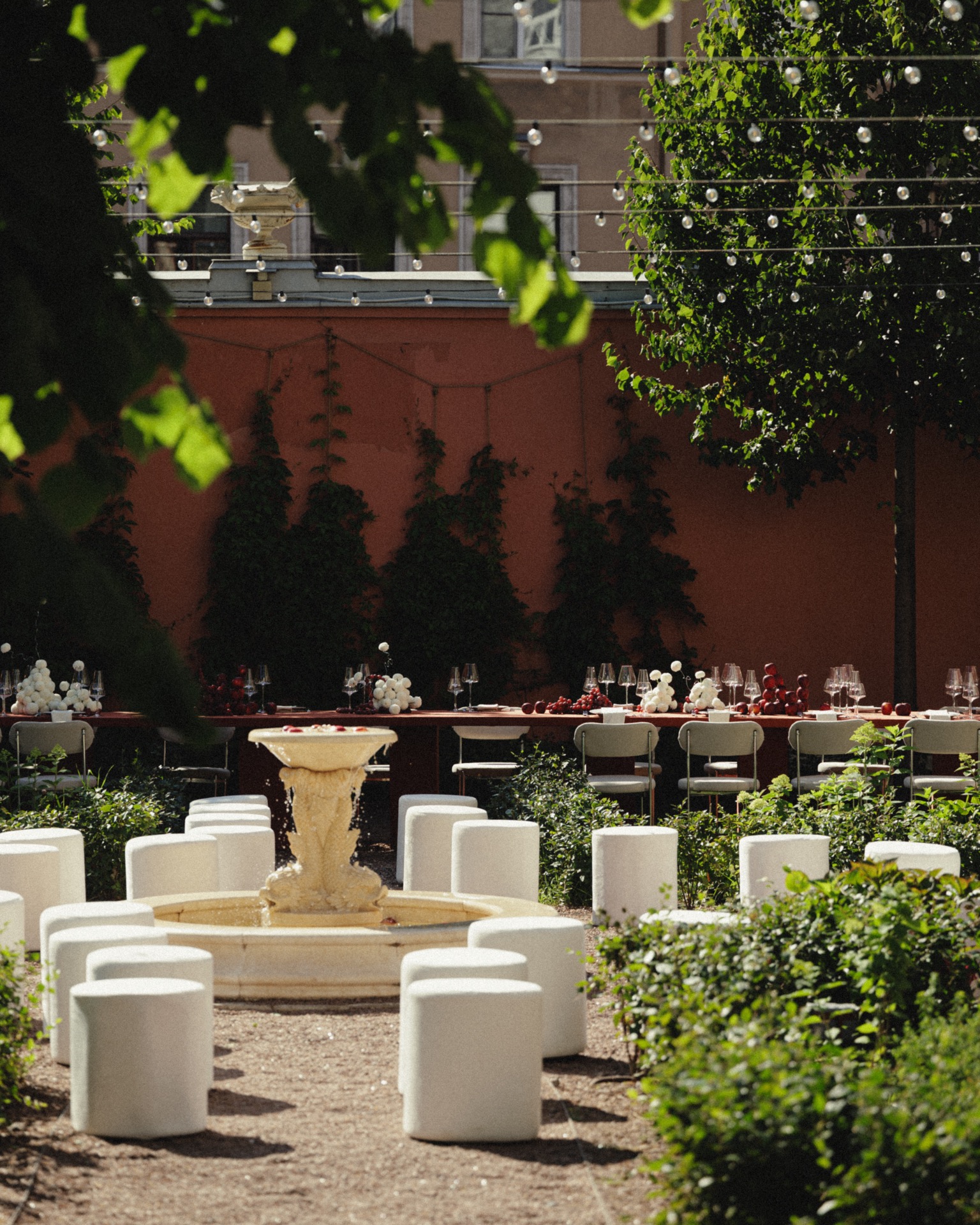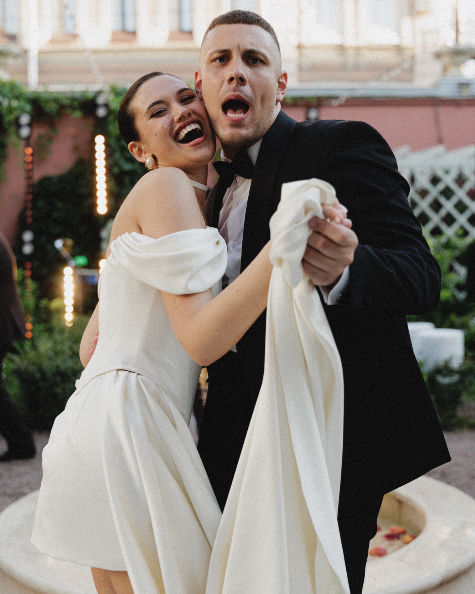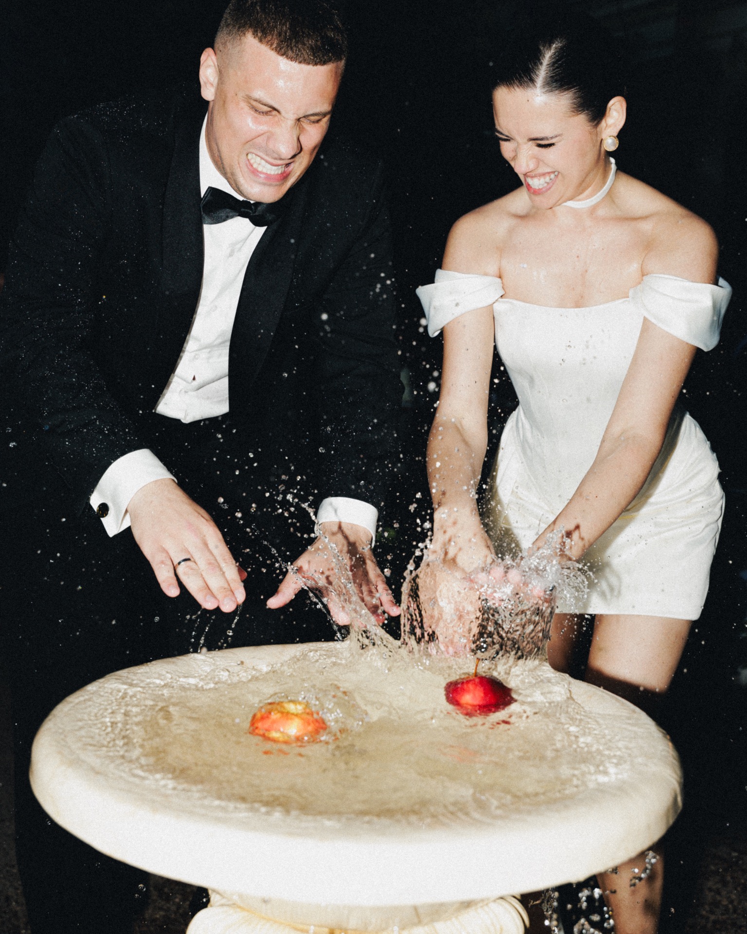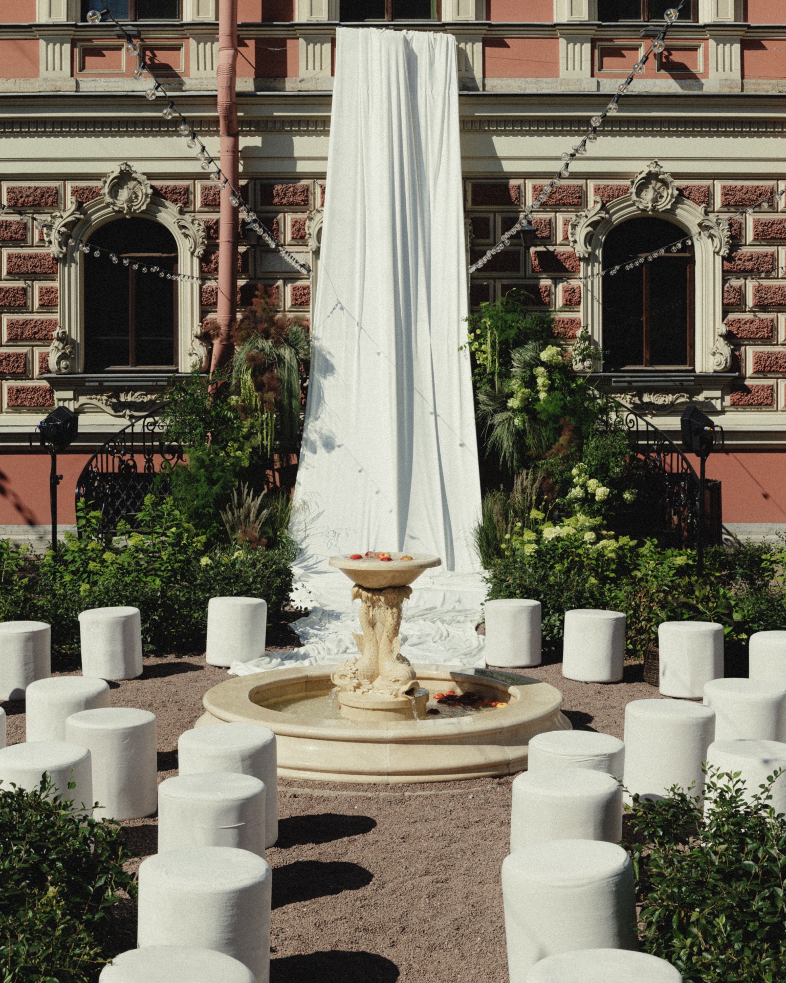 Наша свадьба получилась невероятно эстетичной, именно об этом мы мечтали. Мы решили отказаться от первого танца и вместо него вместе исполнили песню Анны Герман «Мы эхо». Вторая половина вечера была по-настоящему зажигательной: мы сняли обувь и танцевали прямо в фонтане с яблоками, весело плескаясь в воде.