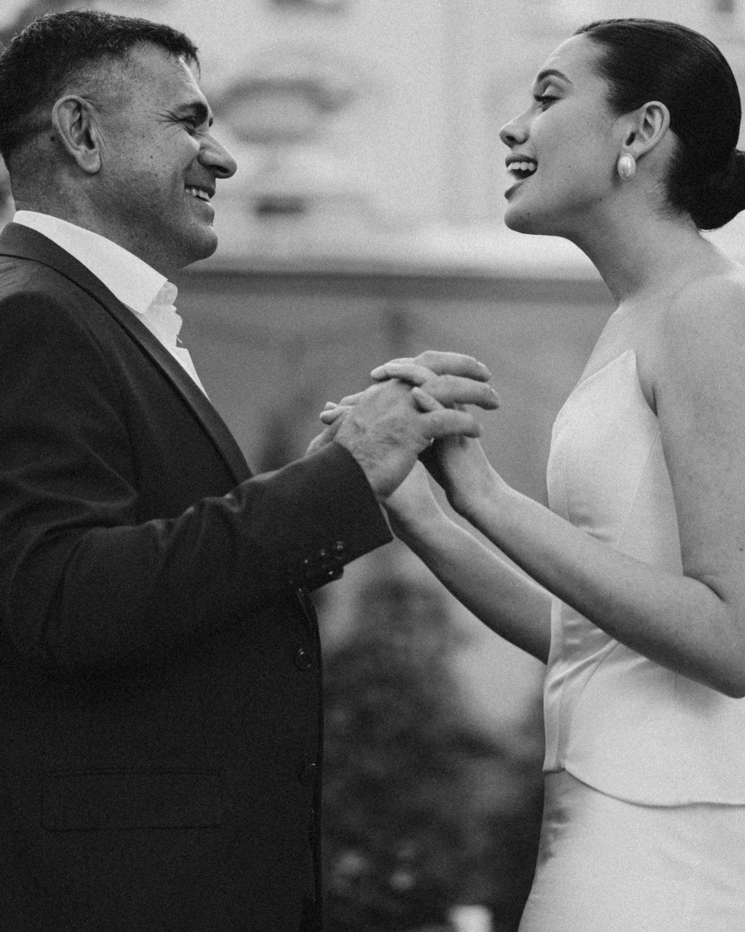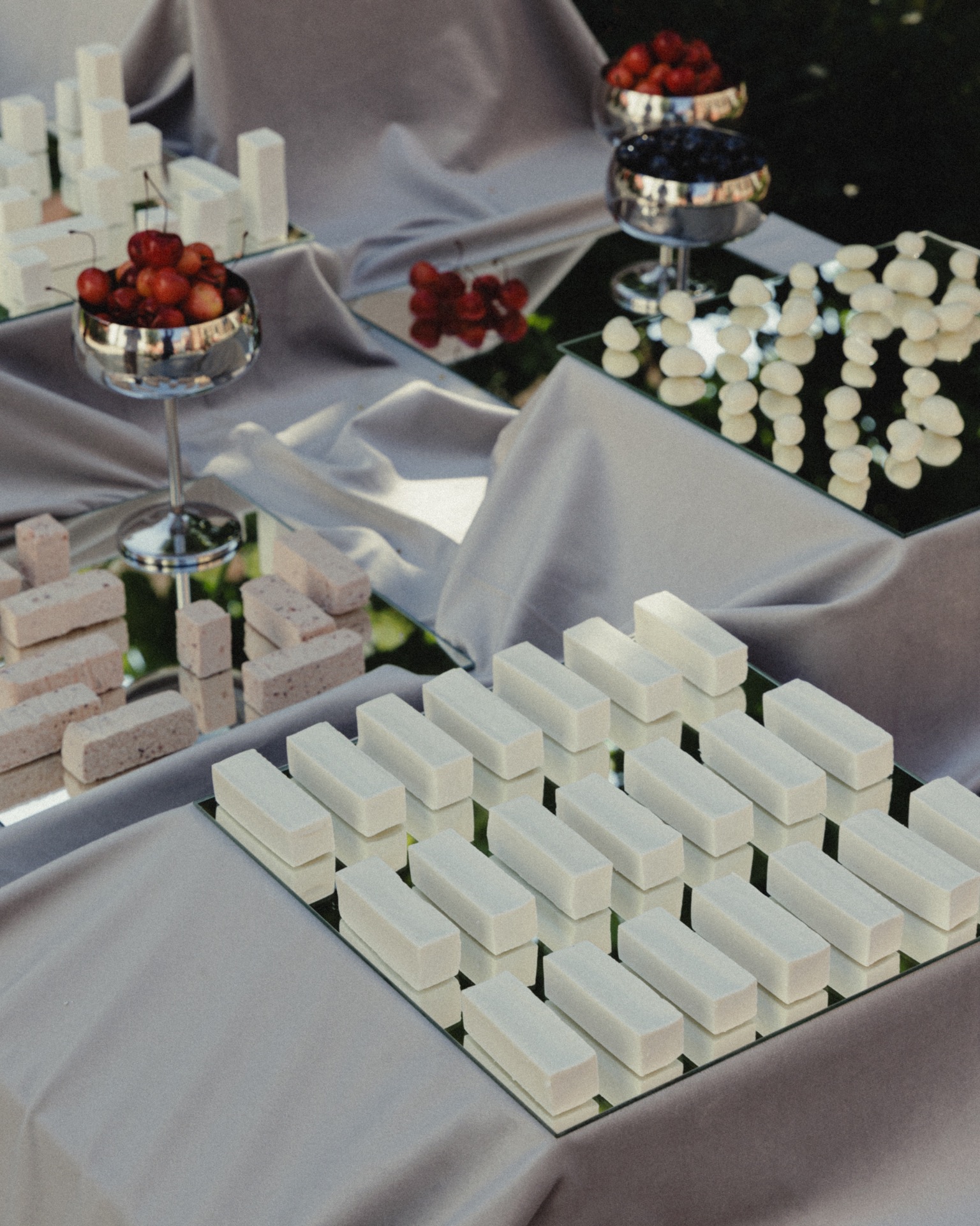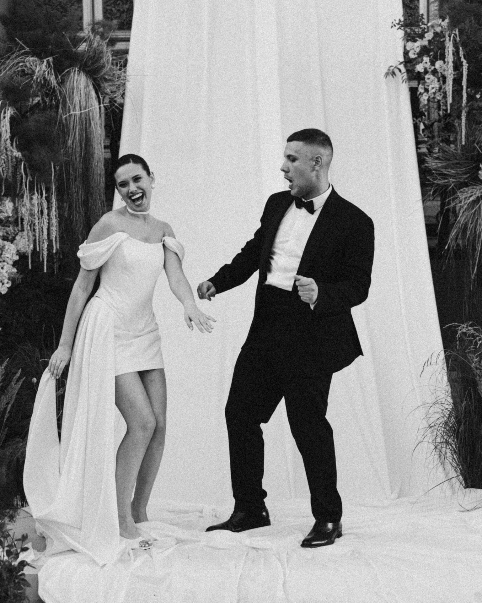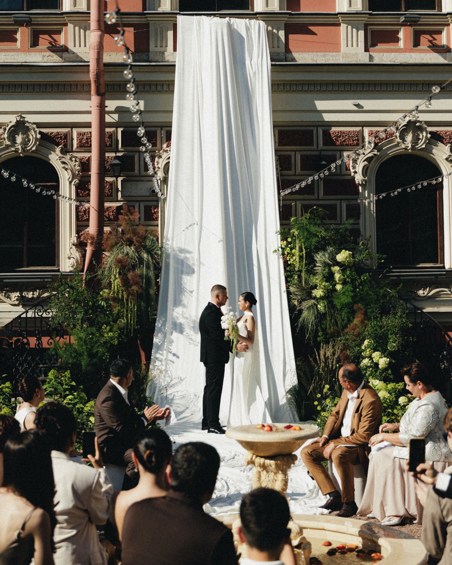 Наша свадьба получилась невероятно эстетичной, именно об этом мы мечтали. Мы решили отказаться от первого танца и вместо него вместе исполнили песню Анны Герман «Мы эхо». Вторая половина вечера была по-настоящему зажигательной: мы сняли обувь и танцевали прямо в фонтане с яблоками, весело плескаясь в воде.