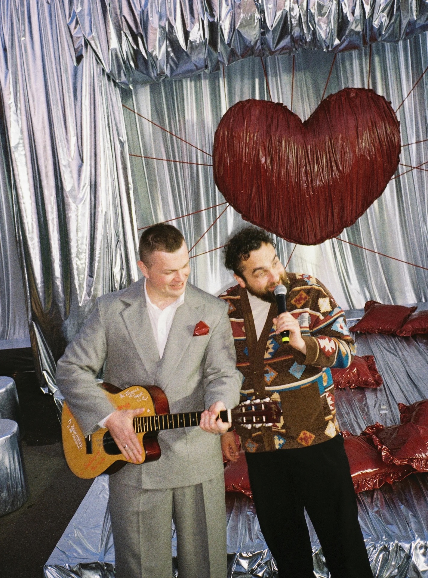 Кольца для нас выносил курьер «Яндекс Лавки», ведь мы и дня прожить не можем без заказа из этого сервиса. А Витя вместо классического бросания бутоньерки разбил гитару с написанными на ней минусами холостяцкой жизни и кинул гриф друзьям.