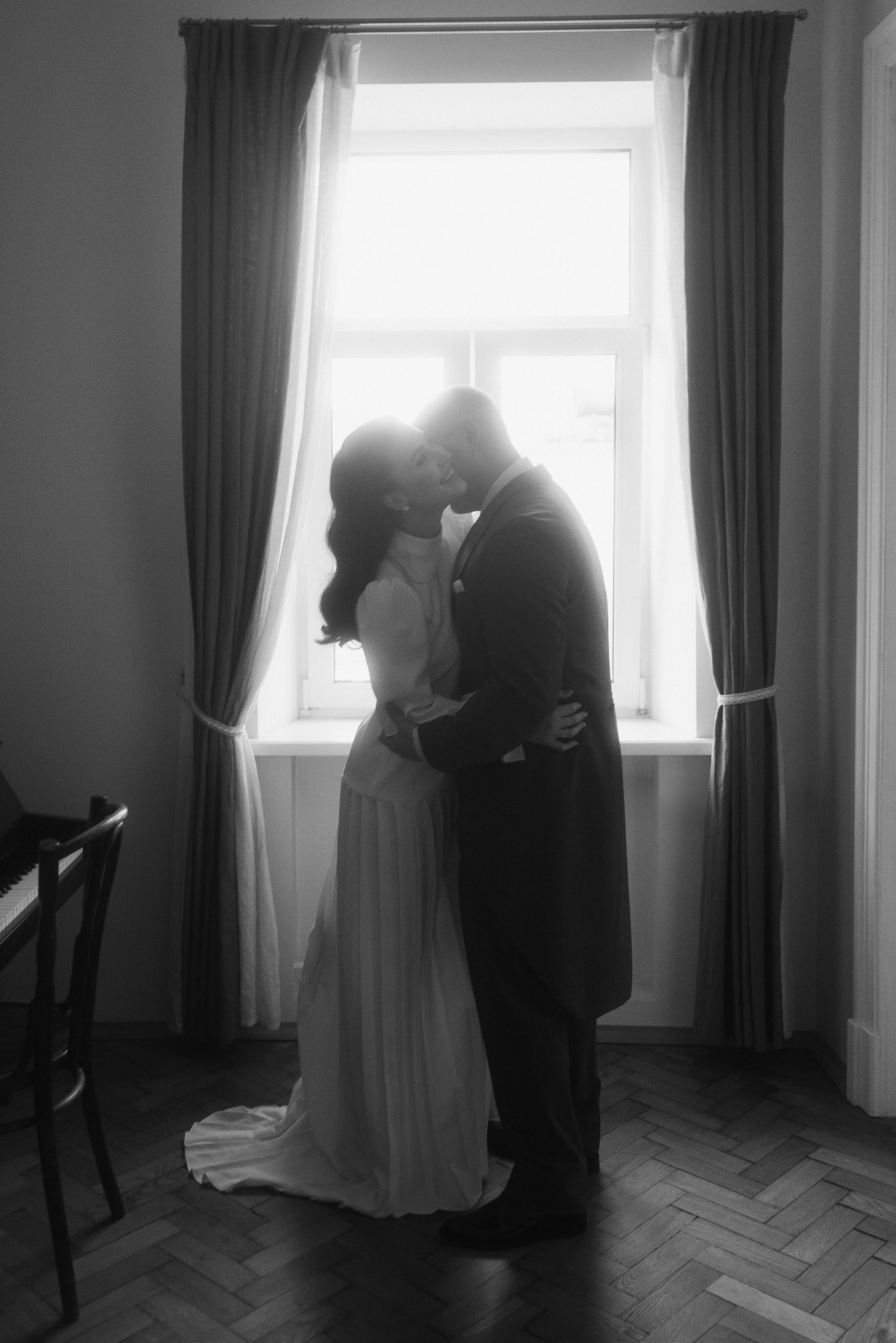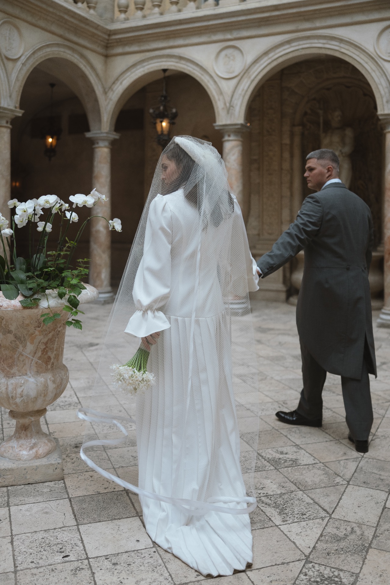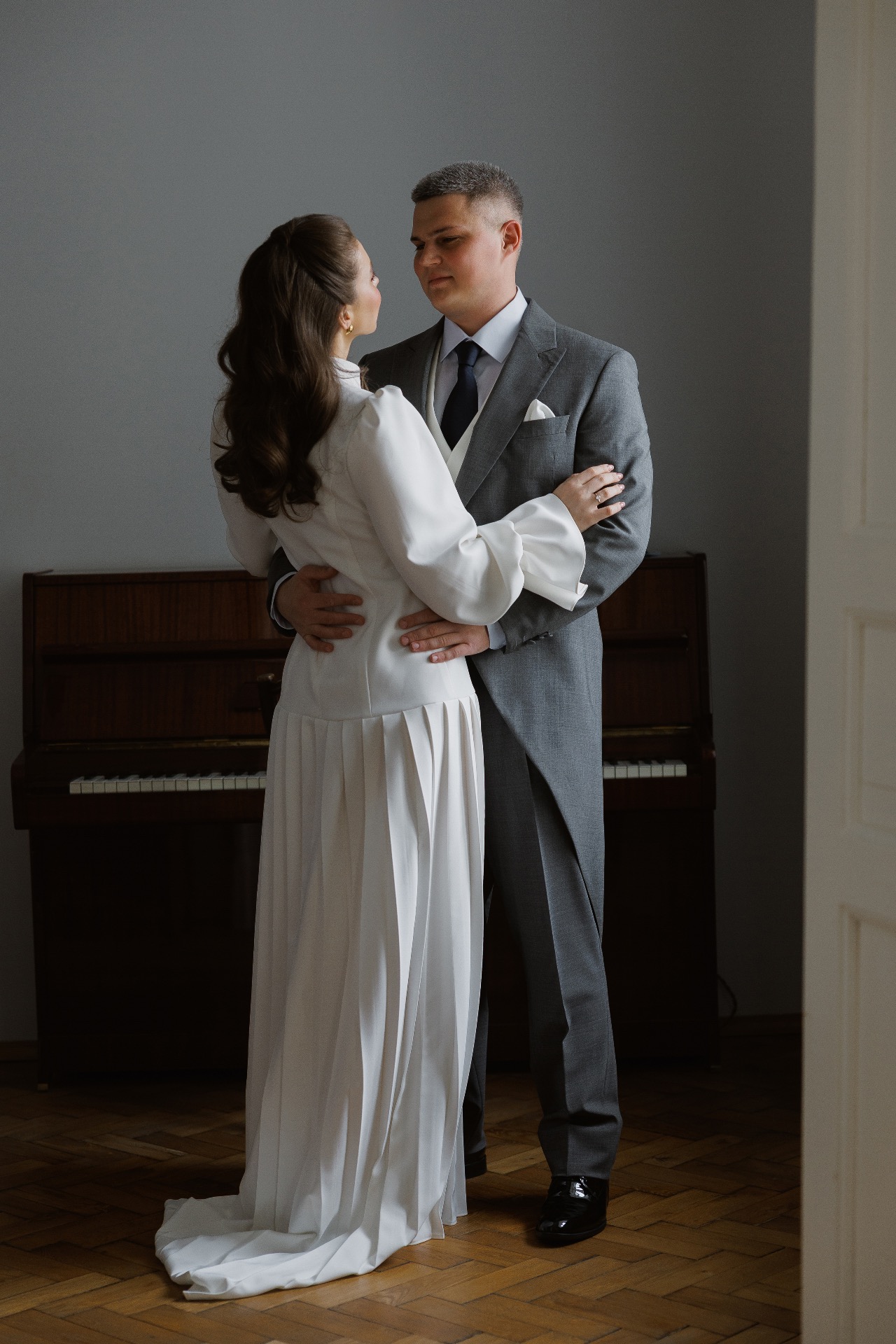 С образом Олега всё было немного проще. Мы приехали в магазин с чётким пониманием, что классический смокинг — не наш вариант. Наша свадьба была с флером винтажной эстетики, и мы решили, что будет интересно обыграть это в деталях. Так в основе его образа появился фрак-визитка, к которому мы пошили жилет с шалевым лацканом в цвет моего платья для большей торжественности, а также подобрали белую рубашку с явным голубым подтоном и тёмно-синий галстук для выраженной контрастности. Получившийся образ идеально вписался в общую концепцию.