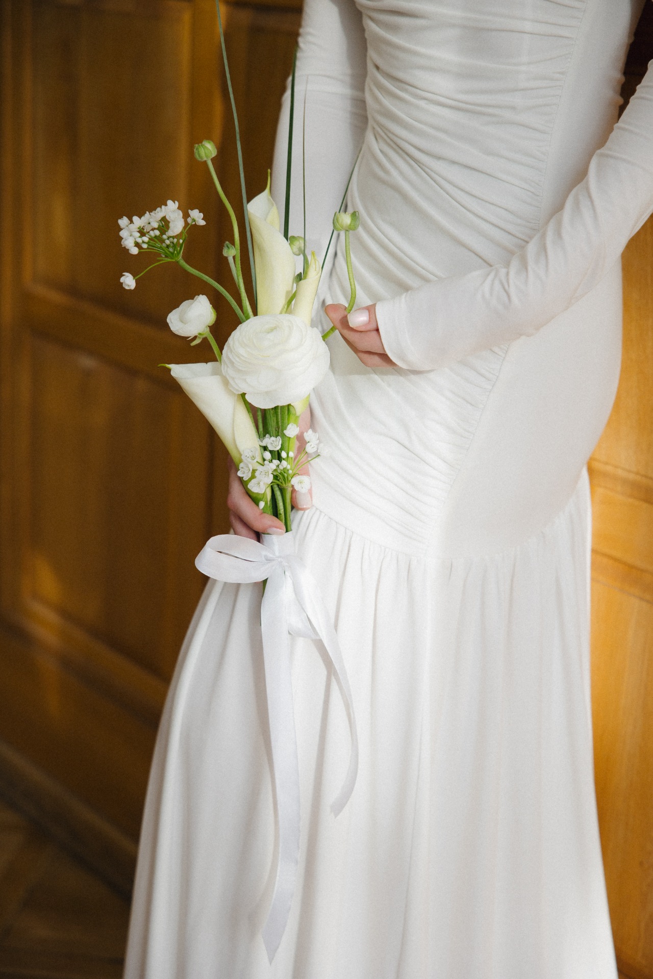 Я долго искала платье во многих популярных свадебных ателье, но никак не находила то самое, которое бы отражало мой стиль и задумку. Вдохновившись одной моделью в небезызвестном салоне, я попросила знакомую швею сшить похожий вариант, который бы идеально сидел на мне. Так мы шили его на протяжении двух месяцев, и каждый раз я всё больше убеждалась, что это была отличная идея. Сумочку из остатков ткани мне сшила мама, получилась стильная и трогательная деталь с историей.