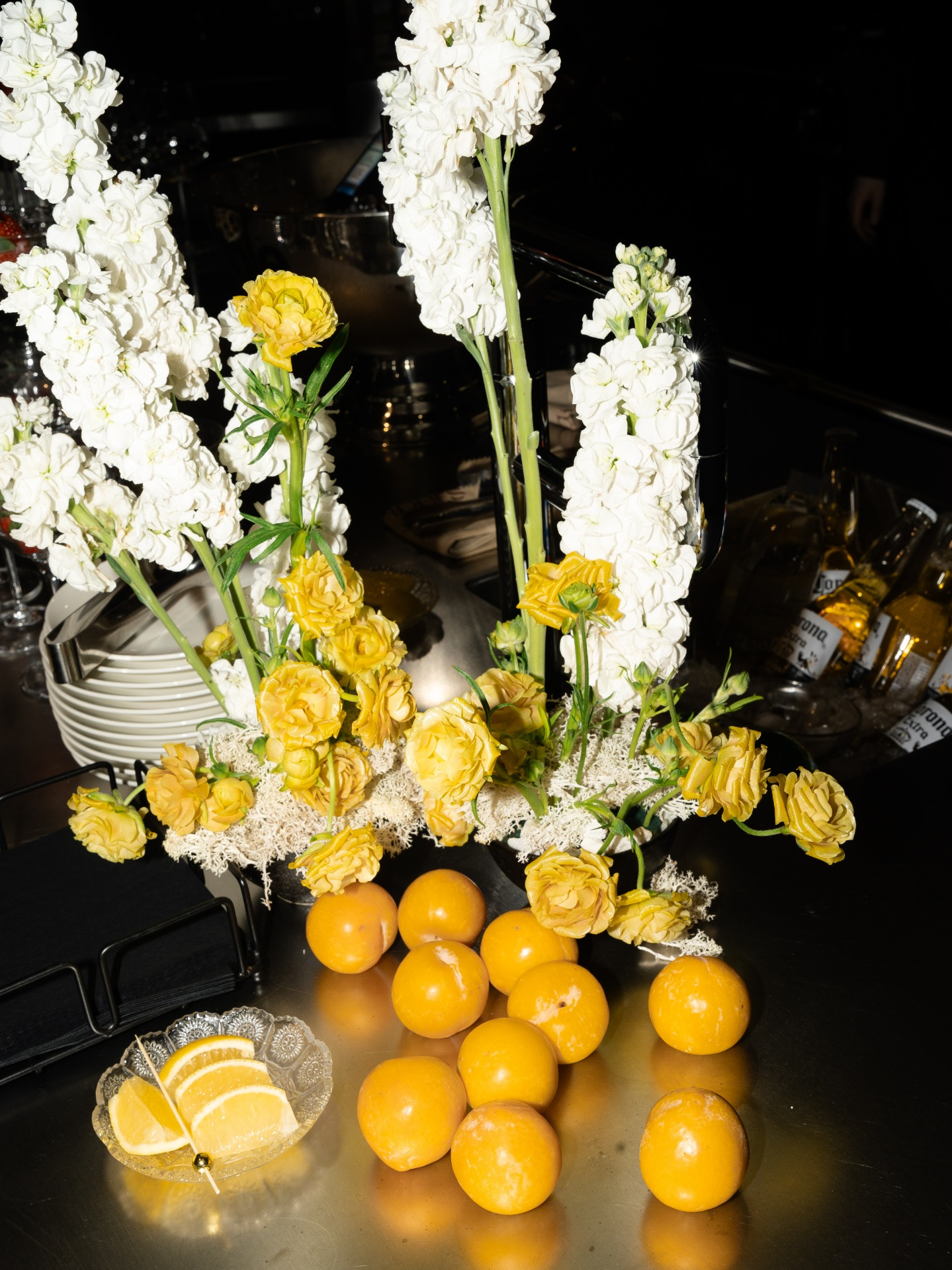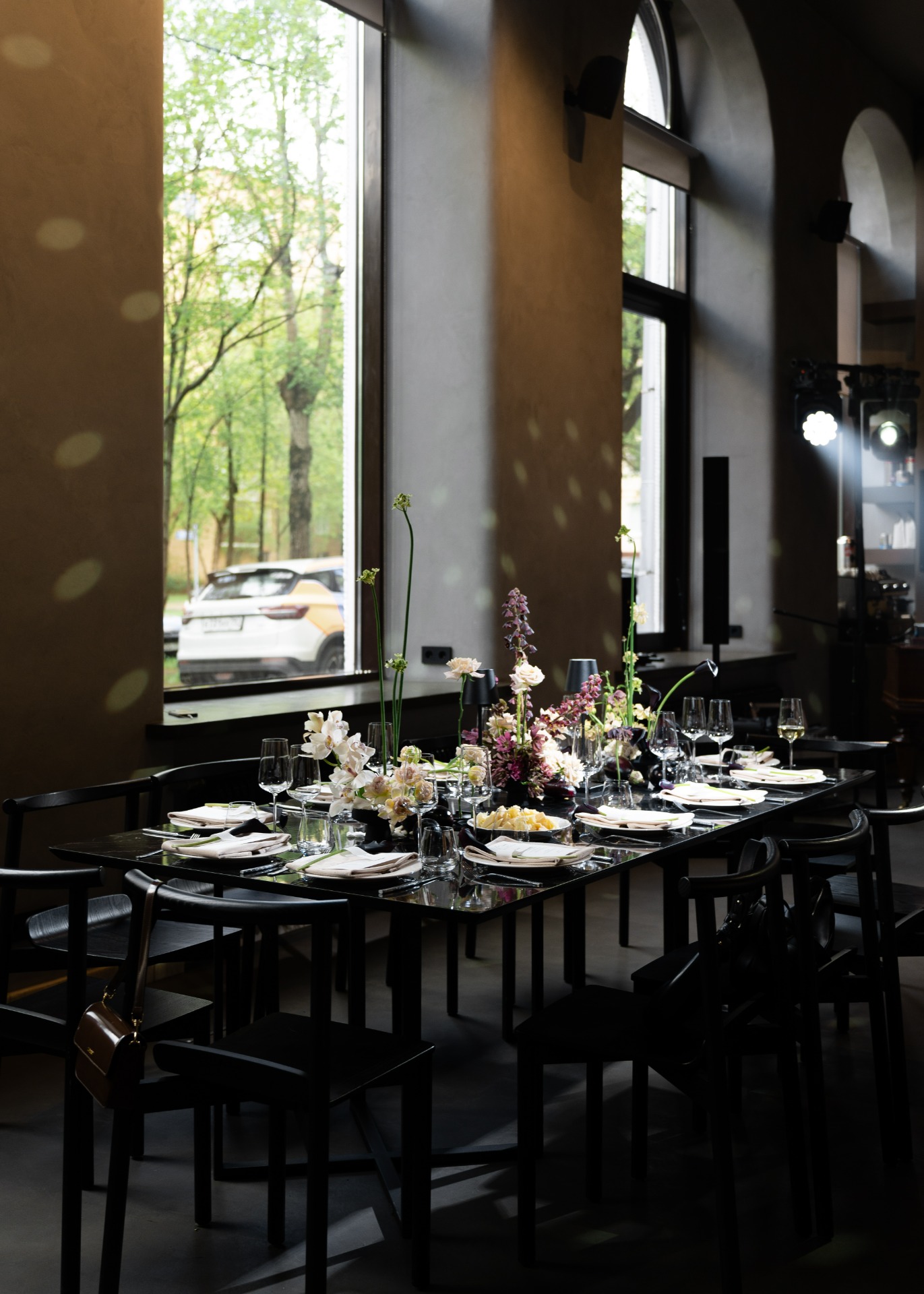 Флористика дополняла стиль пространства, она была в тёмных тонах с элементами бежевого и белого.