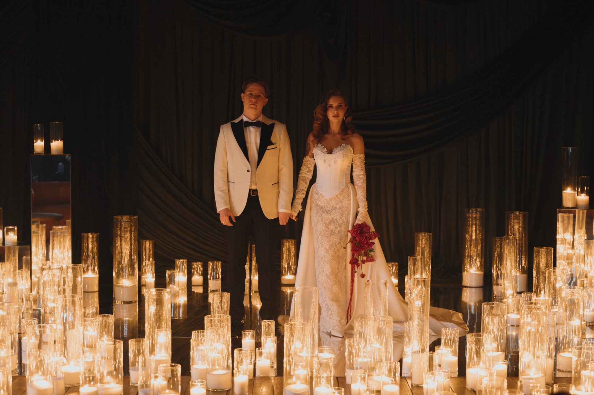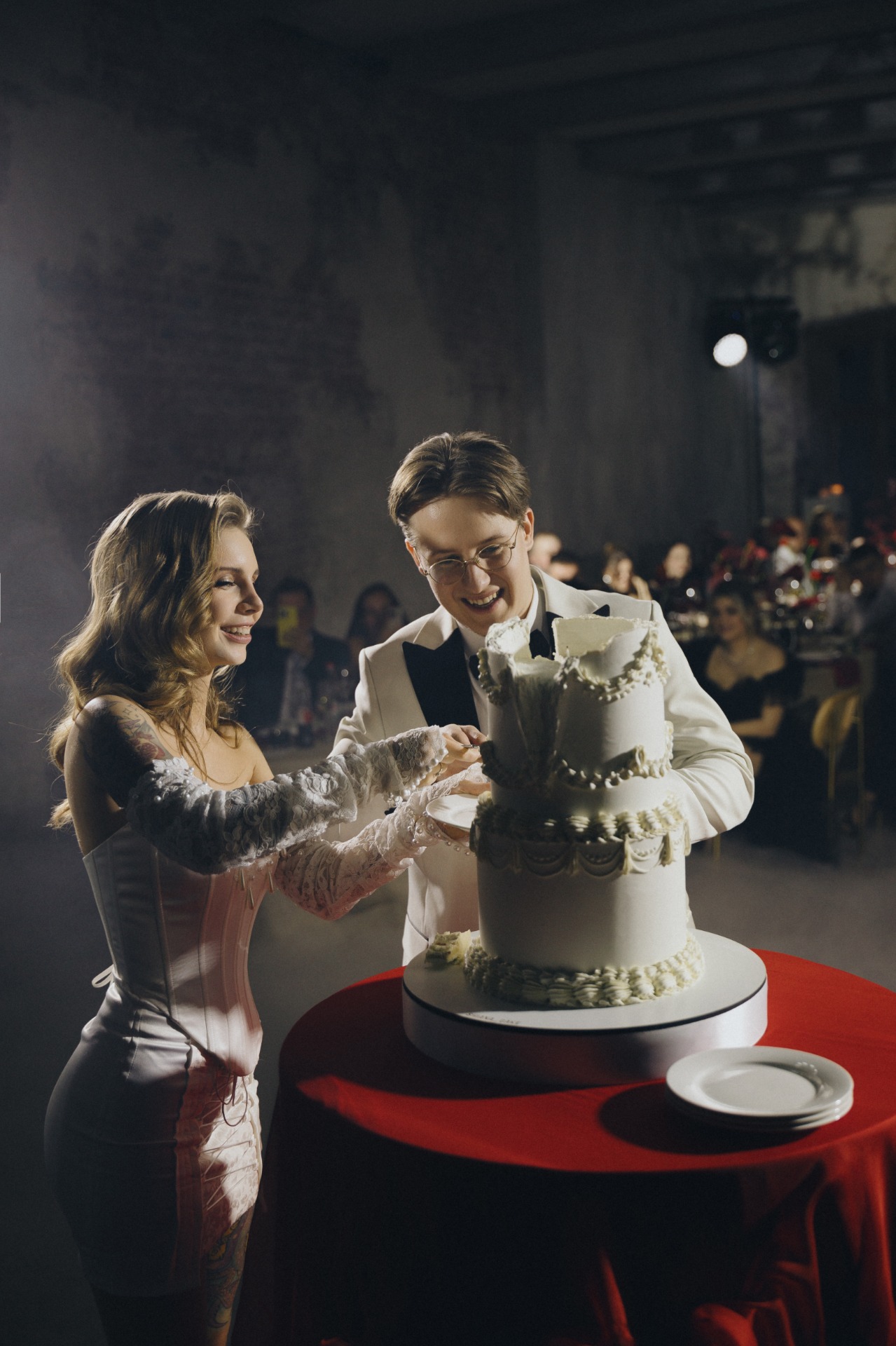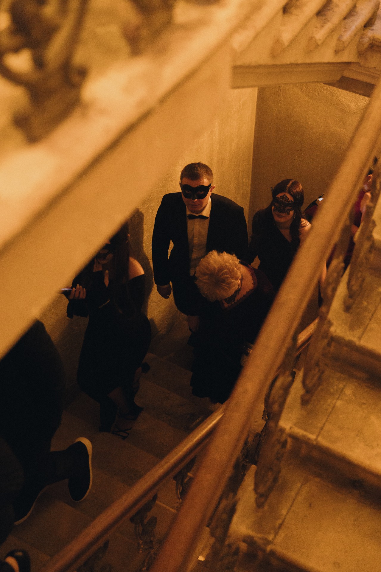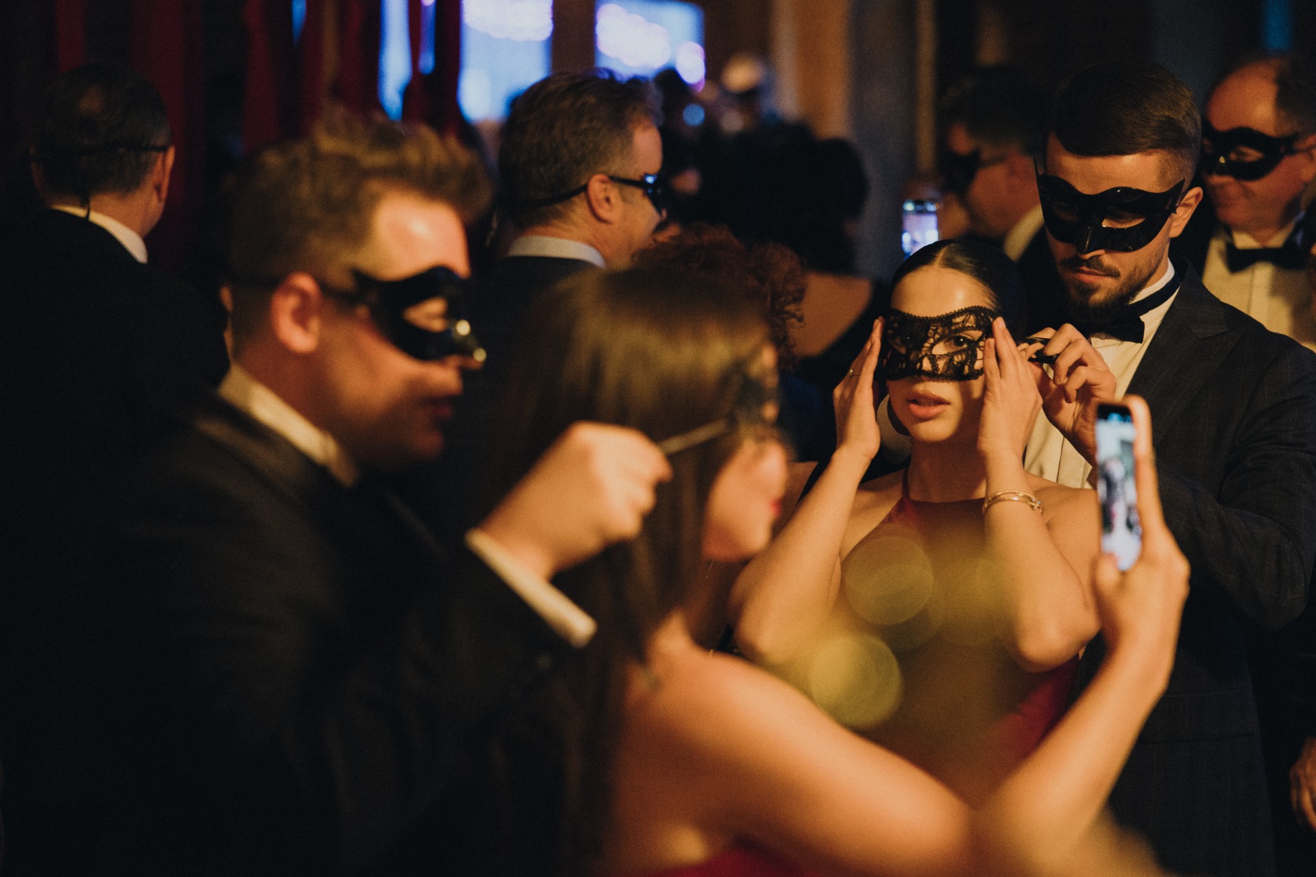 При входе каждый гость приносил ключ, полученный вместе с приглашением. Он открывал ячейку с двумя карнавальными масками для пары. В масках гости проходили на церемонию, чтобы скрыть эмоции во время трогательных моментов.