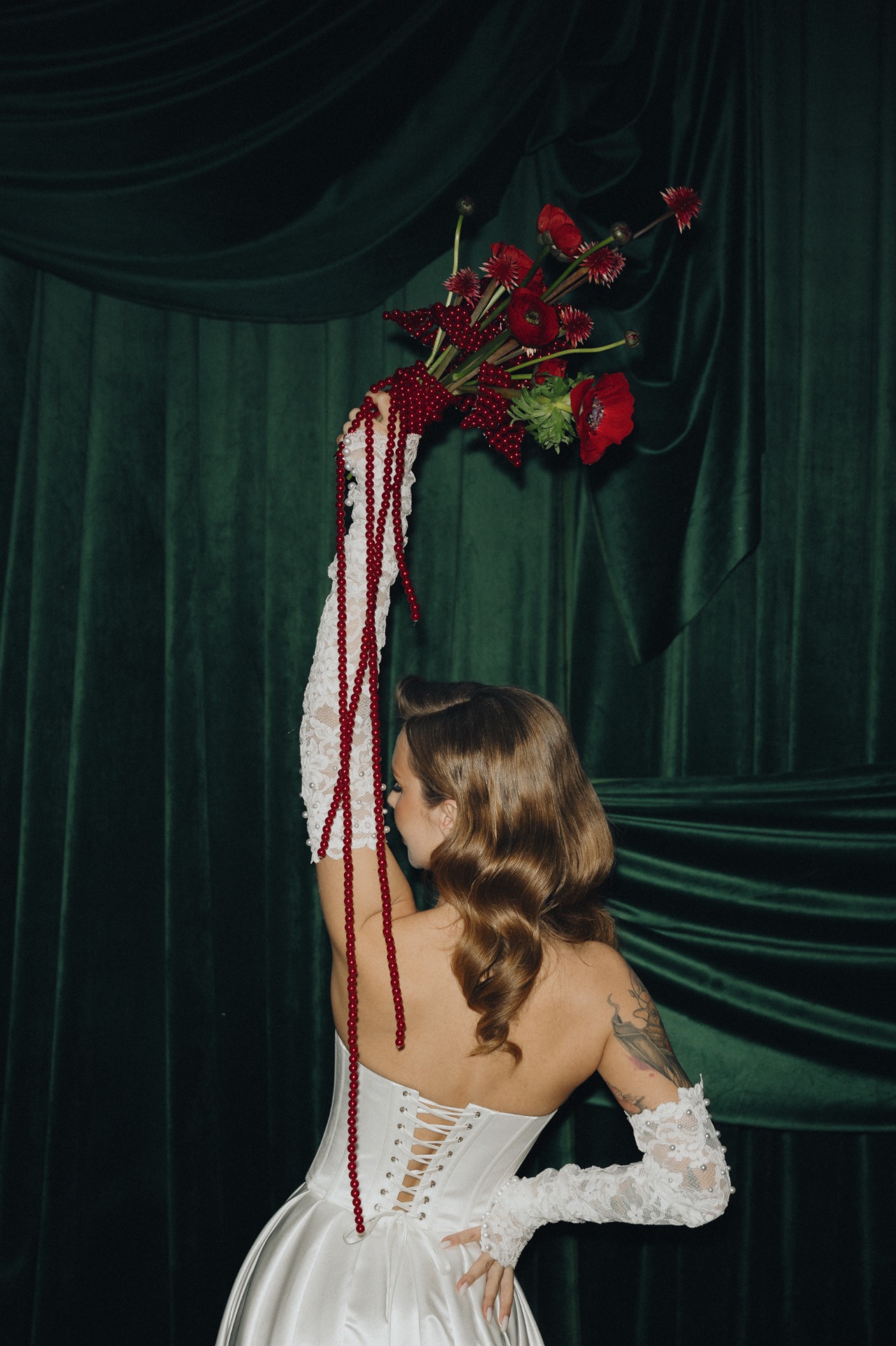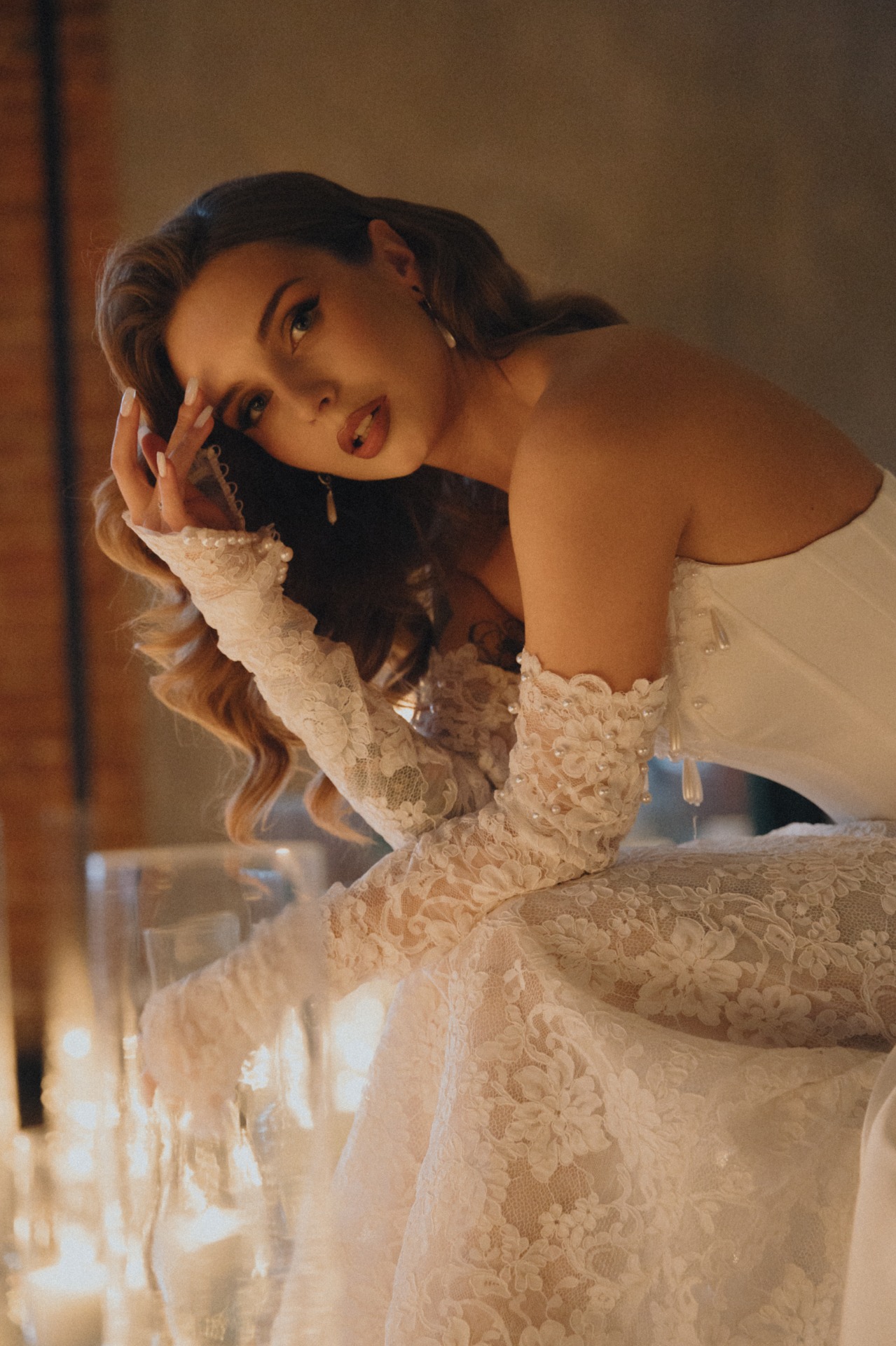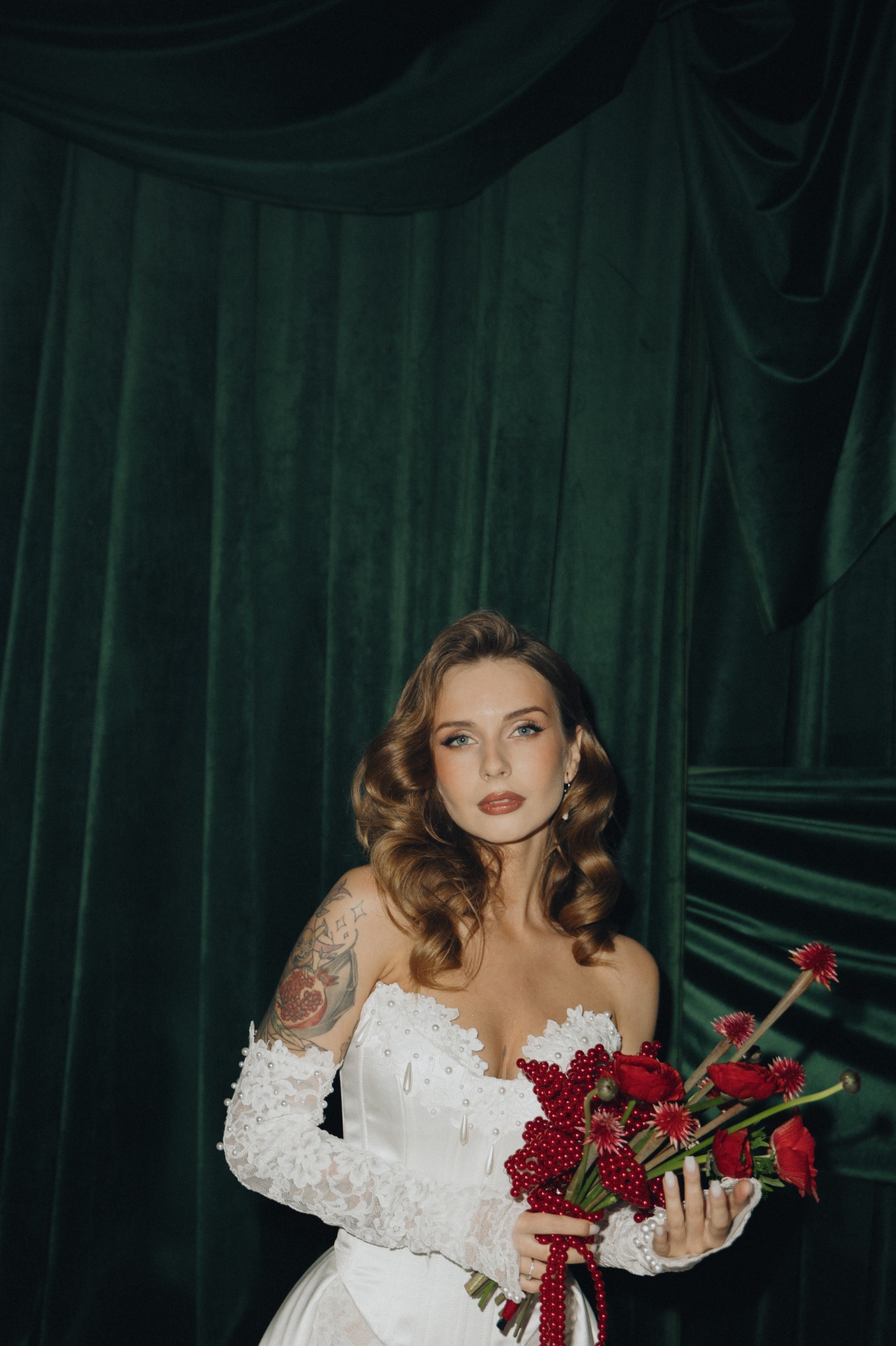 Вероника выбрала для себя кружевное платье, подчёркивающее её творческий характер. Образ дополняли атласный корсет с жемчужными бусинами и кружевные перчатки. Фата длиной три метра также была украшена кружевной вышивкой.