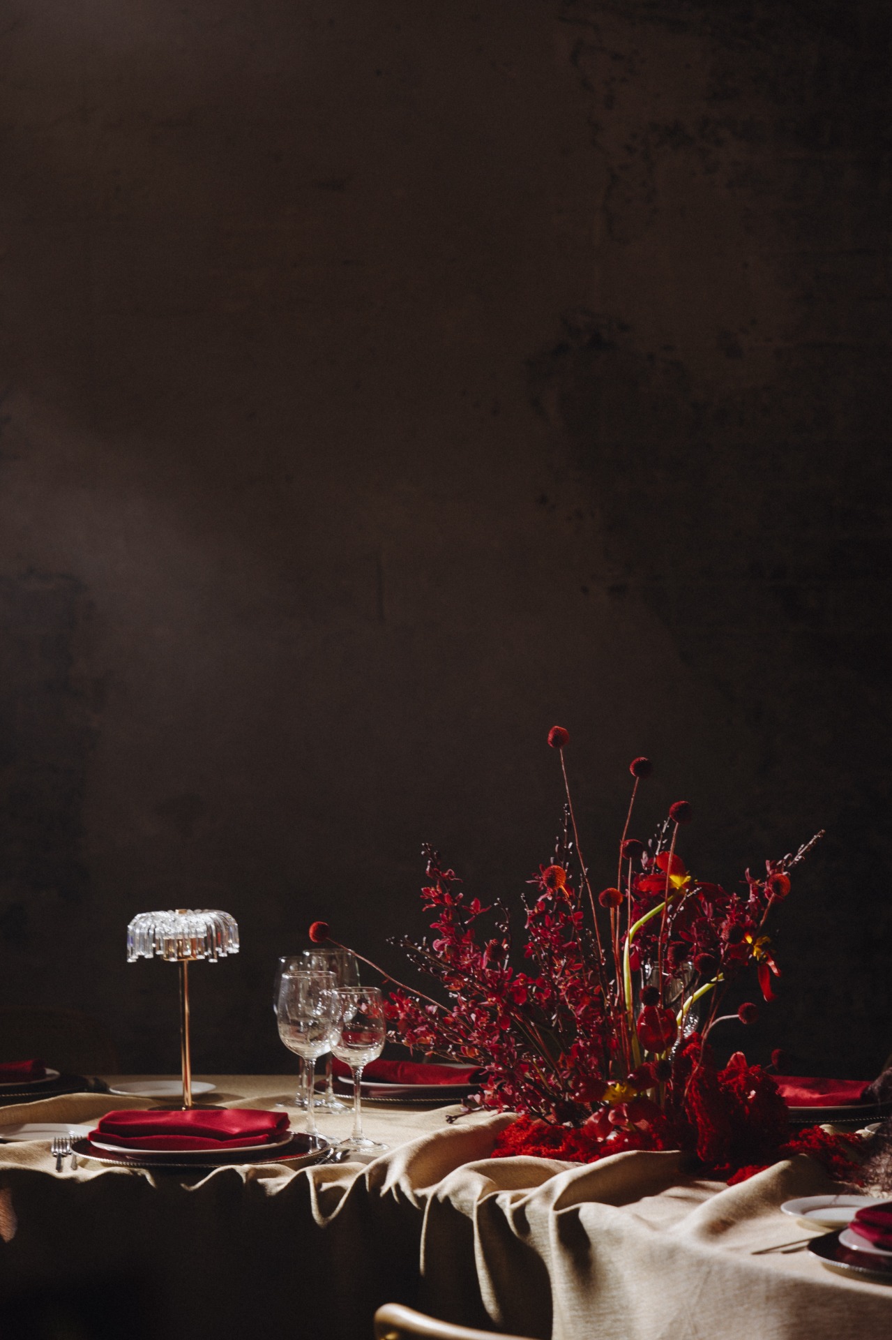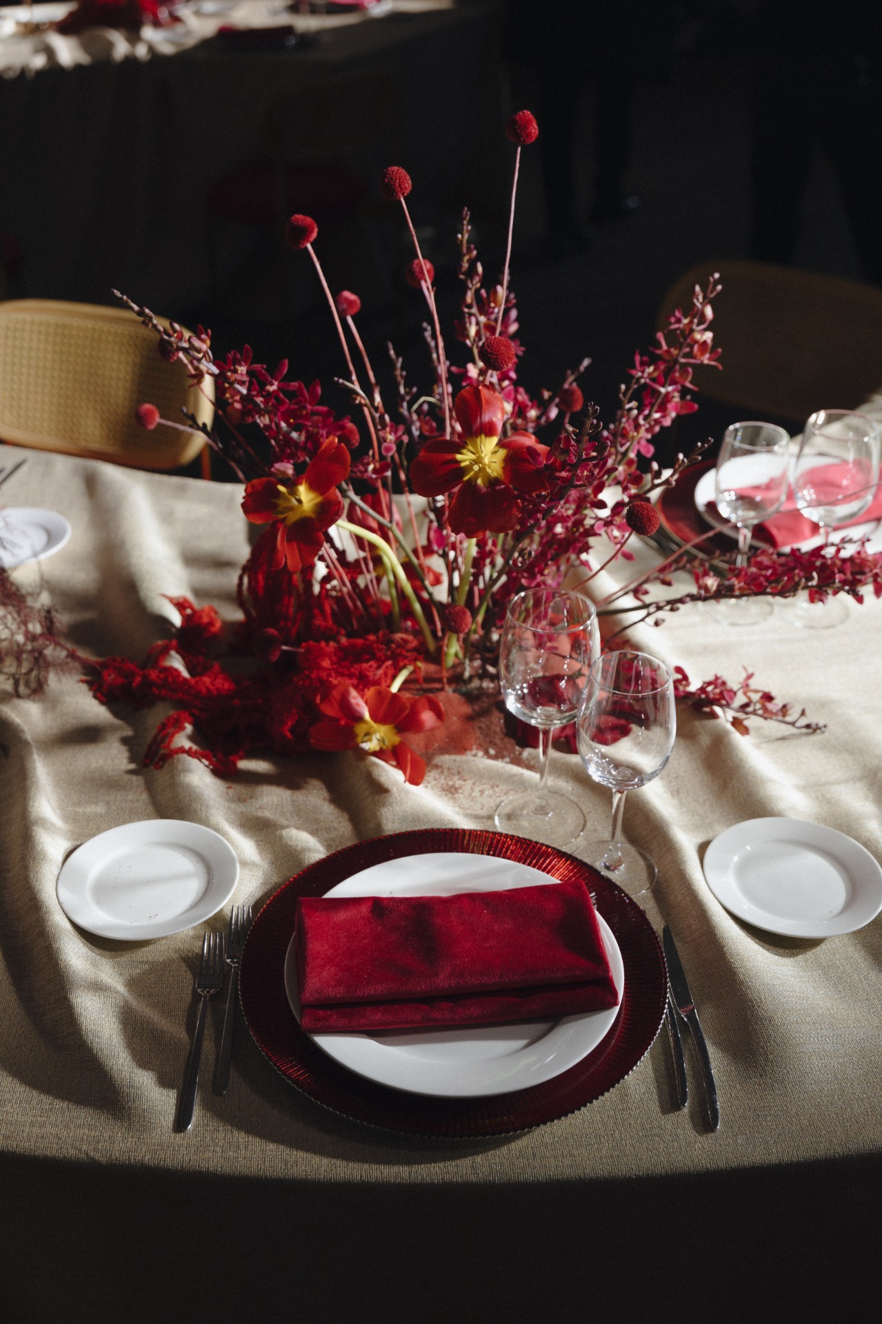 В оформлении мы использовали сочетание островной темы и зимнего настроения. Основу декора составили плотные ткани и глубокие, насыщенные цвета — красный, синий и зелёный. Концепция прослеживалась во всех элементах вечера и формировала единый стиль праздника.