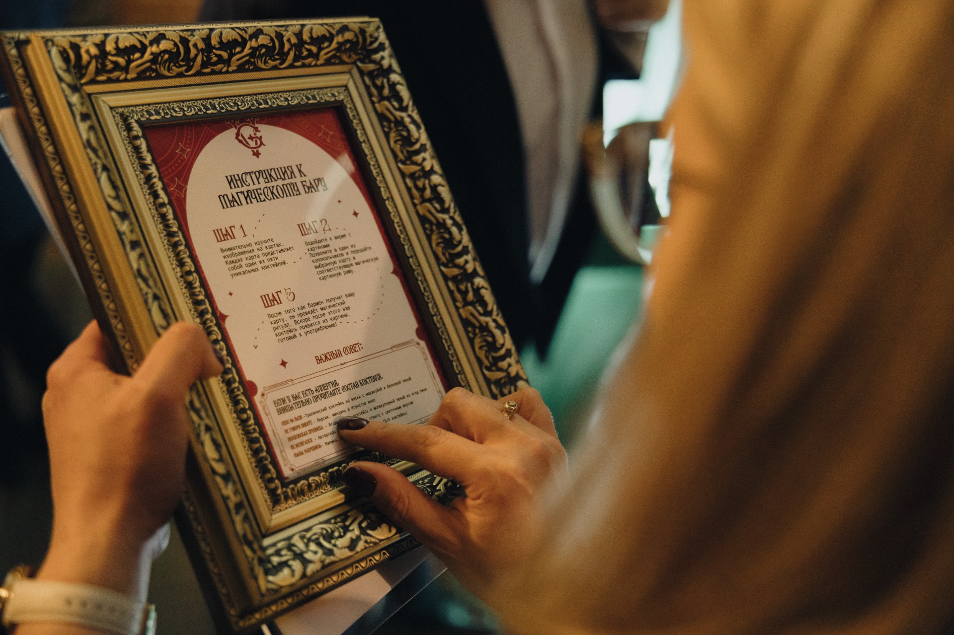 У входа приглашённых встречал карлик, который объяснял всем концепцию свадьбы. Здание состояло из нескольких этажей, и каждый из них был задействован в празднике: на первом этаже проходил банкет, а на втором работал волшебный бар. На стенах бара висели картины с отверстиями — в них нужно было вставить карту с изображением коктейля, по которой бармены готовили напиток.