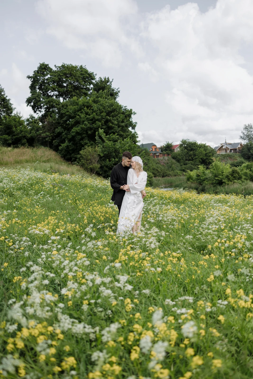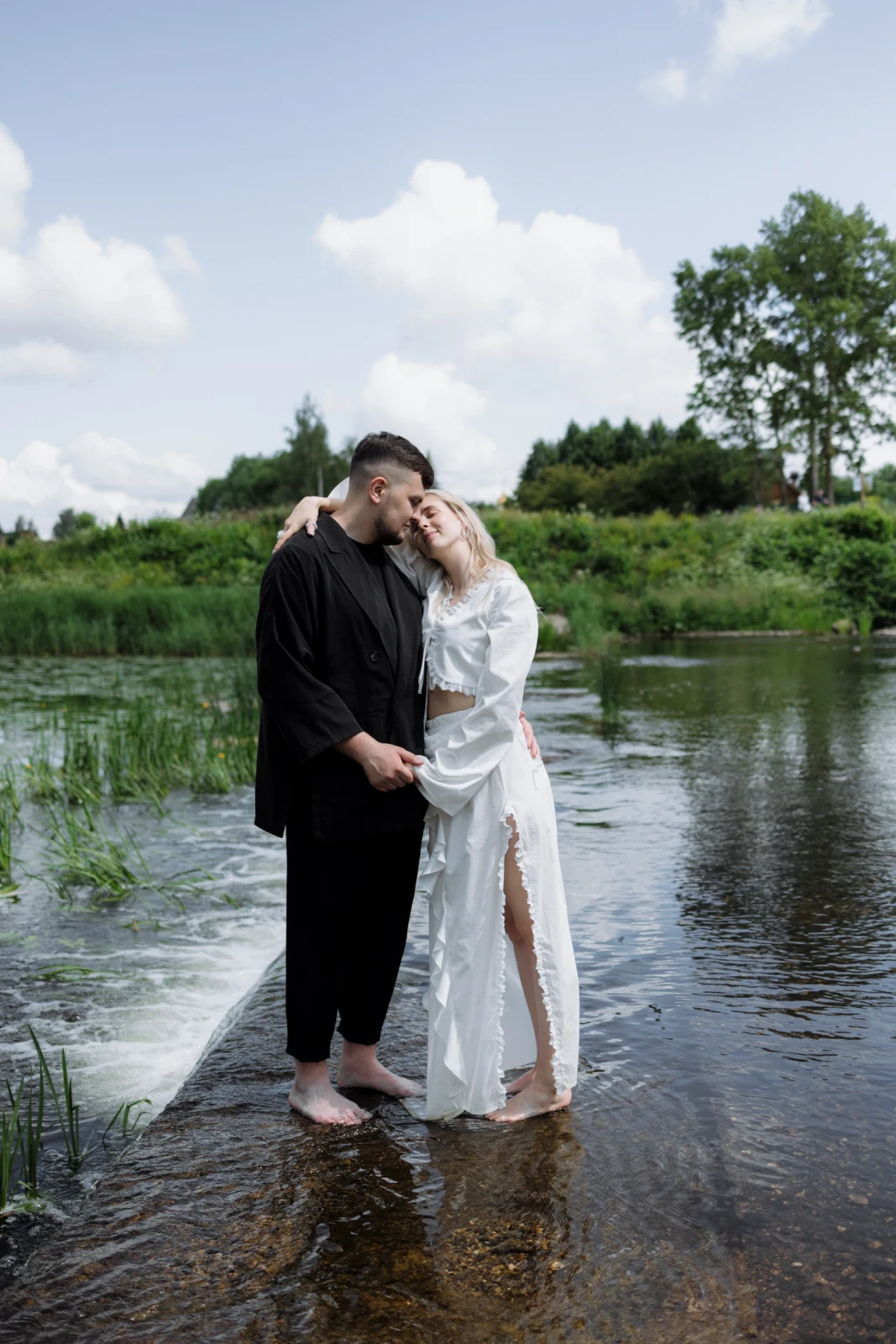 Для моего образа стилист Марина подготовила костюм из топа и юбки с кружевом от бренда Way camelia. Кружевная косынка и прозрачные аксессуары дополнили мой образ. Образ Артёма состоял из свободных брюк и рубашки чёрного цвета.