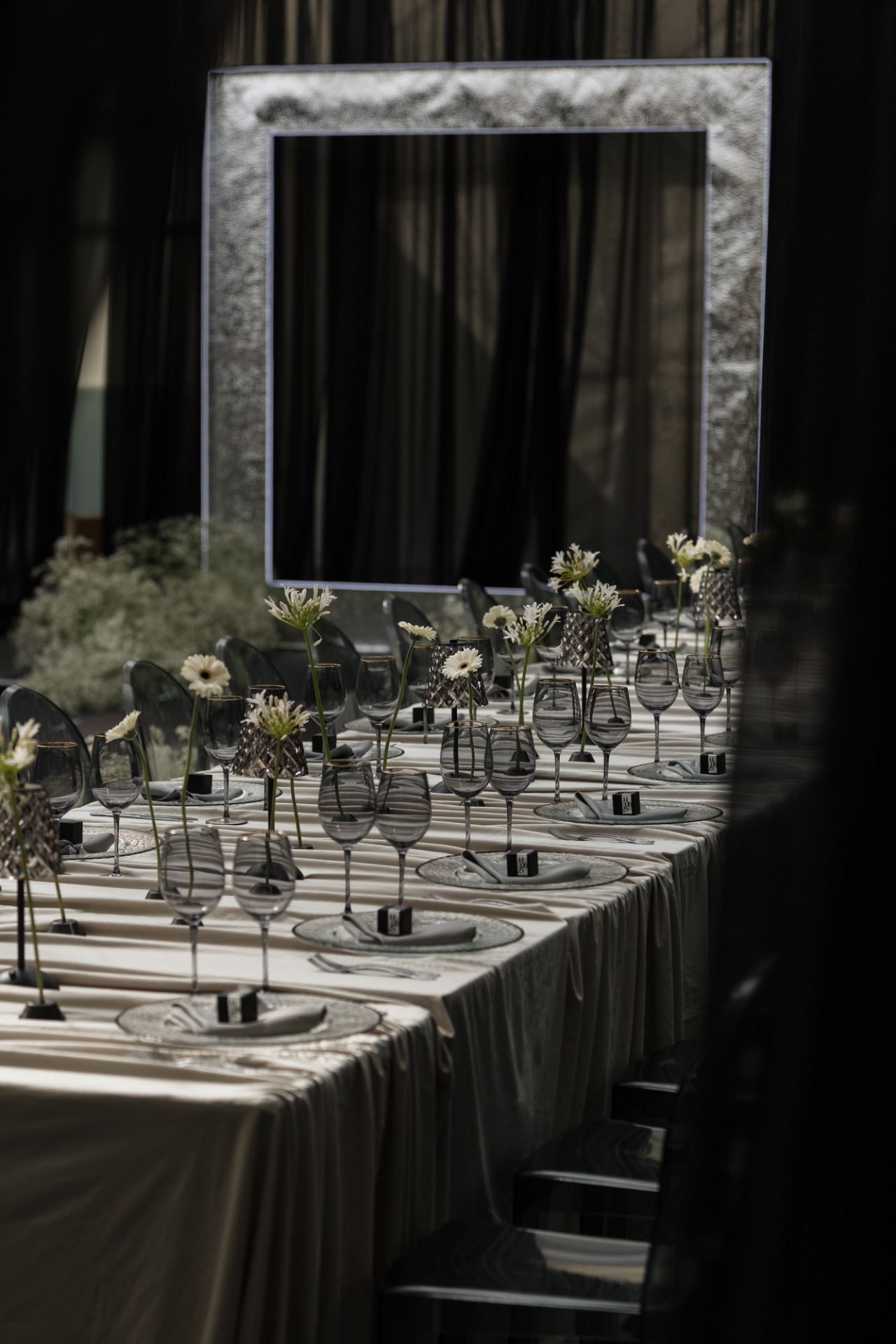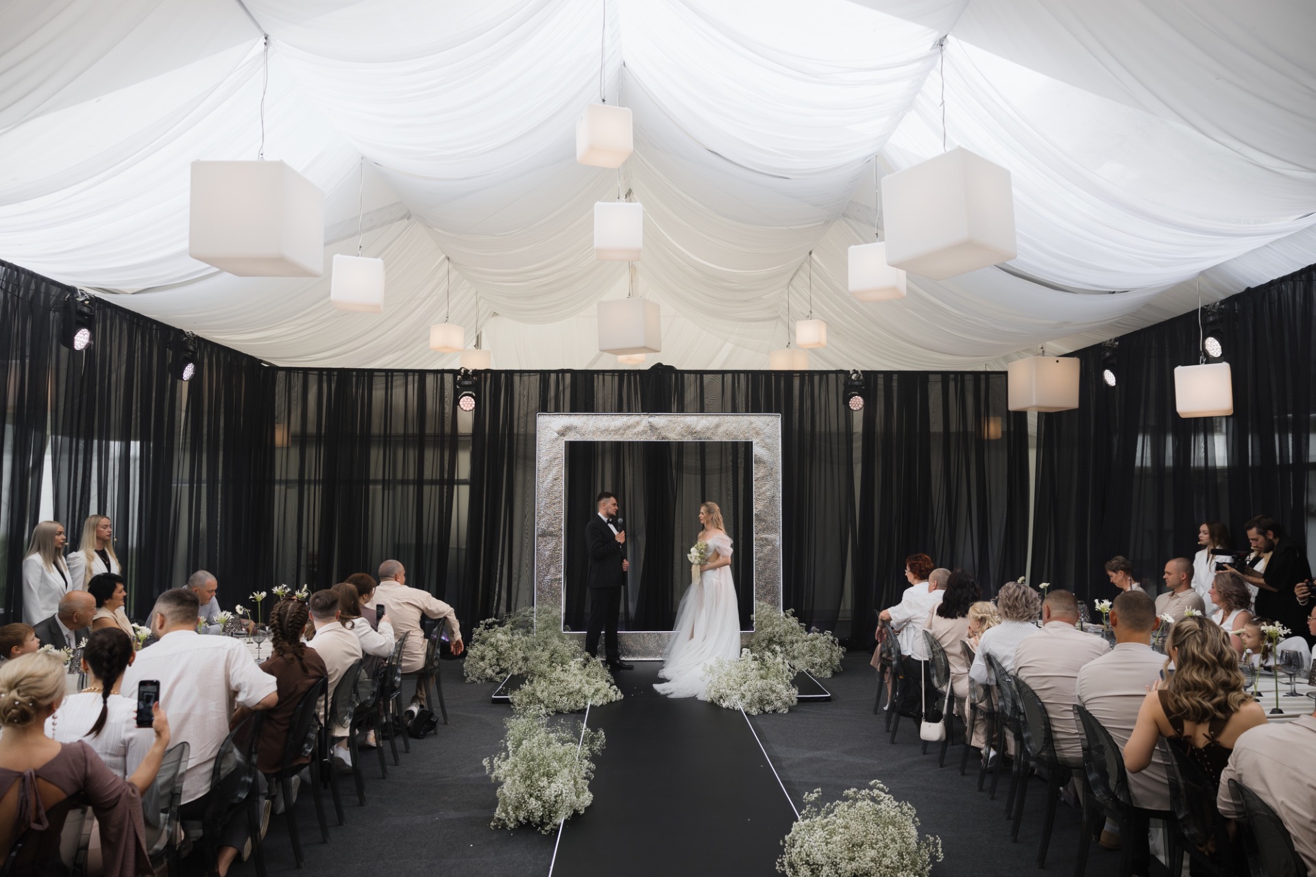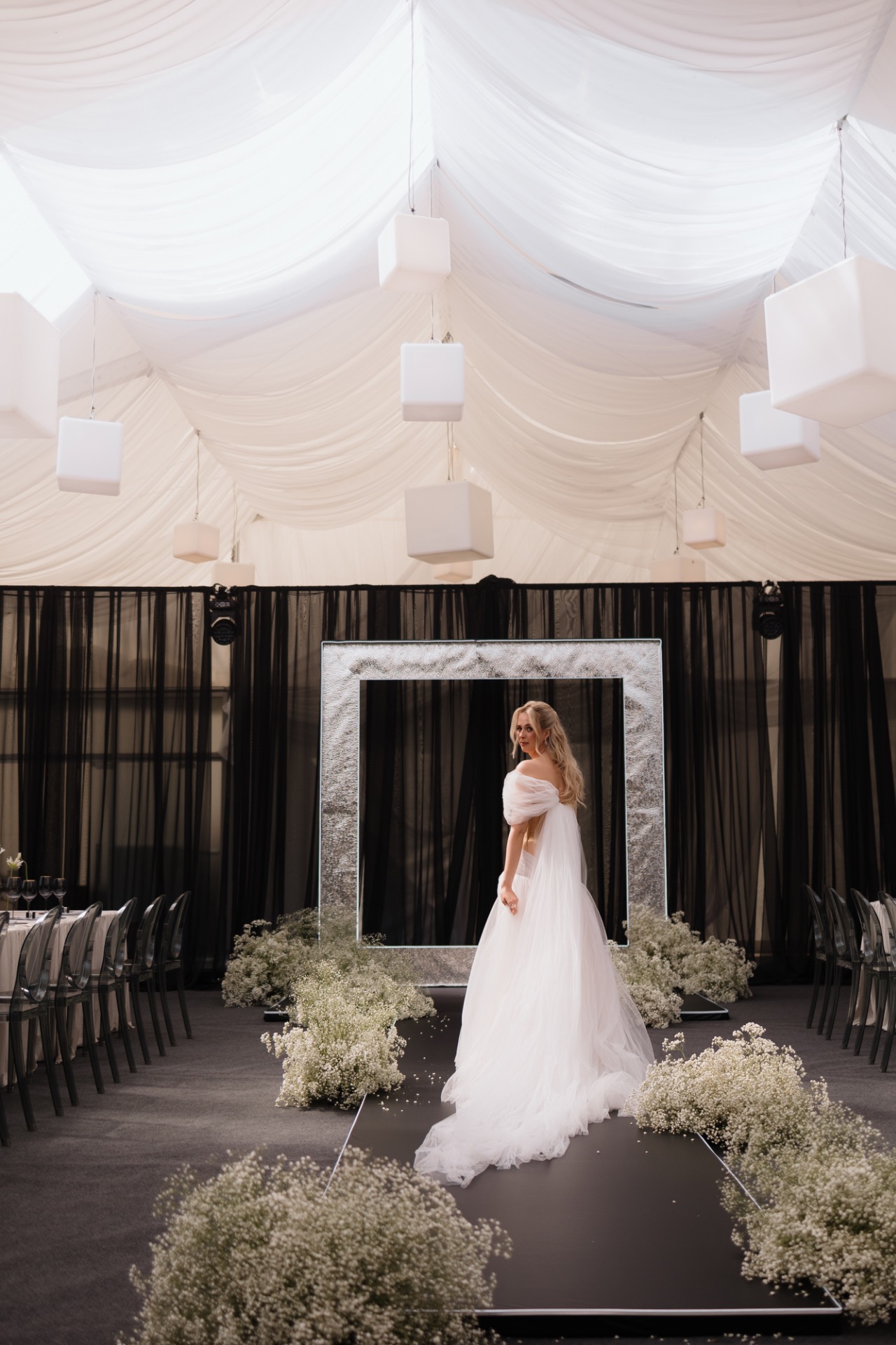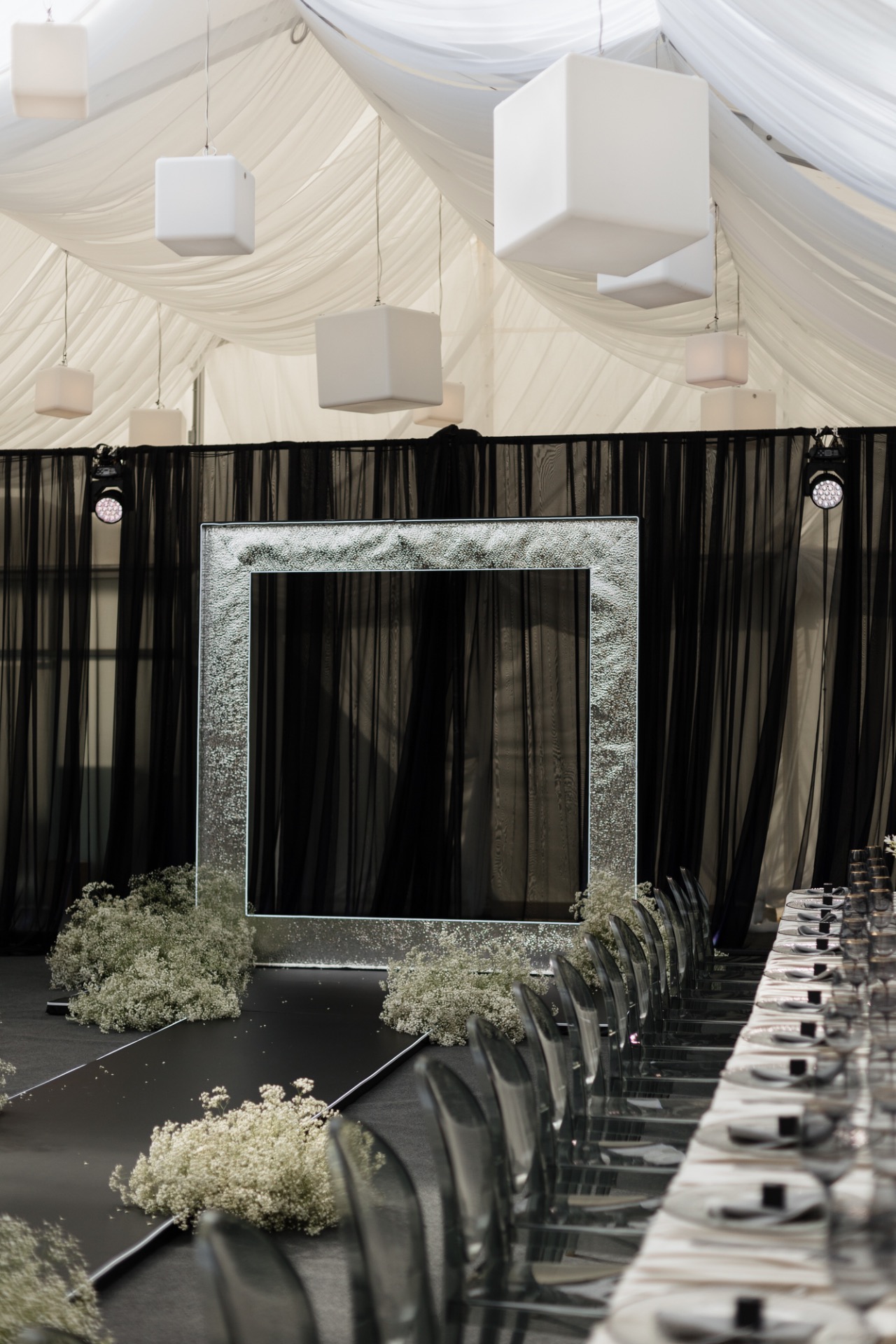 В декор мы заложили идею куба как символа передвижения в пространстве. Квадратные формы сопровождали всё мероприятие: квадратная арка, квадратный экран, карточки рассадки в виде кубиков с именем. Мы хотели создать атмосферу передвижения во времени, бесконечности эха. И у нас получилось воплотить нашу идею не только с помощью звука, но и благодаря игре формами и светом.