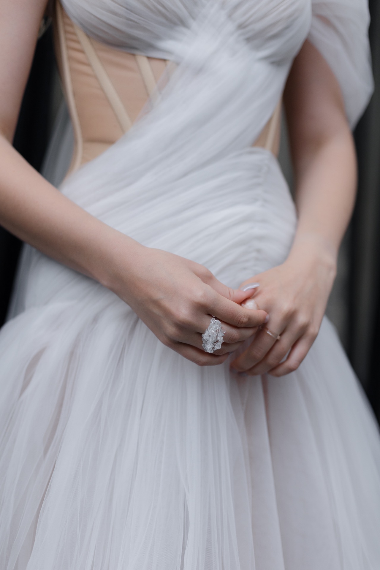 В дополнение к нему мы подобрали особые детали. Для меня создали прозрачное невесомое колье, а также кольца, которые выглядели словно капли росы.