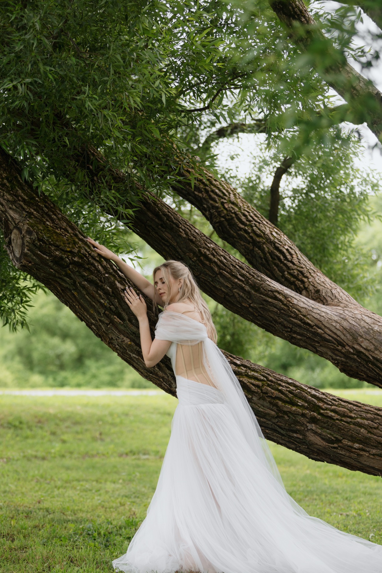 Мы определились финально с концепцией платья и дальше выбирали ткань, форму корсета и прочие детали. Платье получилось невероятно лёгким и воздушным, как я мечтала. Заниженный корсет и стильные драпировки создавали вау-эффект.