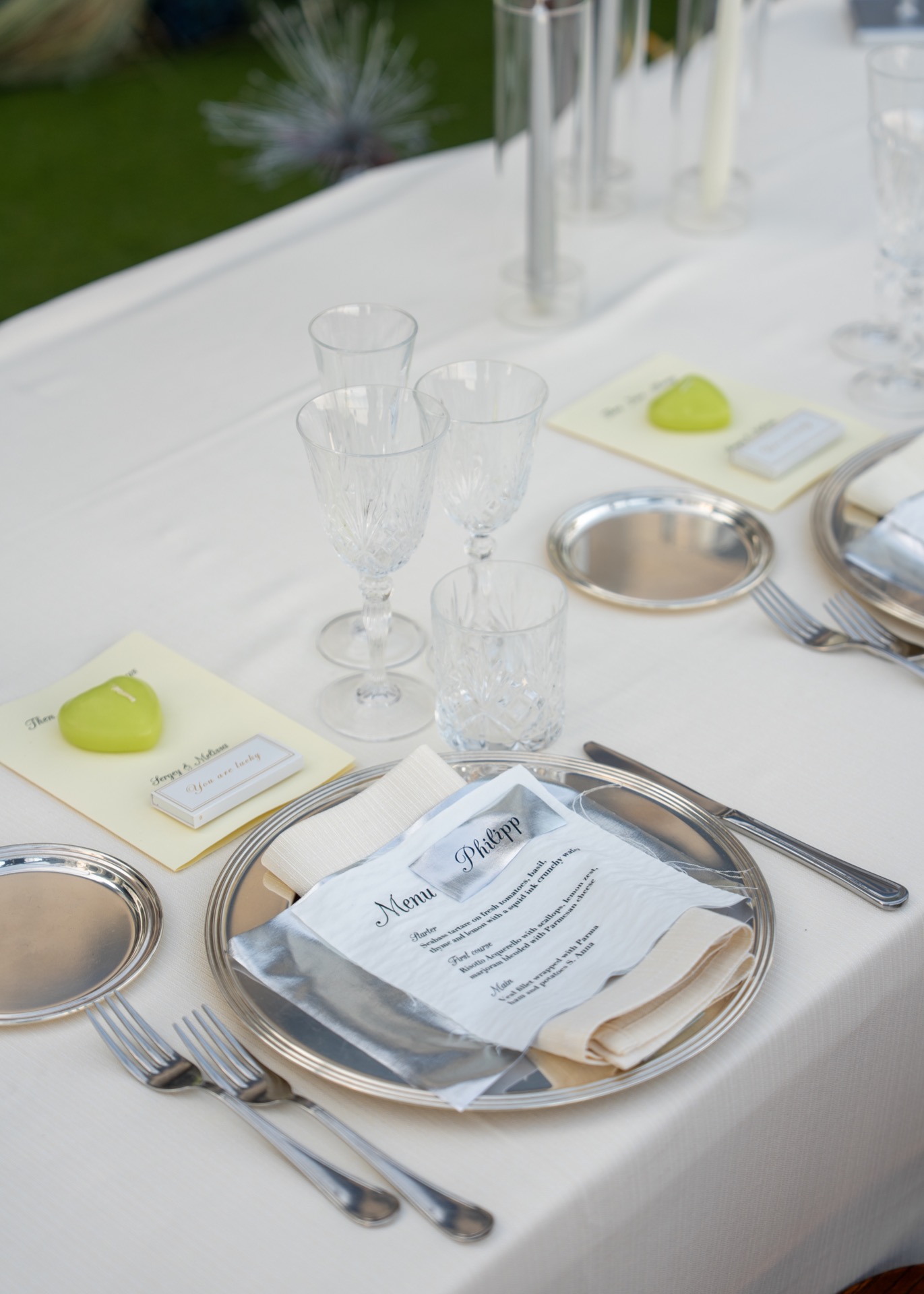 Вместо карточек рассадки мы сделали персональное меню, напечатав его на ткани с именем каждого гостя. А подарками для приглашённых стали персонализированные стикеры, свечи в форме сердца и коробочки со спичками, чтобы каждый мог зажечь своё пламя.
