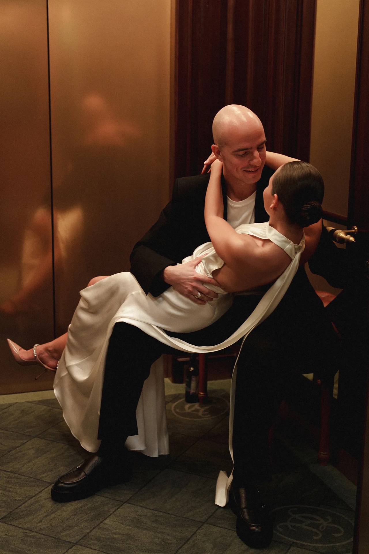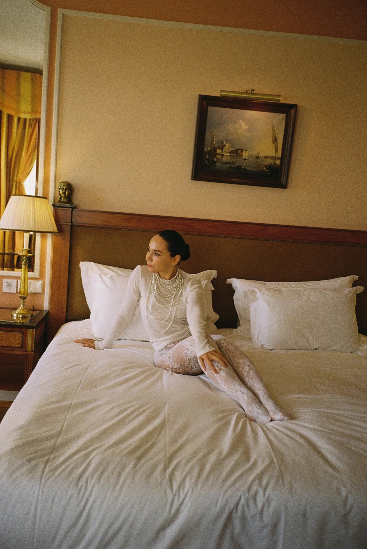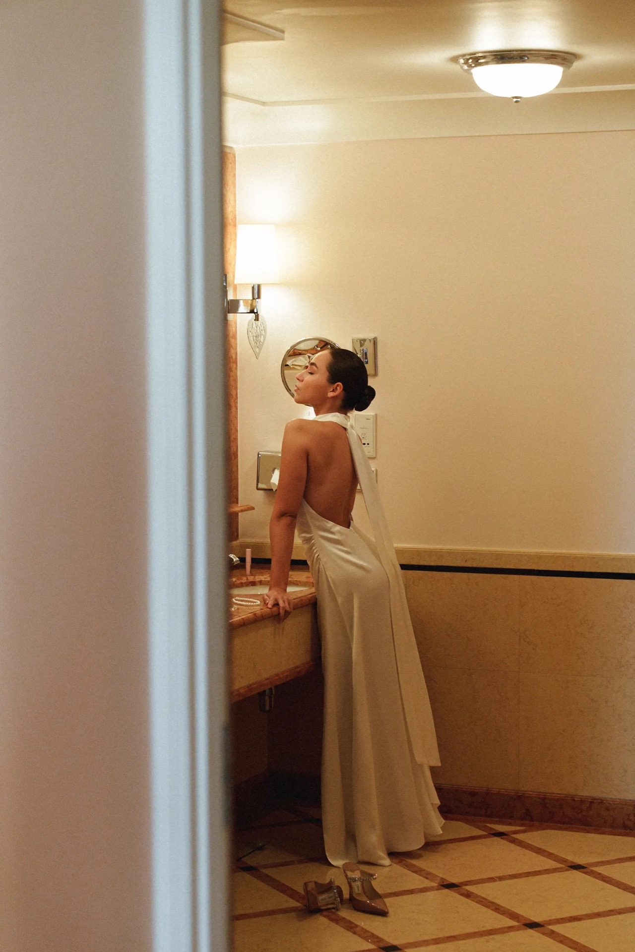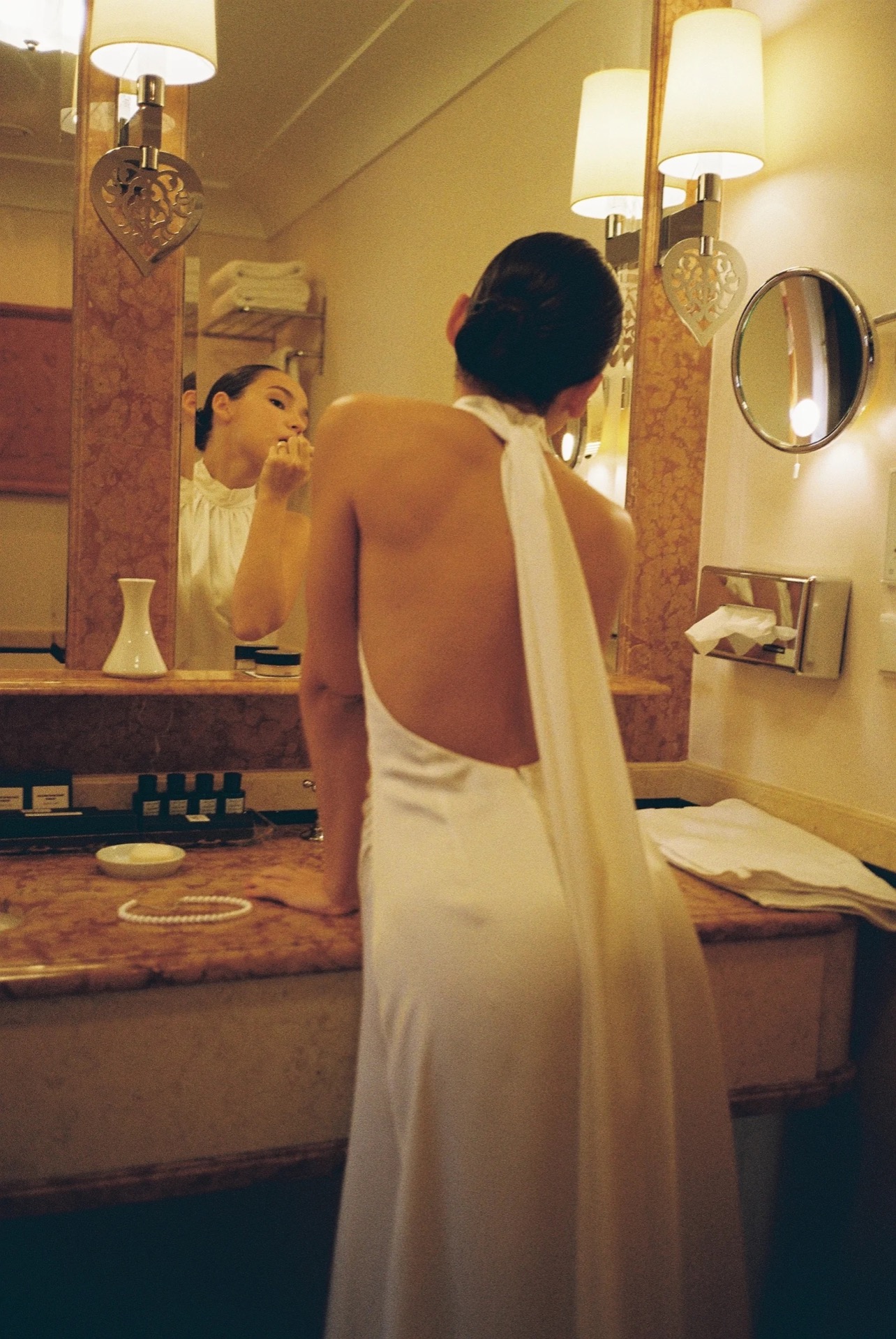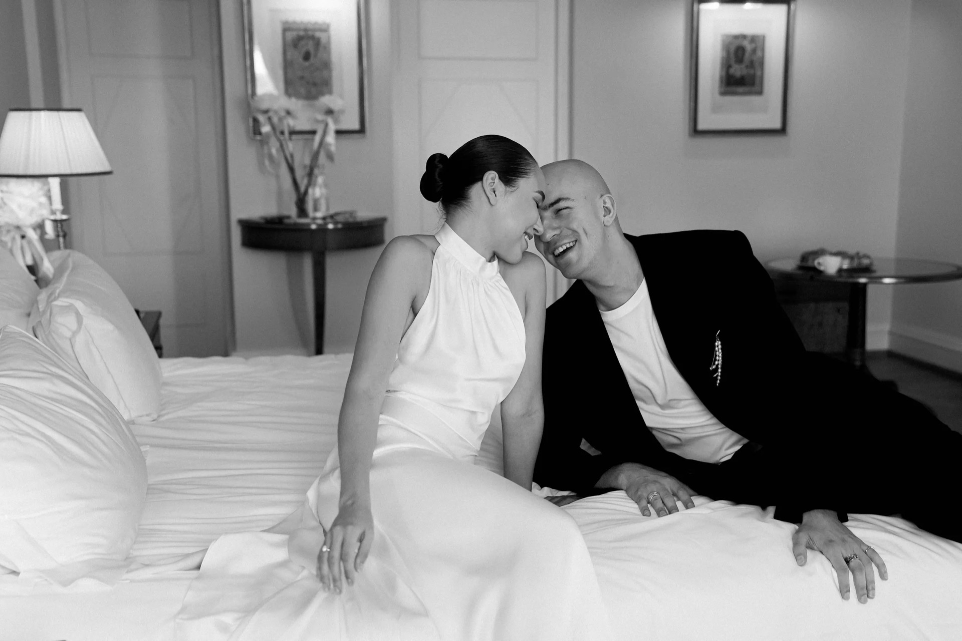 Изначально для себя я планировала два образа, но в итоге их оказалось три: шелковое платье с открытой спиной на утро в отеле, основной тотал-кружевной наряд с фатой и лаконичное платье из плотного атласа на вечер.