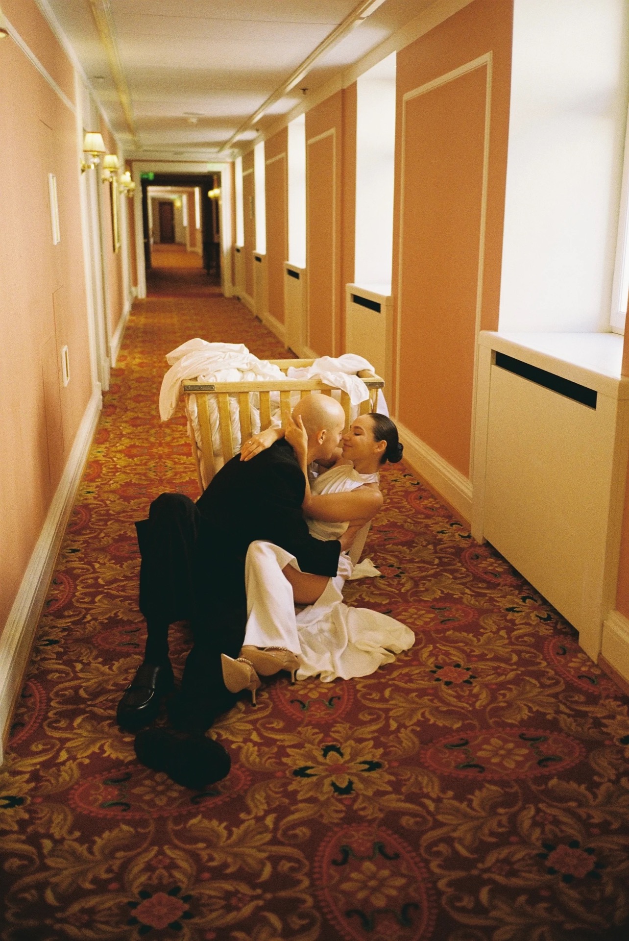 С нарядом Вовы всё было гораздо проще. В первый же заход в ЦУМ мы нашли идеальный костюм: пиджак оверсайз, брюки немного клёш, а брошь ручной работы с барочным и речным жемчугом перекликалась с моими вышивками на платье и украшениями.