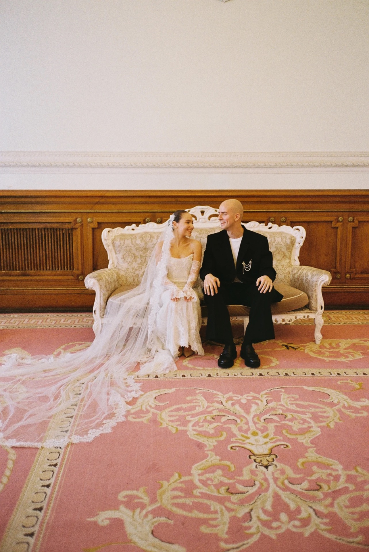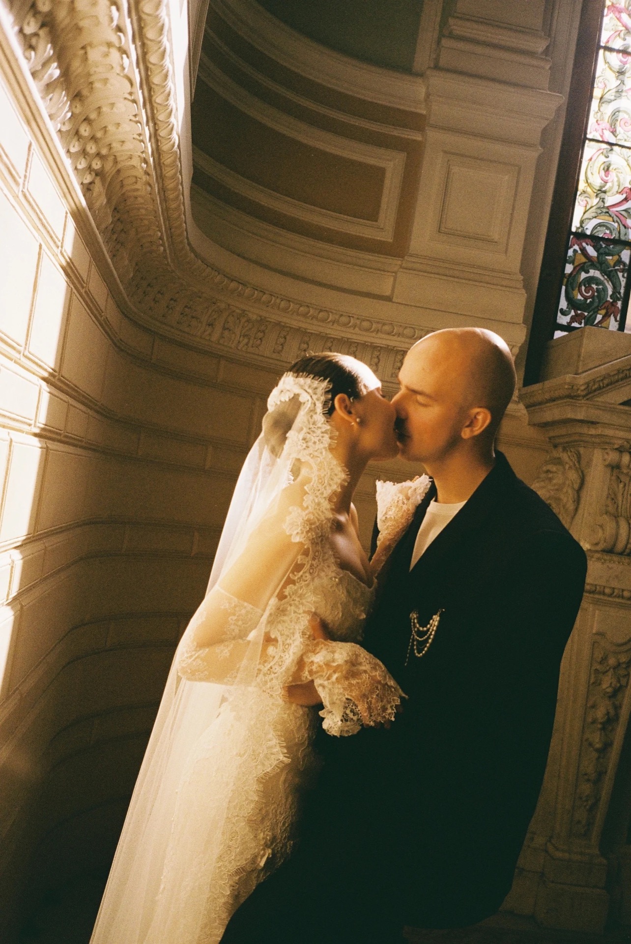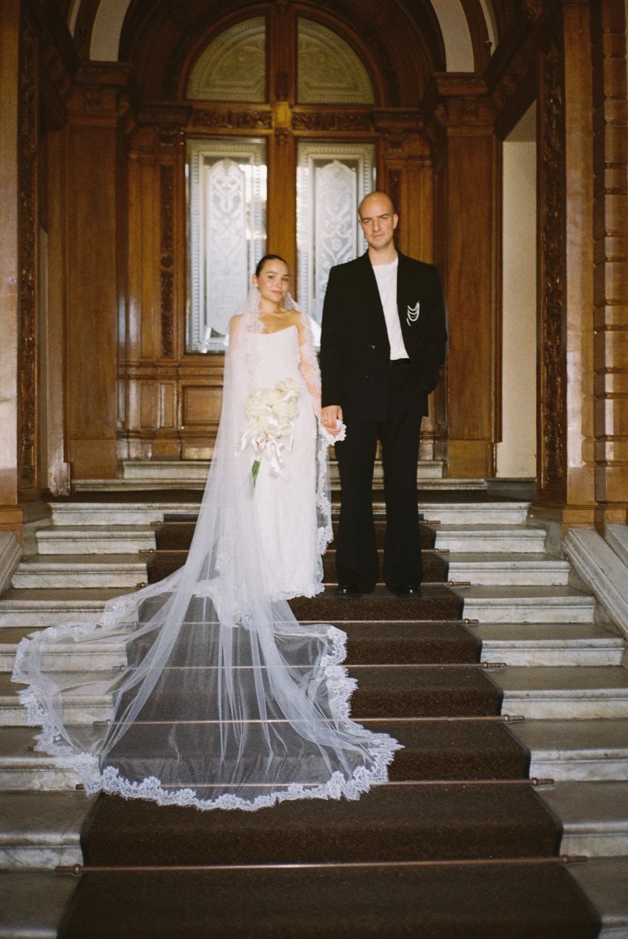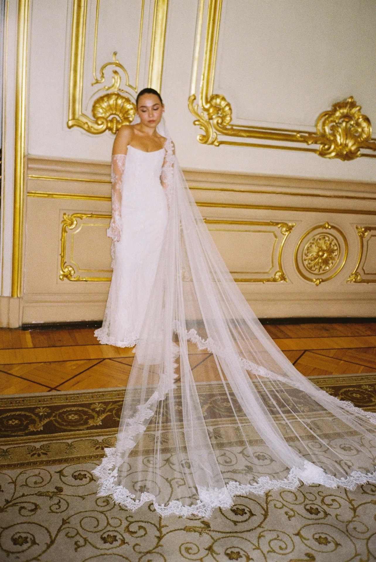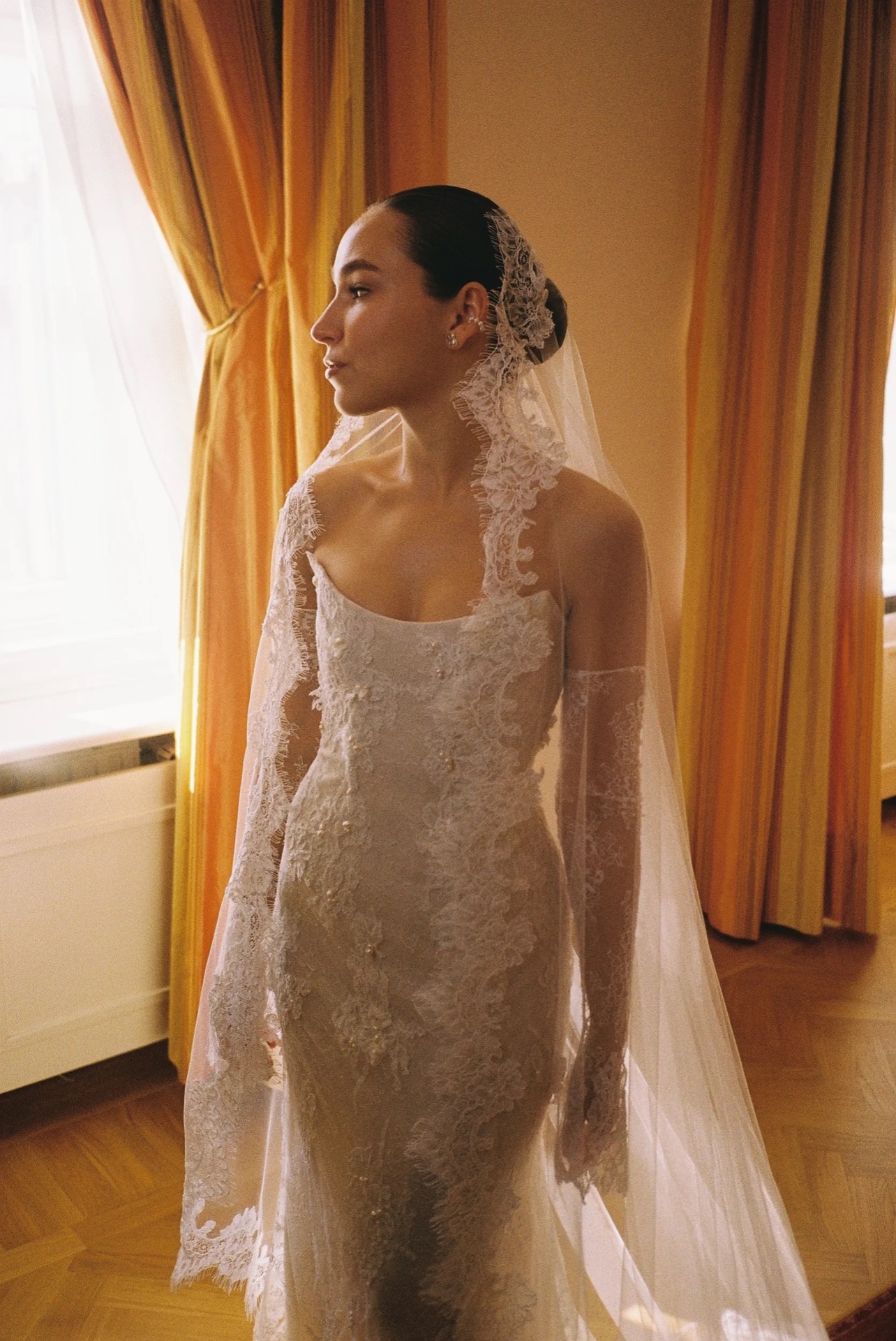 В ходе долгих обсуждений мы нашли решение: на основе кружевной полупрозрачной модели «Мойра» с митенками из её коллекции мы создали моё идеальное платье — два слоя кружева, чей узор укладывался по моей фигуре, нежнейшие детали ручной вышивки, натуральный жемчуг. А фата-испанка, тянущаяся длинным шлейфом, стала последним штрихом моего образа.