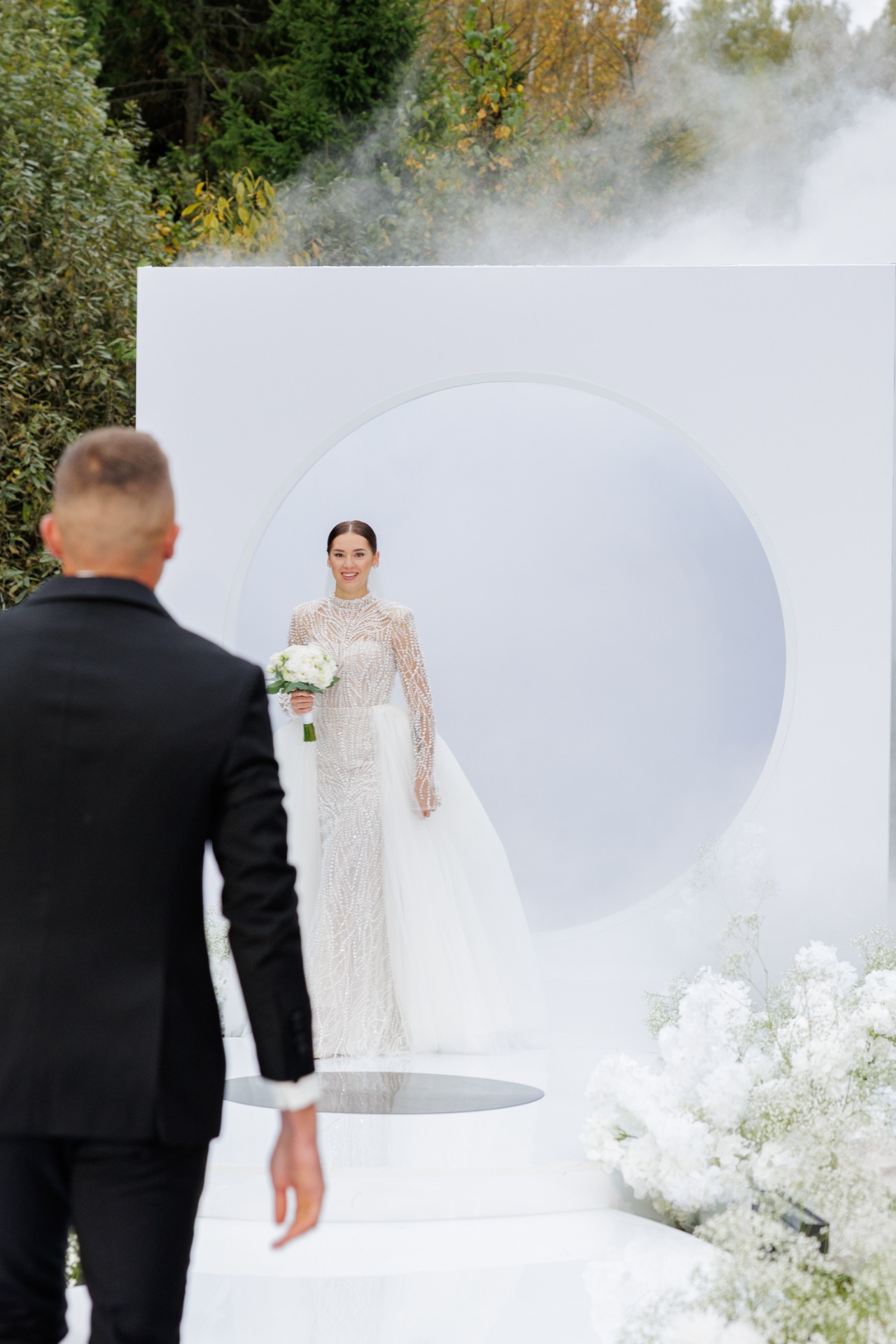 А моё платье стало настоящим произведением искусства — его создавали на заказ, и каждая деталь в нём была проработана с любовью и точностью. Оно было полностью вышито жемчугом, образующим узор зимних кристаллов — свет играл в каждом стежке, создавая эффект игры льда и свет. Платье идеально облегало фигуру, подчеркивая силуэт и сохраняя при этом удивительную лёгкость. Особенность образа — это пышная съёмная юбка, которая добавляла торжественности на церемонии. А когда началась вечеринка — юбку отстегнули, и я осталась в изящном приталенном платье, готовая к танцам и веселью.