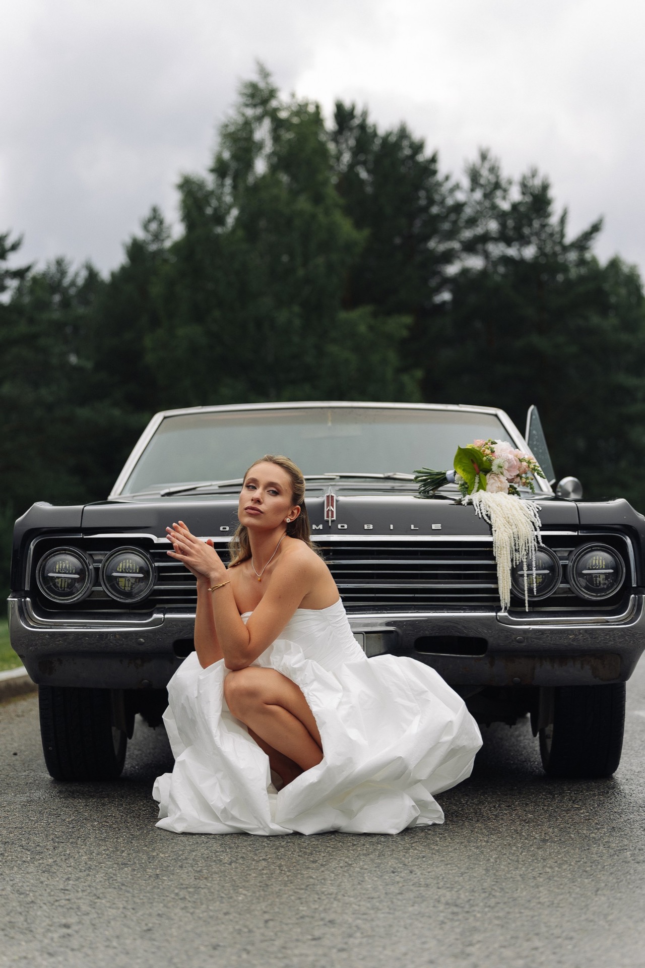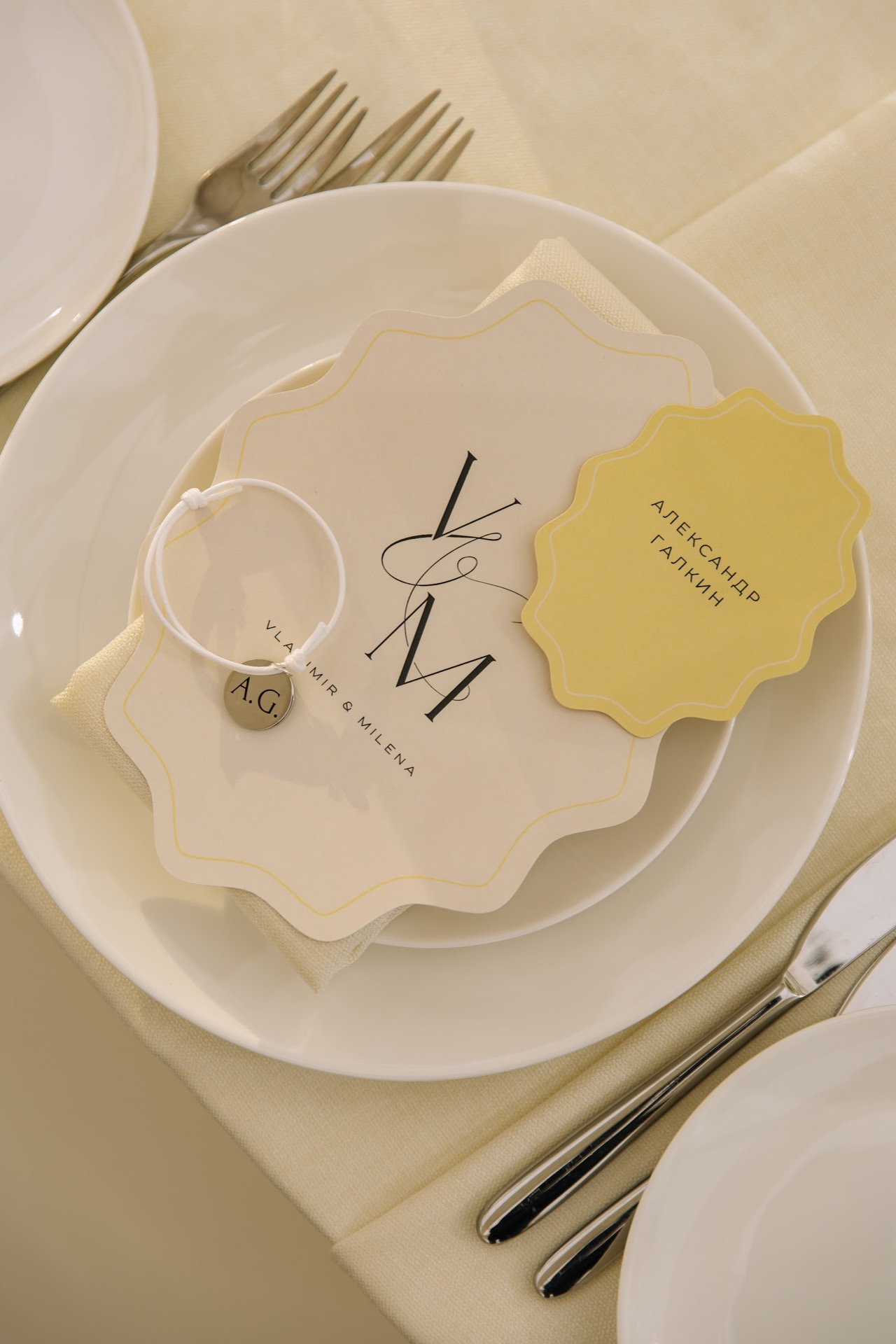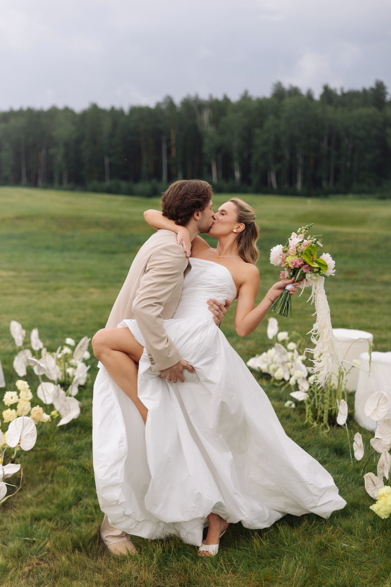 У нас работал бар: бармен разливал лимончелло и угощал джелато. Для каждого гостя был сделан индивидуальный браслет с гравировкой его инициалов. Мы устроили гастрономический ужин из шести подач, одной из которых был лимонный сорбет для освежения вкусовых рецепторов. Мы хотели передать итальянскую атмосферу, поэтому в качестве декора выбрали монохромное оформление с цветами и фуд-декором. Мне очень нравятся антуриумы, именно они украшали нашу зону церемонии. Из необычного — мы арендовали ретро-автомобиль и сделали церемонию прямо напротив него. Получилось безумно красиво!
