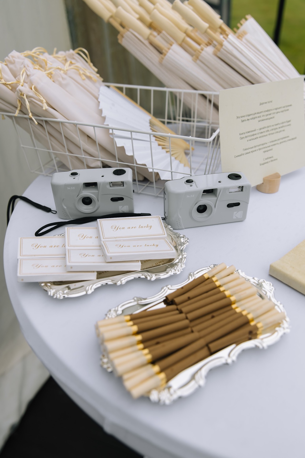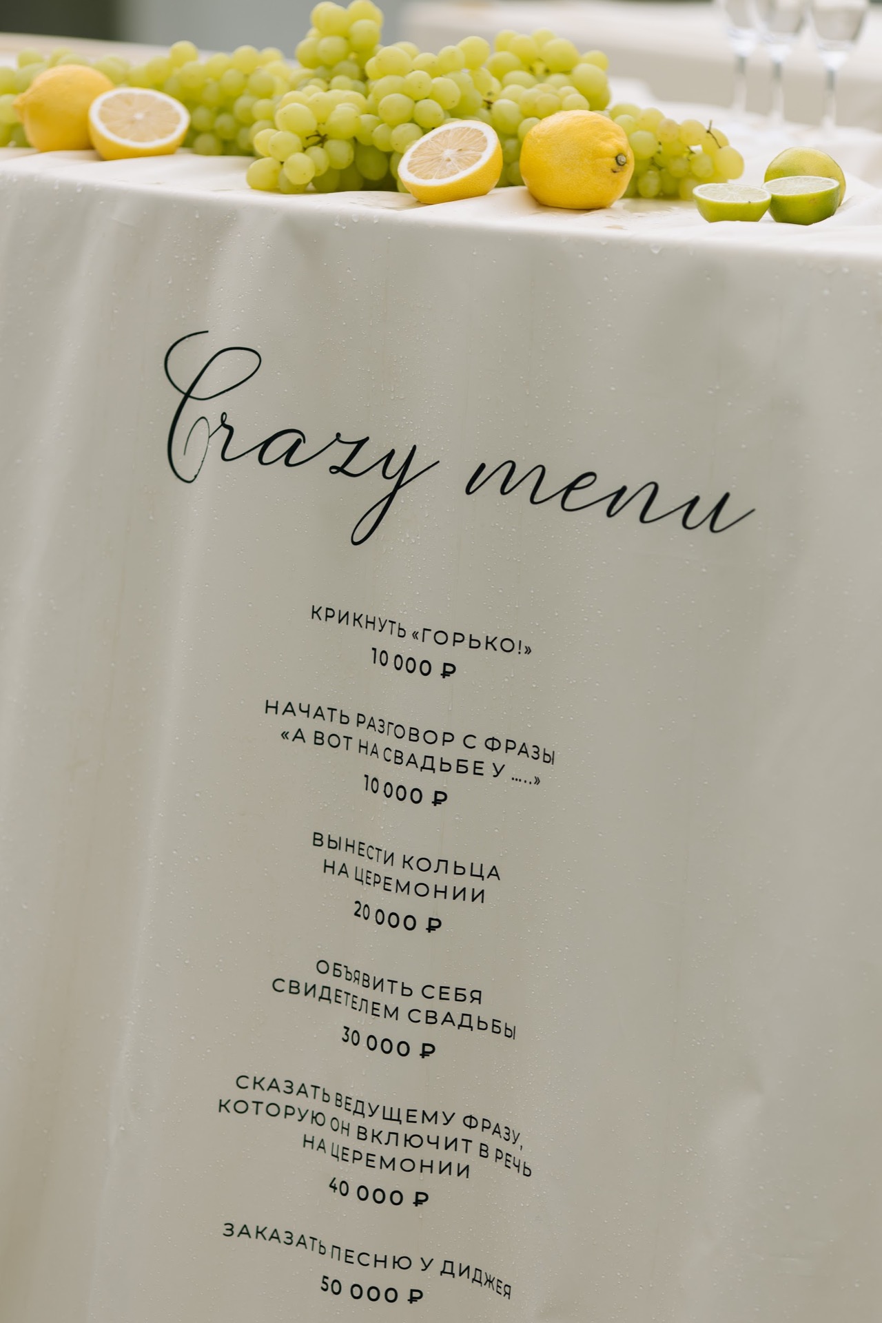 Из фишек — каждый гость получил именной браслет, в банкетном зале нас встречали, размахивая салфетками, для гостей мы сделали плёночные фотографии, а также зону с сигарами, книгой пожеланий и фотобудкой. Особенной идеей стали закуски, поданные на зеркалах, и съедобный декор.