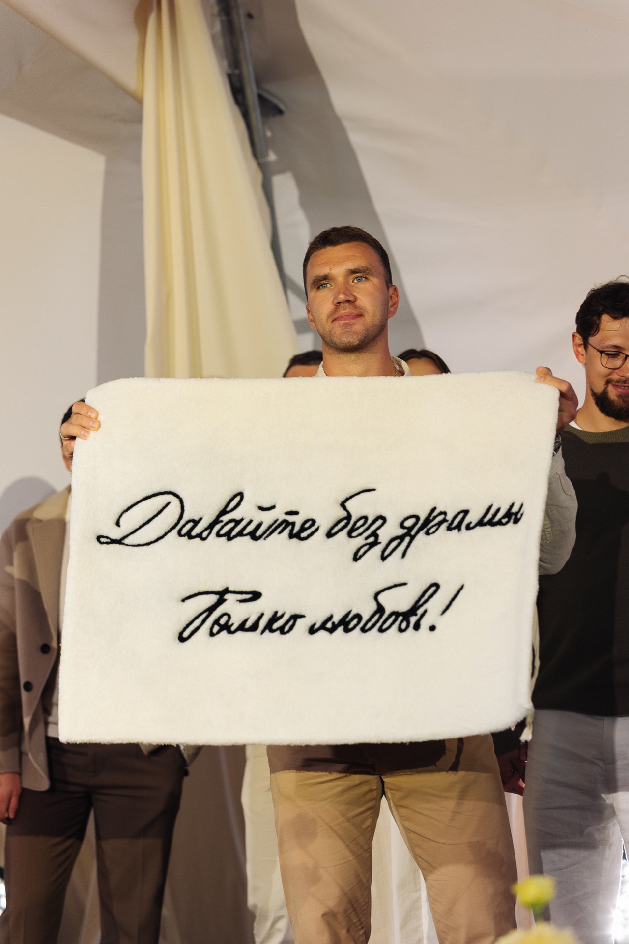 У Вовы был костюм песочного цвета свободного кроя, а на белой футболке была вышивка V+M с сердечком.