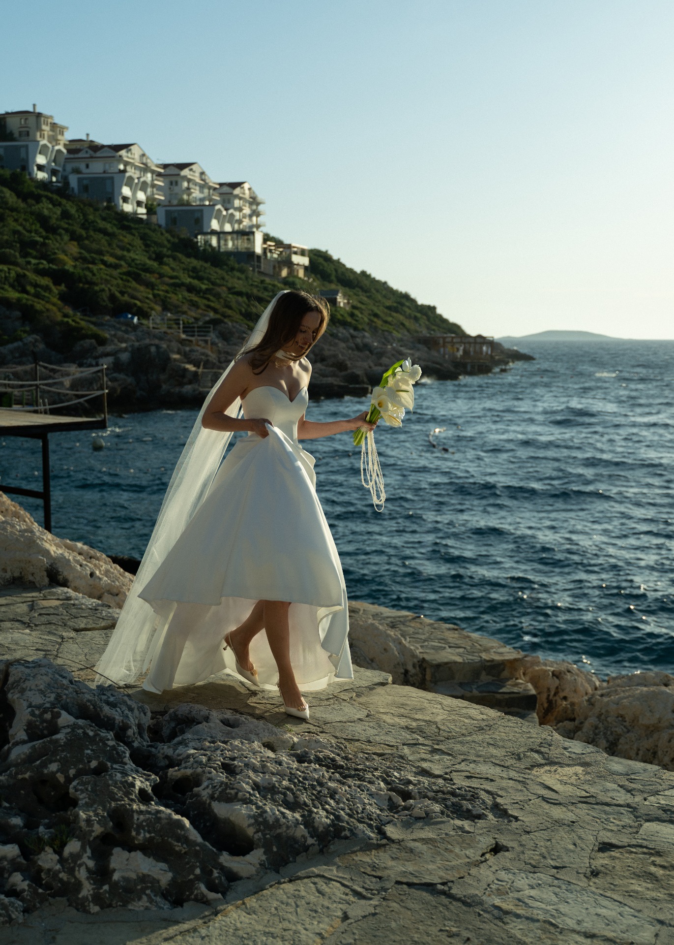 Церемония прошла у моря: волны били о скалы, облака зависли над горами, солнце заливало всё светом — лучшего декора придумать было невозможно. Помню свой выход, взгляд Юры, слёзы мамы и чувство сказки.