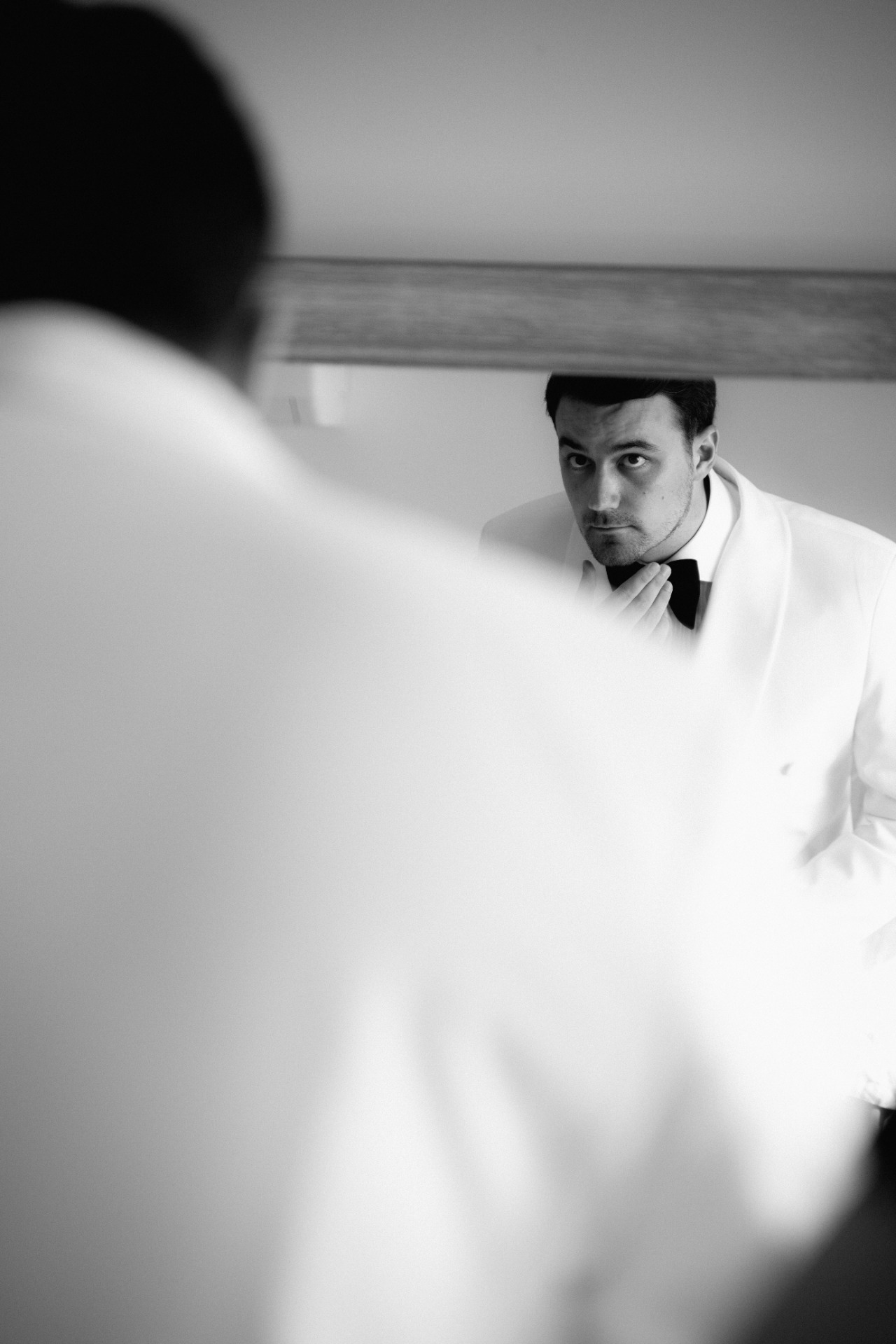 Образ Юры мы собирали в Анталии, но найти салон с достойным выбором в Турции было непросто. Сначала Юра хотел классический тёмный костюм, но «вау-эффекта» после примерки у нас не возникло. Спонтанно мы решили примерить белый смокинг с мыслью «ну а вдруг». И он оказался именно тем, что нам было нужно!