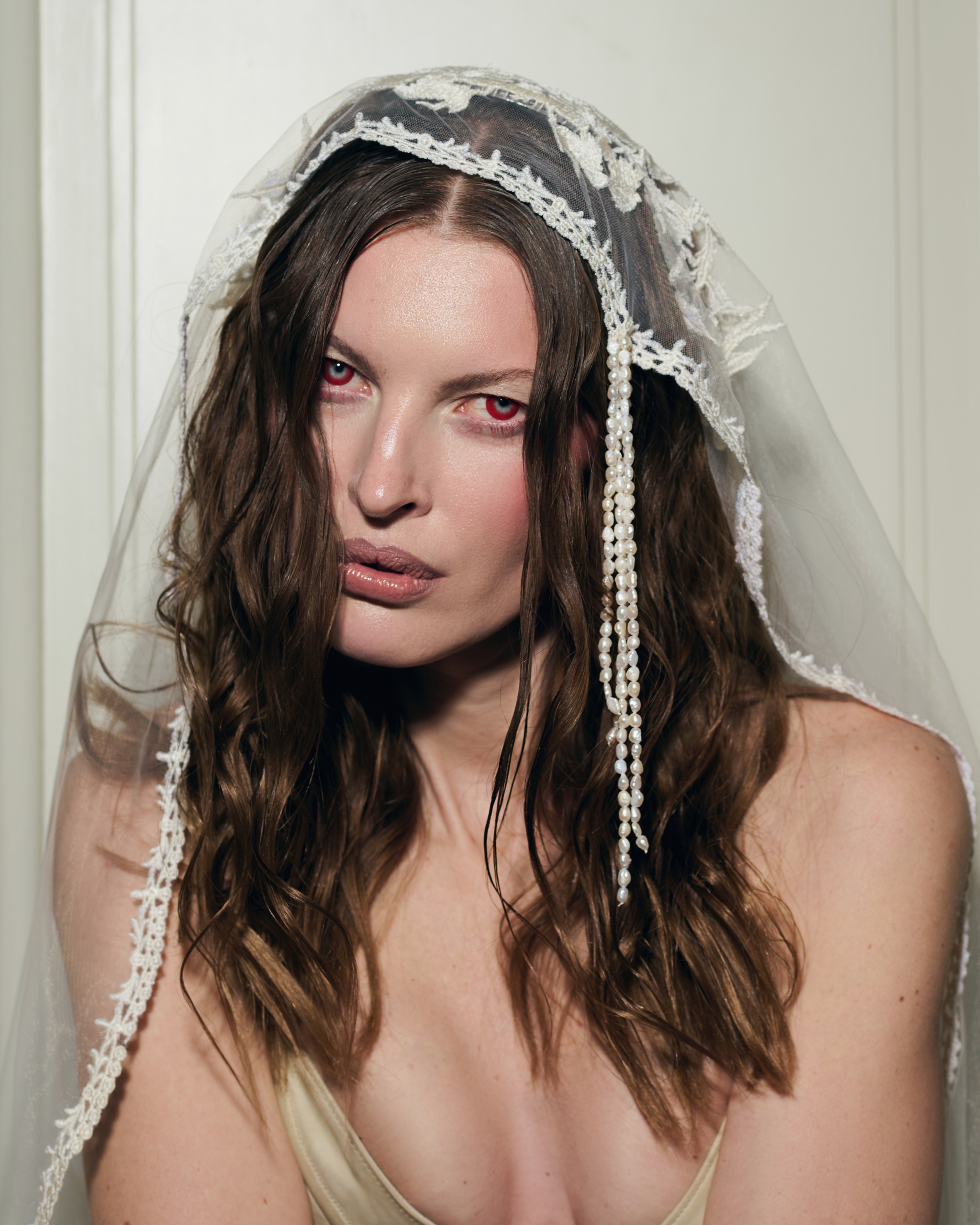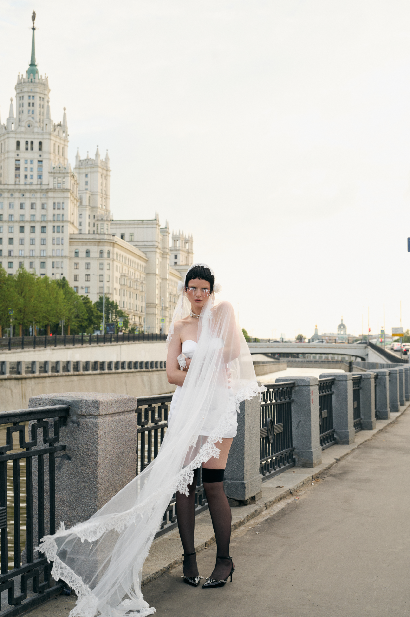 - «Хочу лёгкости с акцентом на открытую зону плеч и ключиц. Я больше про дерзость», — предлагаем короткую фату до плеч.