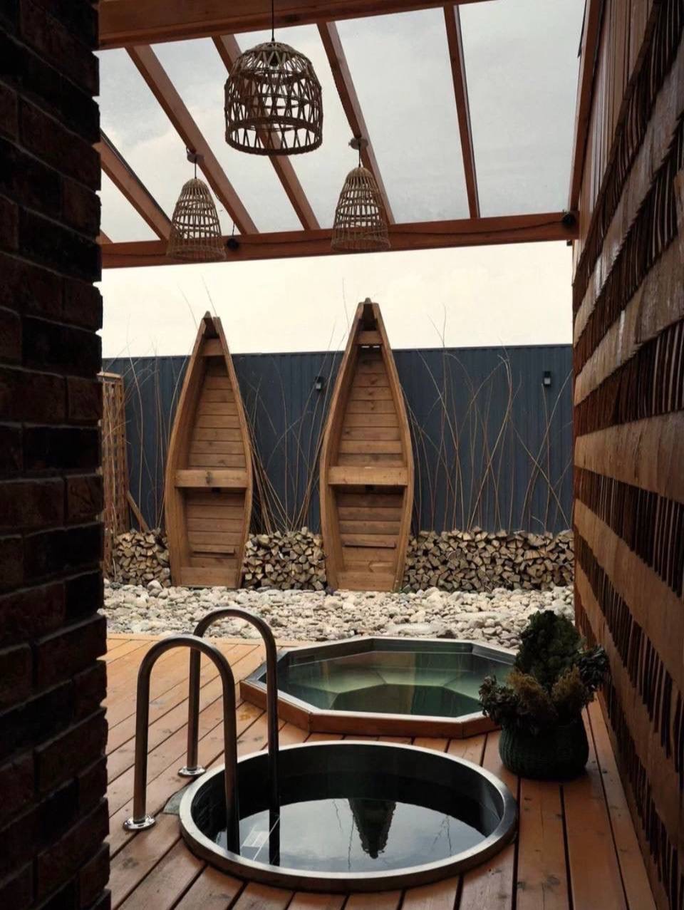 Все процедуры здесь созданы на основе ягод и трав, а после парения вас качают в лодках, поют фольклор и бьют в колокола. У комплекса есть две локации, в каждой из которых 5 бань с очень красивым и атмосферным интерьером, отсылающим к северной эстетике.