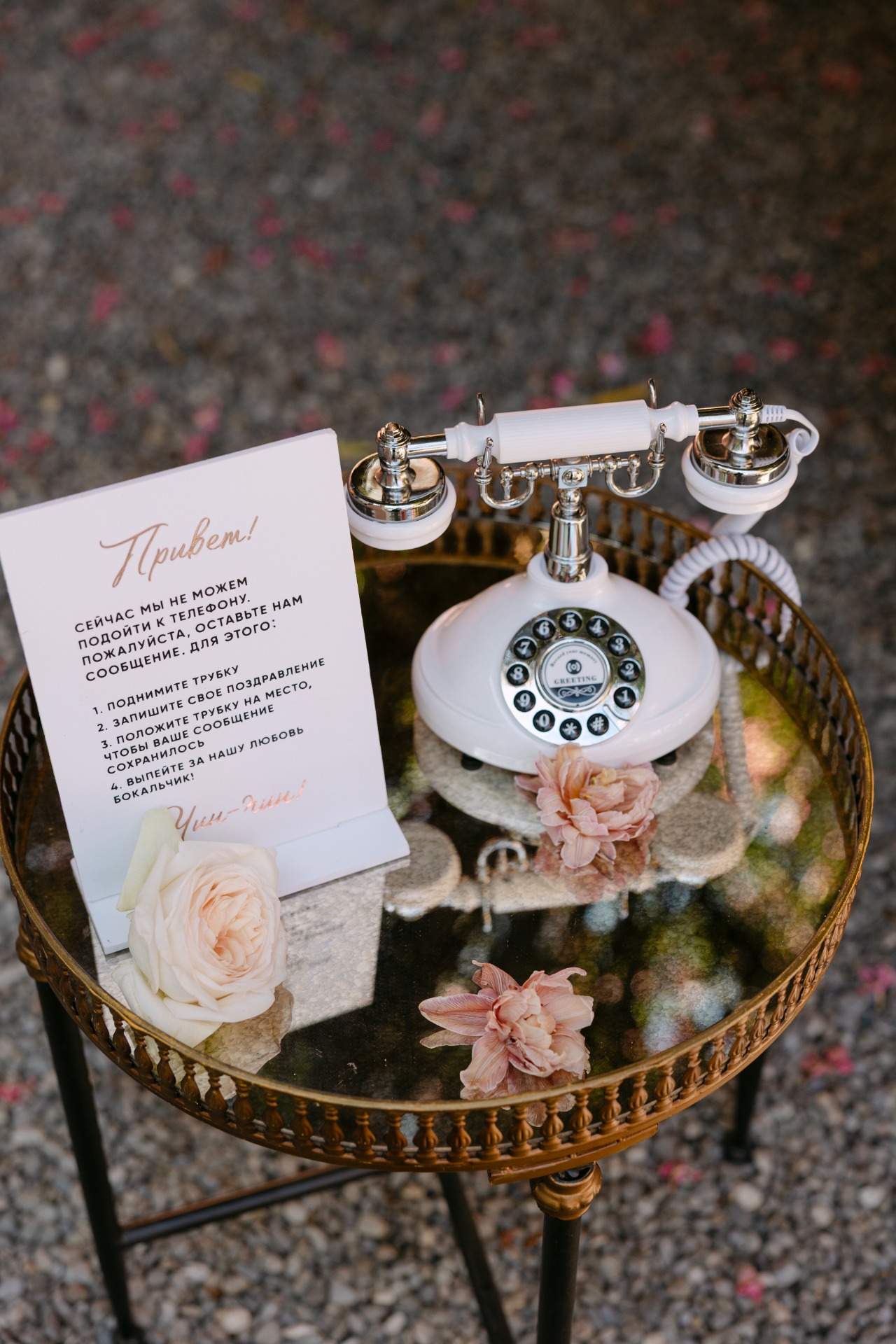 Для гостей из развлечений мы подготовили сабраж, плёночные и полароид-камеры с заданиями, телефон для аудиопожеланий, гостевую книгу и струнный оркестр. После фотосессии гости проводили нас на ретро-катер — наше символическое «свадебное путешествие», из которого мы вернулись к началу ужина.
