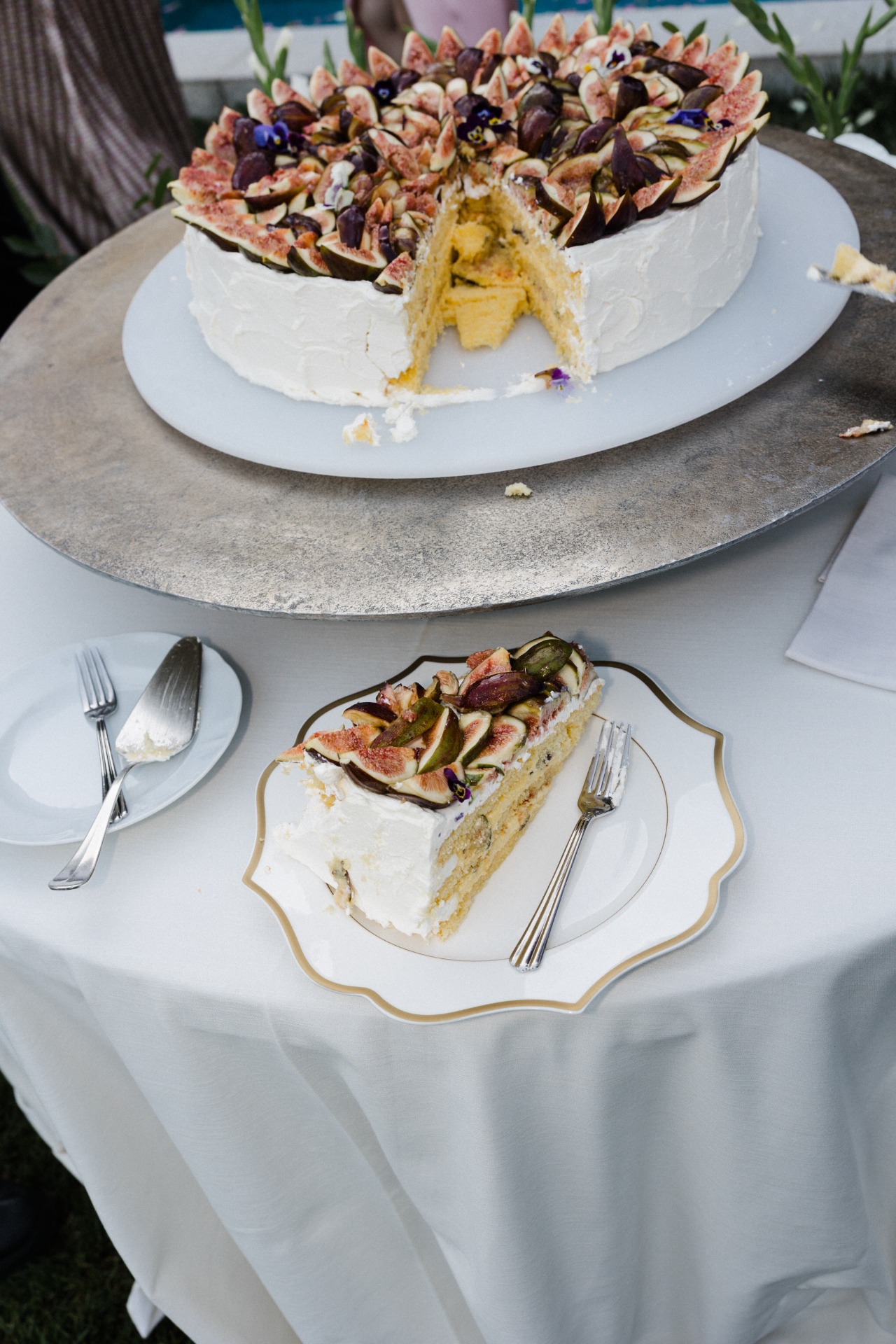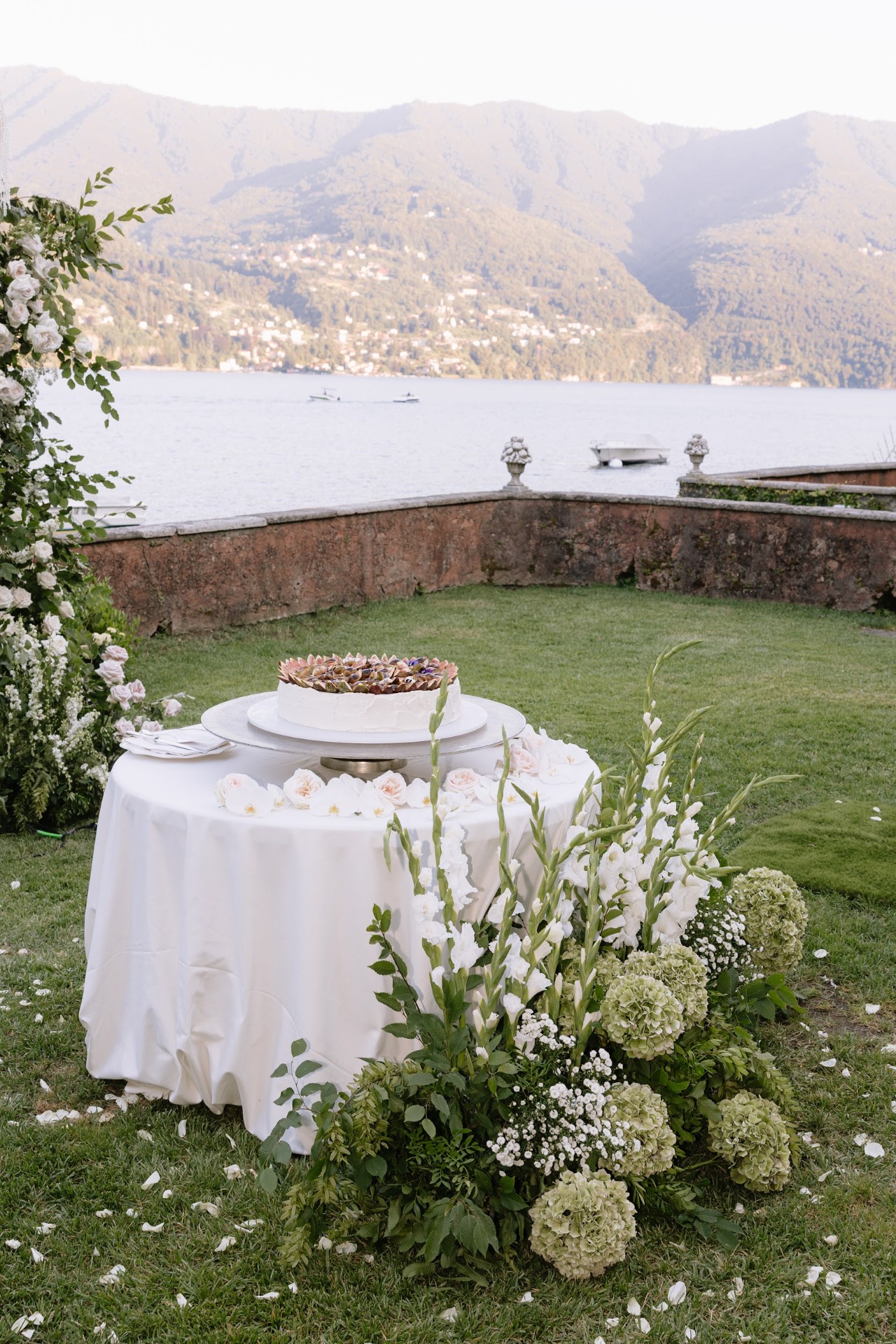 Концепцию мы выбрали под атмосферу Комо: old money — белые, зелёные и коричневые тона. Что-то я подсматривала на Pinterest, например, наш шикарный торт с инжиром.